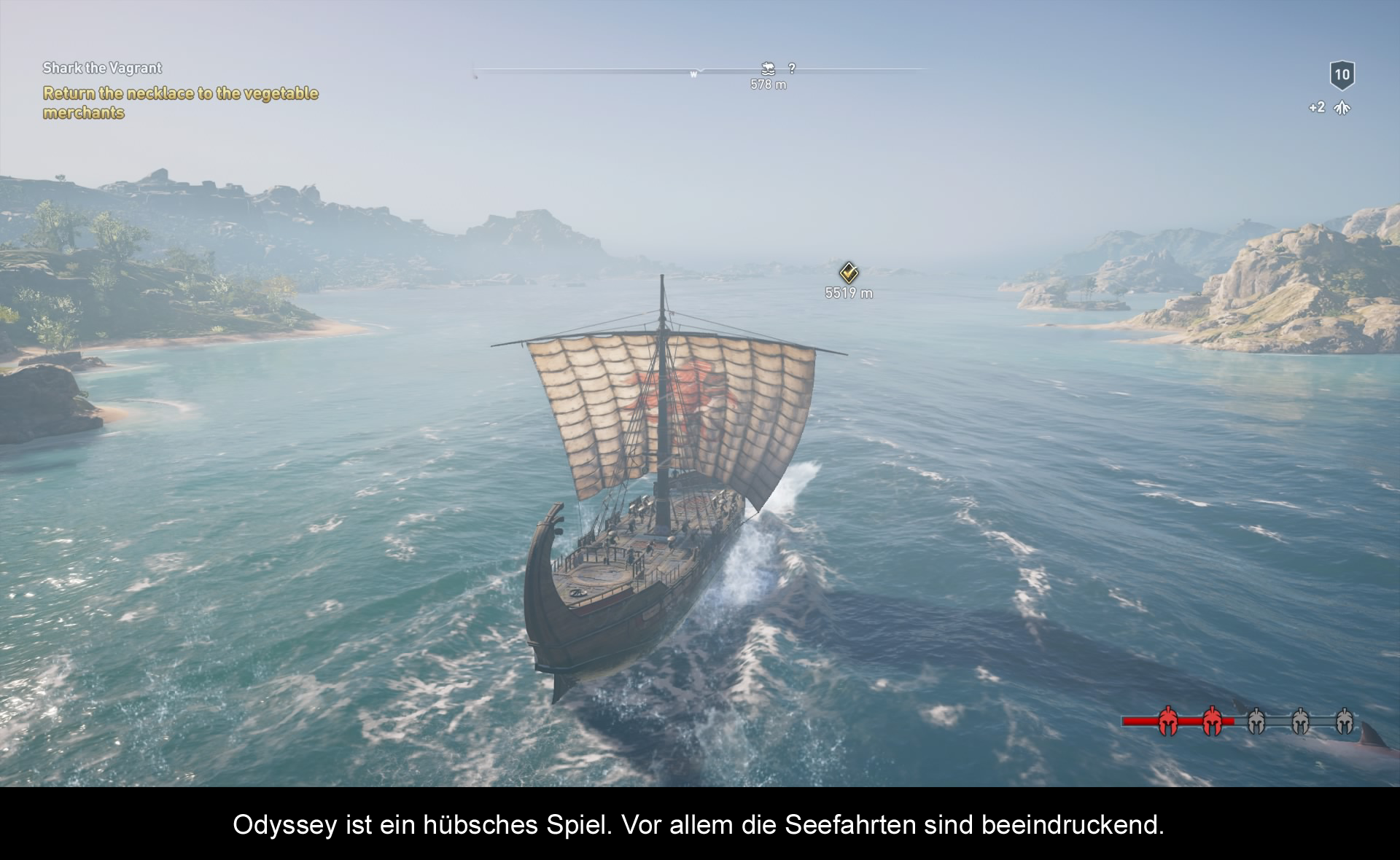 Ubi Softs Version des alten Griechenlands umfasst eine riesige Menge an Land und Meer. Überall wo man hinsieht trifft man auf die serientypischen Fragezeichen, die auf Quests, Schätze oder andere Missionen hinweisen. Zum Preis von 60 Euro bekommt man einiges geboten. Vielleicht zu viel? Auffällig ist der fordernde Schwierigkeitsgrad. Selbst auf „Einfach“ kann man schnell unter die Räder kommen, sofern man Parieren und Wegrollen ignoriert. Aus diesem Grund ist es empfehlenswert seinen Charakter möglichst regelmäßig aufzuwerten. Wie auch im Vorjahr bietet Ubi Soft erneut einen EXP-Beschleuniger für 10 Euro an, über den sich viele Gamer kurz nach dem Release aufgeregt haben. Während dieser Booster einem definitiv einen guten Headstart gibt, muss ich dennoch sagen, dass ich selbst ohne zu keiner Zeit Probleme mit dem Spiel hatte. Man muss halt wissen, wann man mit seinen Gegnern mithalten kann, oder wann man besser abhauen sollte. Dialogoptionen und haufenweise Quests zeigen, dass die Entwickler viel von CD Projekt Red gelernt haben. Und während Quantität definitiv erreicht wurde, bleibt zu hoffen, dass man beim nächsten Teil noch etwas mehr auf Qualität beim Side-Content achtet. In Sachen Umfang bieten Origins als auch Odyssey ein umfangreiches Paket mit zahlreichen Höhen und Tiefen. Dennoch bin ich der Meinung, dass Ubis nächstes Abenteuer etwas geradliniger und ausgereifter sein sollte. In Sachen Missionen hat das Spiel durchaus einiges zu bieten – sofern man nichts dagegen hat, sich durch unzählige Fetch-Quests zu kämpfen. Abwechslung bieten wenigstens die beeindruckenden Seeschlachten, die man noch aus Black Flag kennt. Hier bietet einem das Spiel nicht nur die Möglichkeit, das Schiff nach und nach zu verbessern, sondern auch mit neuen Team-Mitgliedern auszustatten, die euch dann bei der Eroberung Griechenlands unterstützen. Und auch Ubi Softs Variante des „Nemesis-System“ weiß zu gefallen. Je nachdem wie man sich durch das Land metzelt, wird man auf Verlauf seines Abenteuers auf Söldner treffen, die es auf euch abgesehen haben. Vermisst habe ich hierbei lediglich ein Hauch von Charme. Coole Sprüche oder eine Anbindung zur Story haben diese Gegner meist nicht.