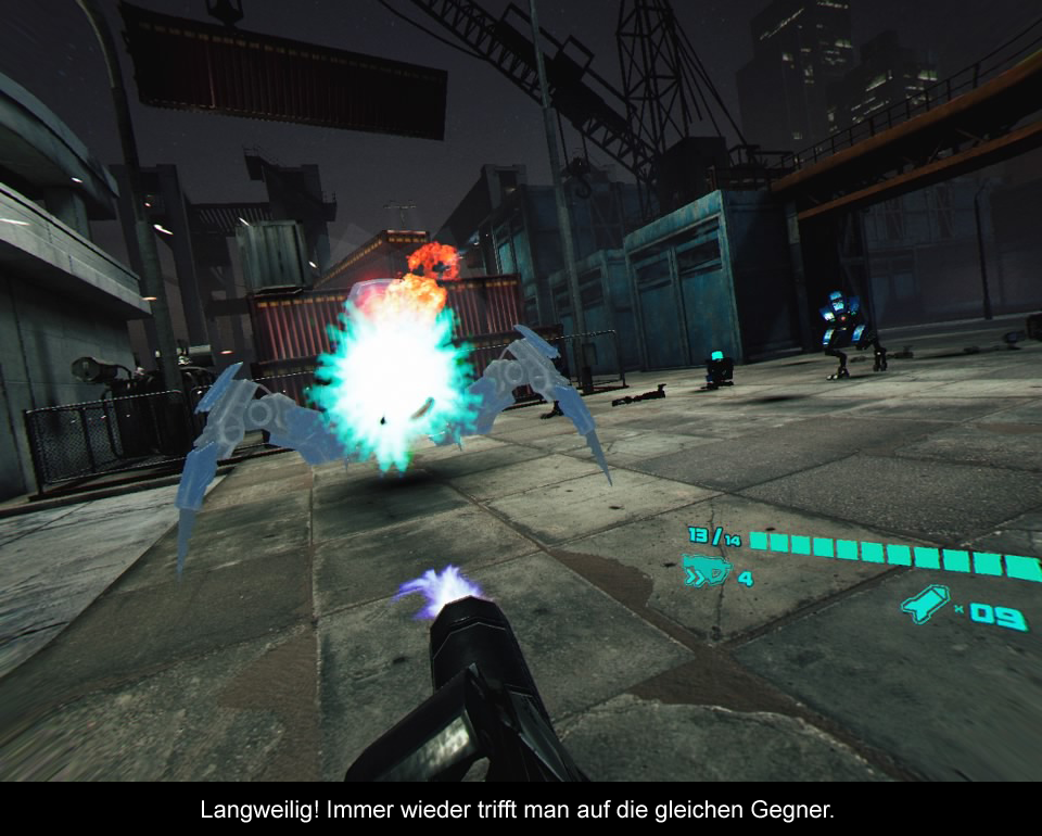Was die Grafik angeht, erinnerte mich Drone Striker ein wenig an die guten alten PS2 Zeiten. Während das virtuelle Bild im Headset immerhin recht scharf rüber kam, enttäuschten Umgebungen und Gegner mit niedrig aufgelösten Texturen. Zwar hatte man sich beim Gegner-Design für sogenannte Mecha-Insektoiden entschieden, die zwar in Theorie eigentlich ganz cool klingen, aber am Ende optisch doch nur enttäuschten. Und obwohl das Spiel mit Unreal 4 entwickelt wurde, ist es alles in allem wahrlich kein Hingucker. Und auch der Sound hat nichts Besonderes zu bieten, und erfüllt lediglich seinen Job.