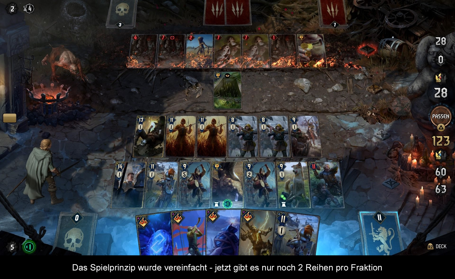Wie in anderen Kartenspielen baut man erst einmal sein Deck zusammen oder nimmt ein Vorgefertigtes. Davon zieht man zehn Karten am Anfang, mit der Möglichkeit einige noch zu tauschen. Das Spielbrett unterteilt sich in zwei Hälften mit jeweils zwei Reihen. Hier wurde der Aufbau gegenüber dem Original bzw. der Beta vereinfacht. Ein Spiel geht über drei Runden, wer zwei Runden an Hand der Kampfstärke gewinnt, siegt auch im Duell. Mittels einem vorher bestimmten Anführer kann man zusätzlich noch diverse Spezialfertigkeiten ausspielen. Wichtig ist vor allem, dass man ein kompaktes Deck besitzt und weiß, wie sich die Karten miteinander verhalten bzw. beeinflussen. Egal ob über Spezial-Aktionen oder mittels Statuseffekten. Hierzu gibt es zwar ein kleines Tutorial in „Thronebreaker“, aber ich empfehle euch, dass eigenständige „Gwent“ auszuprobieren, denn dort werden die Grundlagen weitaus ausführlicher erläutert. Auch sollte man immer im Auge behalten, gegen welche Fraktion man antritt, Nilfgaard, Monster oder Scoia`tael – alle haben Stärken und Schwächen. Insgesamt ist das neue Gwent um einiges komplexer als das originale „Gwint“ aus „The Witcher 3“, jedoch auch nicht mehr so undurchsichtig wie die ersten Versuche als eigenständiges Spiel. Der Reboot des Systems hat dem Spielspaß nicht geschadet. Und übrigens schaltet man auch starke Karten und Avatar-Rahmen in „Thronebreaker“ für „Gwent“ frei – was ein netter Bonus ist.