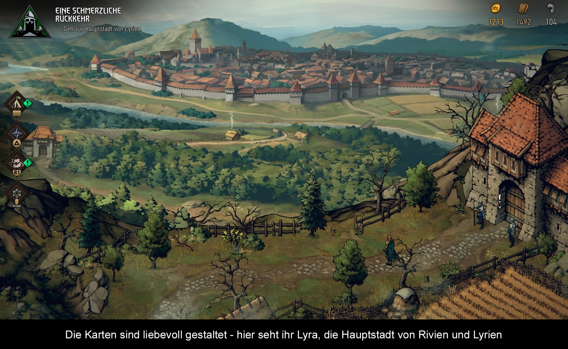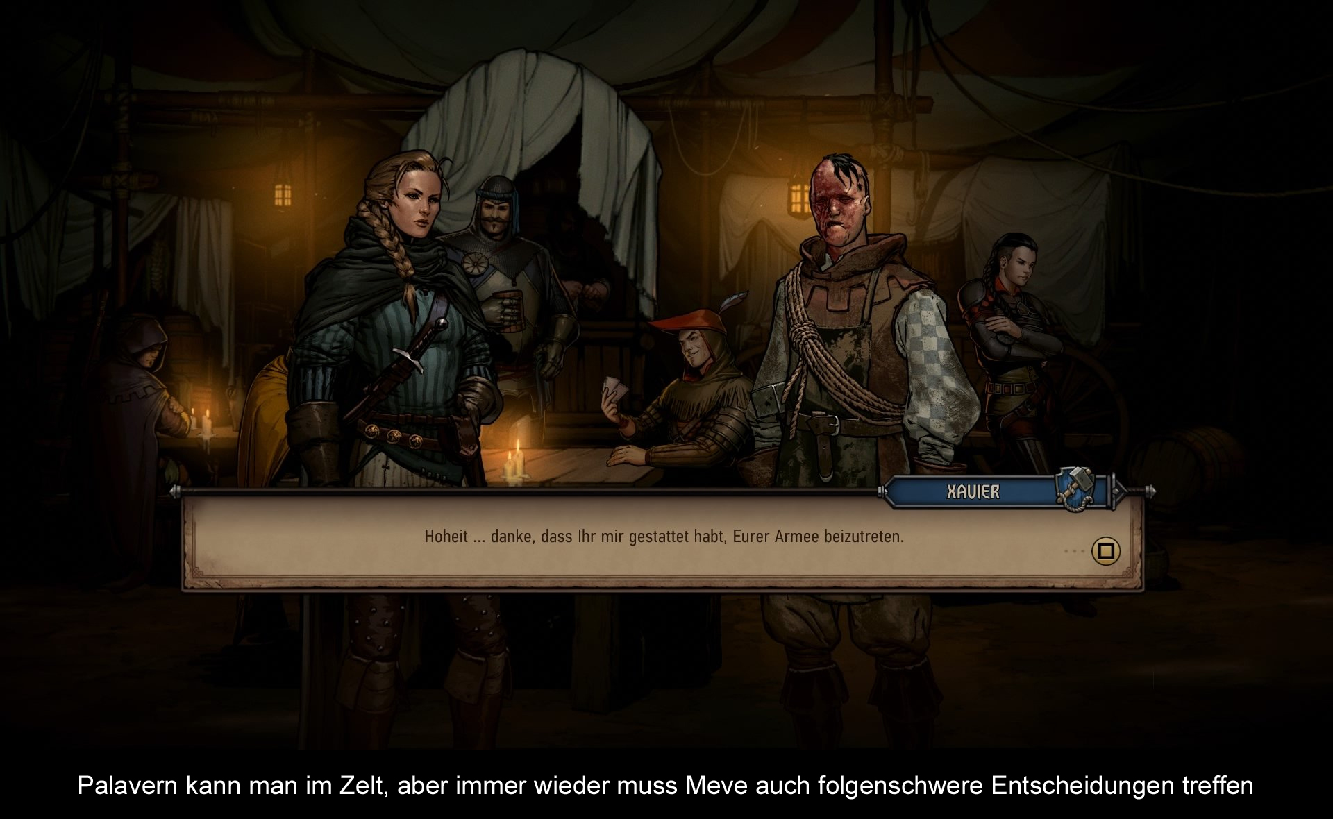 „Thronebreaker“ ist zwar grundsätzlich ein Kartenspiel, doch werden auch andere Aspekte in das Gameplay-Konzept verwoben. Zum Beispiel lenkt man aktiv die Figur der Königin über riesige Karten. Dabei trifft man Dorfbewohner und schwatzt mit ihnen, findet Vorräte und muss so manche schwierige Entscheidung treffen. Letztere bringen euch neue Ressourcen ein, oder steigern die Moral der Truppe – können aber auch genau das Gegenteil bewerkstelligen. Manchmal muss man eben aus zwei Übeln wählen. Diese Entscheidungen machen sich auch im Spiel bemerkbar. Man kann Schätze verpassen (oder Karten), man verliert treue Freunde, oder eben die Moral der Armee sinkt. Letztere wirkt sich direkt auf die Kartenstärke aus: Eine schlechte Moral bringt einen Negativbonus mit sich, während eine erstklassige Moral für bessere Stärkewerte sorgt. Mit den Materialien Holz, Gold und Rekruten, kann man sein Basiscamp aufwerten und darin neue Karten freischalten oder andere Boni bekommen. Im Bierzelt führt man dagegen ein paar Gespräche, um mehr über die Hintergründe der Bekanntschaften zu erfahren.