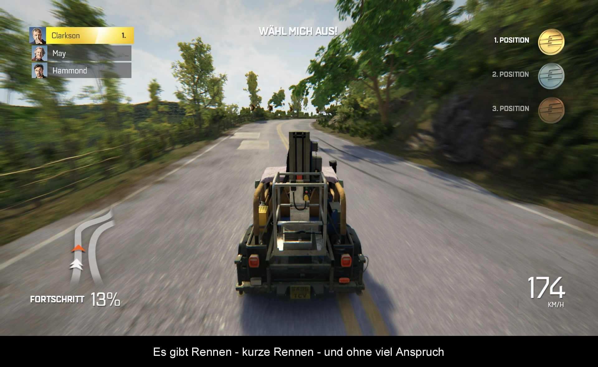 Zur Veröffentlichung stehen lediglich drei Episoden bereit (eine aus Staffel 1 und Staffel 2, sowie die erste Folge der dritten Staffel). Jede Episode bietet eine unterschiedliche Anzahl an – ich will es mal so formulieren – interaktiven Elementen. Eingerahmt sind in die kurzen Gameplay-Schnipsel von Videosequenzen aus der Show. Während die Idee ganz gut ist: Man schaut quasi eine Folge der Show, fallen aber auch die Unterschiede stark auf. Die Show ist durchweg hochwertig produziert, mit tollen Kameraeinstellungen und glänzenden Autos, während der Spiel-Anteil billig und dahingerotzt wirkt. Mittlerweile gibt es zwei weitere Episoden (wobei die Kolumbien Folgen zu einer Episode zusammengefasst wurden), bei denen sich aber kaum etwas Grundlegendes geändert hat. Viel schlimmer ist dagegen, dass man für den Jaguar XE Project 8 aus Folge 4 keine Videospiellizenz bekommen hat und im Gegenzug mit einem eingepackten Auto rumgurken darf. Dafür gibt’s beide Daumen nach unten!