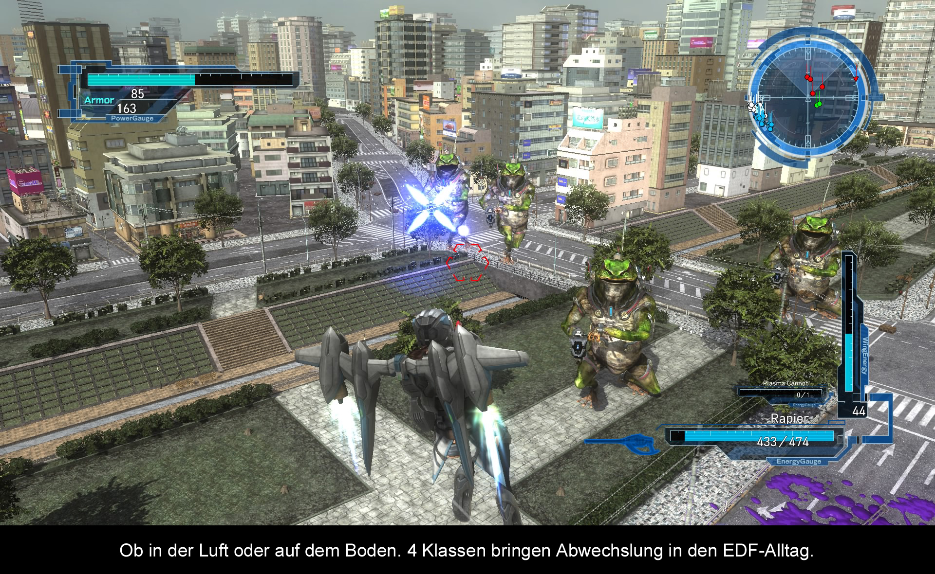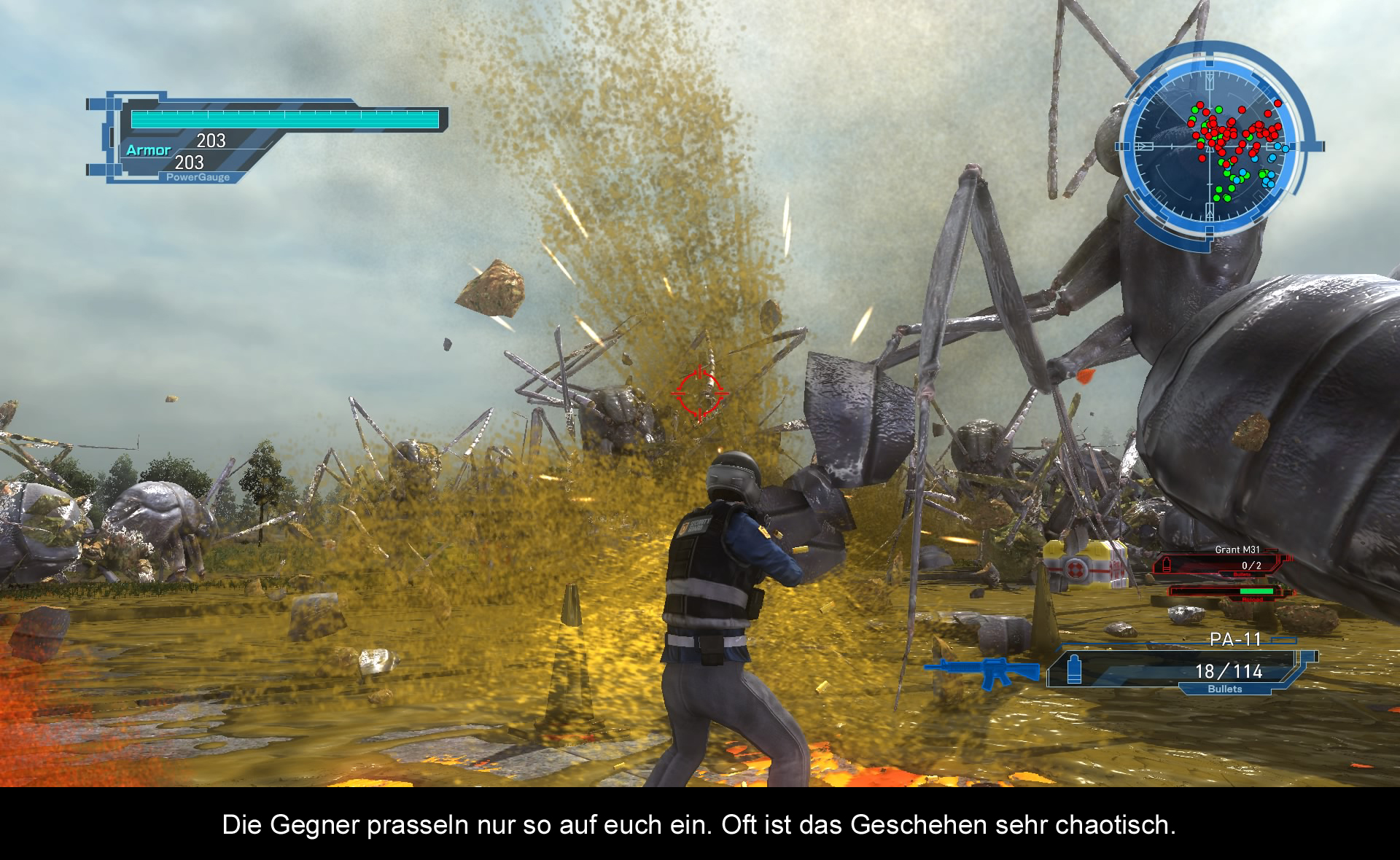 Das grundsätzliche Prinzip der Earth Defense Force Reihe hat sich im Laufe der letzten Jahrzehnte kaum verändert. Im Mittelpunkt steht immer noch der Kampf gegen riesige Ameisen und andere außerirdische Invasoren, die euch wellenartig und in riesigen Scharen attackieren. Man selber wird als unscheinbarer Zivilist in diesen Krieg gezogen. So beginnt das Spiel zunächst einmal mit einem Tutorial, welches innerhalb einer abgeriegelten Militärbasis stattfindet. Enge Gänge, und überschaubare Räume dienen als erster Vorgeschmack, um die wesentlichen Features des Spiels zu erlernen. Dazu gehört der Umgang mit dem Gewehr als auch mit dem Raketenwerfer, die eure treuen Weggefährten sein werden. Und schon das Tutorial zeigt worauf es am Ende ankommt: Ihr müsst nämlich Wellen an Wellen an Wellen an Gegner wegballern. Das Prinzip ist so simpel, wie es auch unterhaltsam ist. Dies liegt vor allem auch an den vielen Leveln, die im Laufe der Zeit immer größer und facettenreicher werden. So groß, dass man ab und zu sogar etwas die Orientierung verlieren kann. Dies liegt unter anderem auch am hektischen Kriegs-Alltag: Während eure Kameraden ihre letzten Schreie über das Mikro von sich geben, prasseln die Gegner nur so auf euch ein. Hier kann man leicht den Überblick verlieren. Vor allem, da sich die Gegneranzahl auf dem Bildschirm im Vergleich zu den letzten Teilen nochmals gesteigert hat. Die Monster mögen zwar nicht viel besser aussehen als früher, aber die schiere Menge ist durchaus gewaltig.