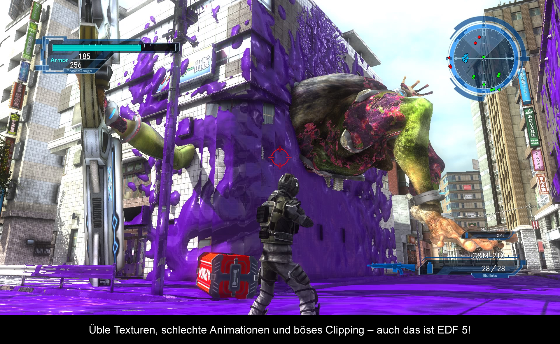 Okay, hier haben wir die größte Schwäche von Earth Defense Force 5. In Vorbereitung für meinen Test habe ich mir nochmal Szenen von Teil 1 bis 4 angesehen, um meine Erinnerungen etwas aufzufrischen, und es ist schockierend, wie wenig sich auf dem ersten Blick beim fünften Spiel geändert hat. Klar wirken die Gegner im Vergleich zu den PS2 und PS3-Fassungen ein wenig detaillierter, aber dennoch bleibt die grafische Qualität des Spiels im Großen und Ganzen auf einem überschaubaren Niveau. Dieses Niveau zeichnet sich durch wiederholende Monstertypen aus vorherigen Spielen aus als auch durch üblen Pixel-Matsch, der vor allem bei hohem Gegneraufkommen aufritt. Und auch die Animationen befinden sich nach wie vor auf einem Level vergangener Generationen, was sich aber wohl in Zukunft auch nicht mehr ändern wird. Dennoch: Selbst, wenn man von der mittelmäßigen Optik absieht, ist es enttäuschend, dass Framerate-Einbrüche, und starker Ruckler nach wie vor stark auftreten. Hier hätte ich mir einfach mehr Stabilität gewünscht. Was den Sound angeht, gibt es eine überschaubare Anzahl an Songs, die immer wieder eingespielt werden, und nicht wirklich zur Stimmung beitragen. Ganz im Gegenteil: Irgendwann hat man sich einfach sattgehört. Wäre es nicht für die Audio-Mitteilungen hätte ich die Musik wohl ausgeschaltet. Überragend sind jedoch die B-Movie-artigen Kommentare eurer CPU-Kollegen. Egal ob mitreißende Überlebensparolen, oder herzzerreißende Todesschreie - man merkt eindeutig, dass die Sprecher auf jeden Fall ihren Spaß bei den Aufnahmen hatten.