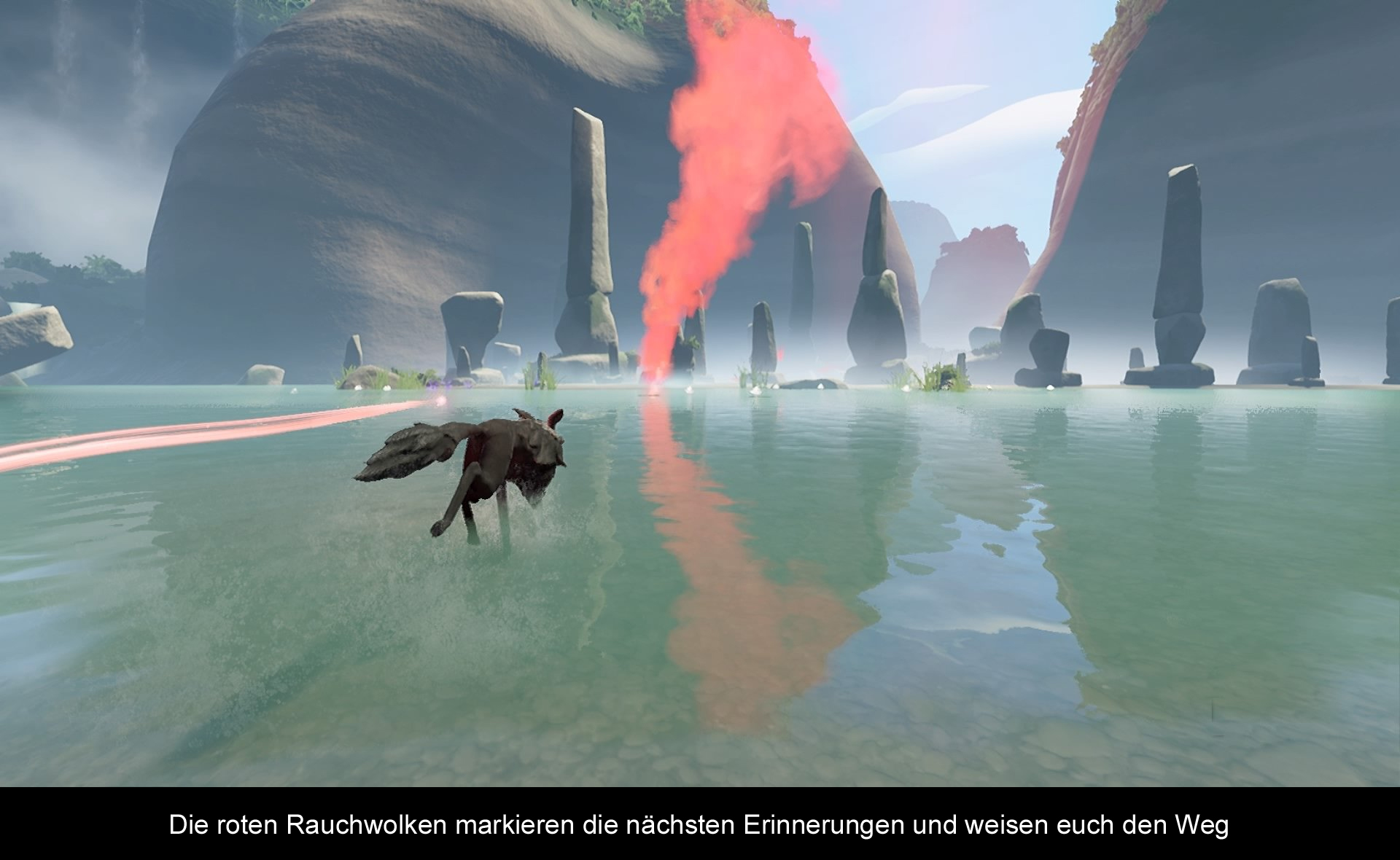 Indie-Spiele haben oftmals einzigartige Visionen oder sie behandeln interessante Aspekte des Lebens, oder aber versteifen sich auf poetische Analogien. In „Lost Ember“ könnte man das grundliegende Thema mit den drei Schlagwörtern in der Überschrift grob einordnen. Klar, jetzt könnte man meinen, dass uns wieder irgendwelche Großstadt-Hipster belehren wollen, aber zum Glück halten sich die „Vorwürfe“ in Grenzen und man verpackt „Lost Ember“ stattdessen in ein normales Story-Gerüst. Zuviel verraten möchte ich deshalb nicht, nur so viel sei gesagt: Eine verirrte Seele trifft auf einen Wolf und möchte, das der Vierbeiner es zur Stadt des Lichts begleitet. Natürlich gibt es auf der Reise noch die eine oder andere Überraschung, doch unterm Strich kann man sagen: Die Geschichte war rührend, spannend und für mich auch der Hauptgrund, bis zum Ende weiter zu spielen.