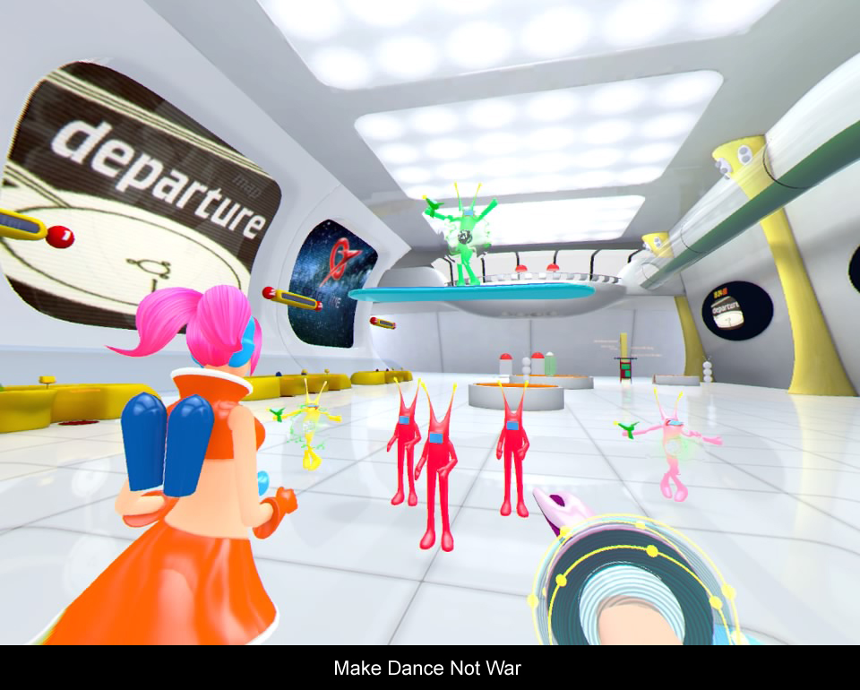 Kurz noch einen Abstecher zur Story. Man selbst spielt in der VR Interpretation nicht Reporterin Ulala, sondern einen Frischling bei Channel 5. In einem kurzen Tutorial wird einem schnell das Gameplay erklärt, bevor einem die Nachricht ereilt, dass in einem Raumhafen eine Invasion stattfindet und Aliens (sogenannte Morolians) die Menschen zum Tanzen zwingen. Neben den Raumhafen führt uns das Abenteuer noch in einen intergalaktischen Fahrstuhl, durch einen Asteroidengürtel und abschließend in einen futuristischen Konzertsaal. Technisch ist der Titel übrigens sehr durchschnittlich. Ulala schaut noch immer bezaubernd aus und bewegt sich stilvoll durch die Szenerie, die Animationen der restlichen Charaktere sind jedoch lange nicht mehr Up to date und auch die Level sind nicht sonderlich detailliert oder liebevoll gestaltet. Der Retro Chic kommt im Prinzip nur im ersten Level zur Geltung. Immerhin bleibt man von Schwindel und Übelkeit verschont, da man sich die ganze Zeit auf der gleichen Position befindet und sich nichts weiter auf dem Bildschirm tut. Übel wird einem nur, wenn man an die in den Wind geschossenen 45€ denkt.