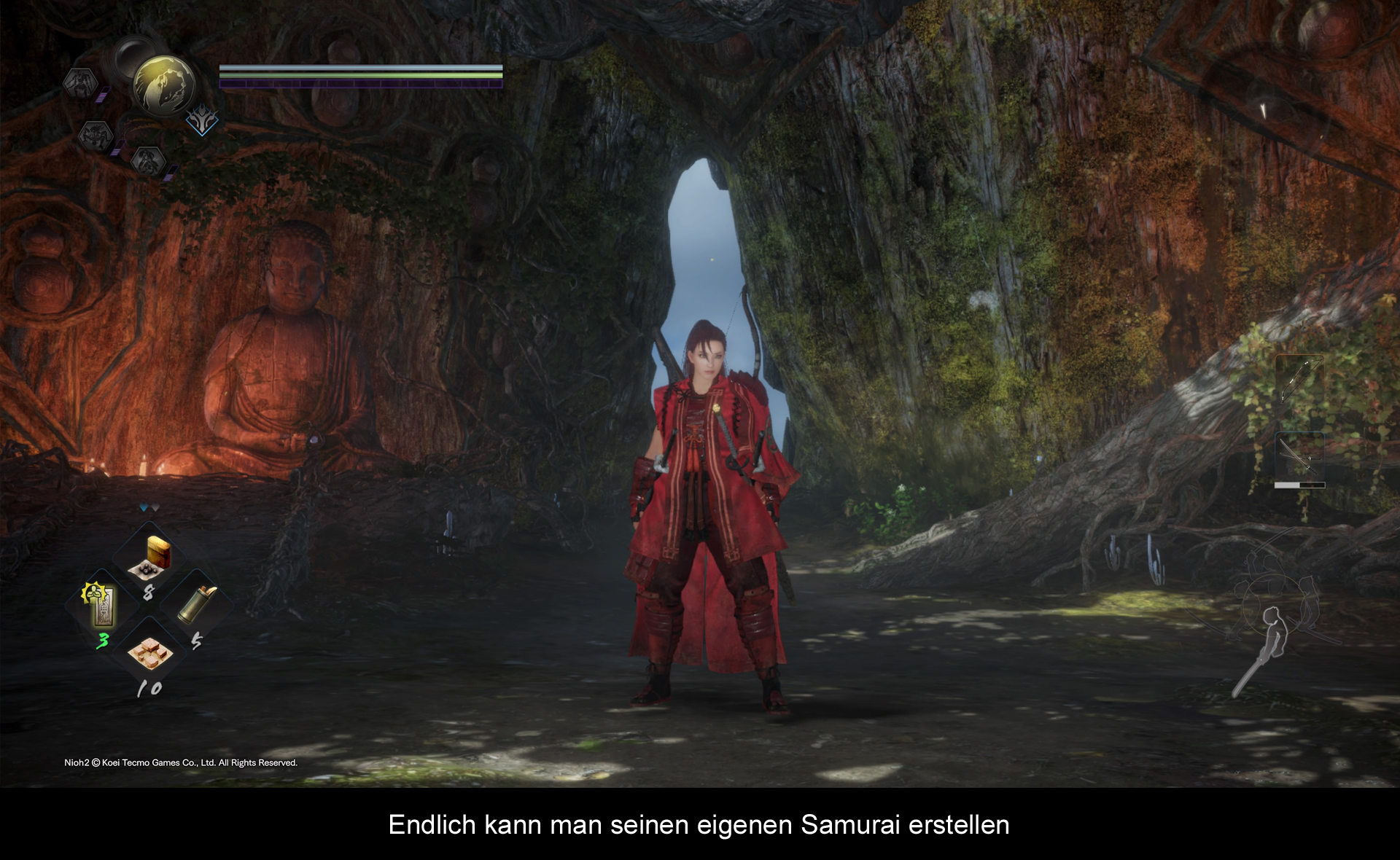 „Nioh 2“ ist in dem Fall kein direkter Nachfolger aber irgendwie dann doch schon. Die Geschichte fängt vor dem ersten Teil an und im Laufe des Spieles klärt sich dann die Verbindung zum ersten Teil. Mehr möchte ich auch an dieser Stelle nicht verraten, nur wer es spielen möchte, dem sei gesagt es mehr als lohnenswert ist. Während wir im Vorgänger noch einen vorgefertigten Charakter in Form von William spielen musste, überlässt uns das Spiel die freie Wahl nach einem eigenen Charakter. So können wir entweder einen männlichen oder weiblichen Samurai spielen. Eine Sache die ich mir insgeheim auch im Vorgänger gewünscht hatte, da William selber etwas blass wirkte und ich zumindest keine Verbindung zu ihm herstellen konnte. Obwohl es ja auf der Hand liegt, das mit einem westlichen Charakter auch klar ein westliches Publikum angesprochen wurde.