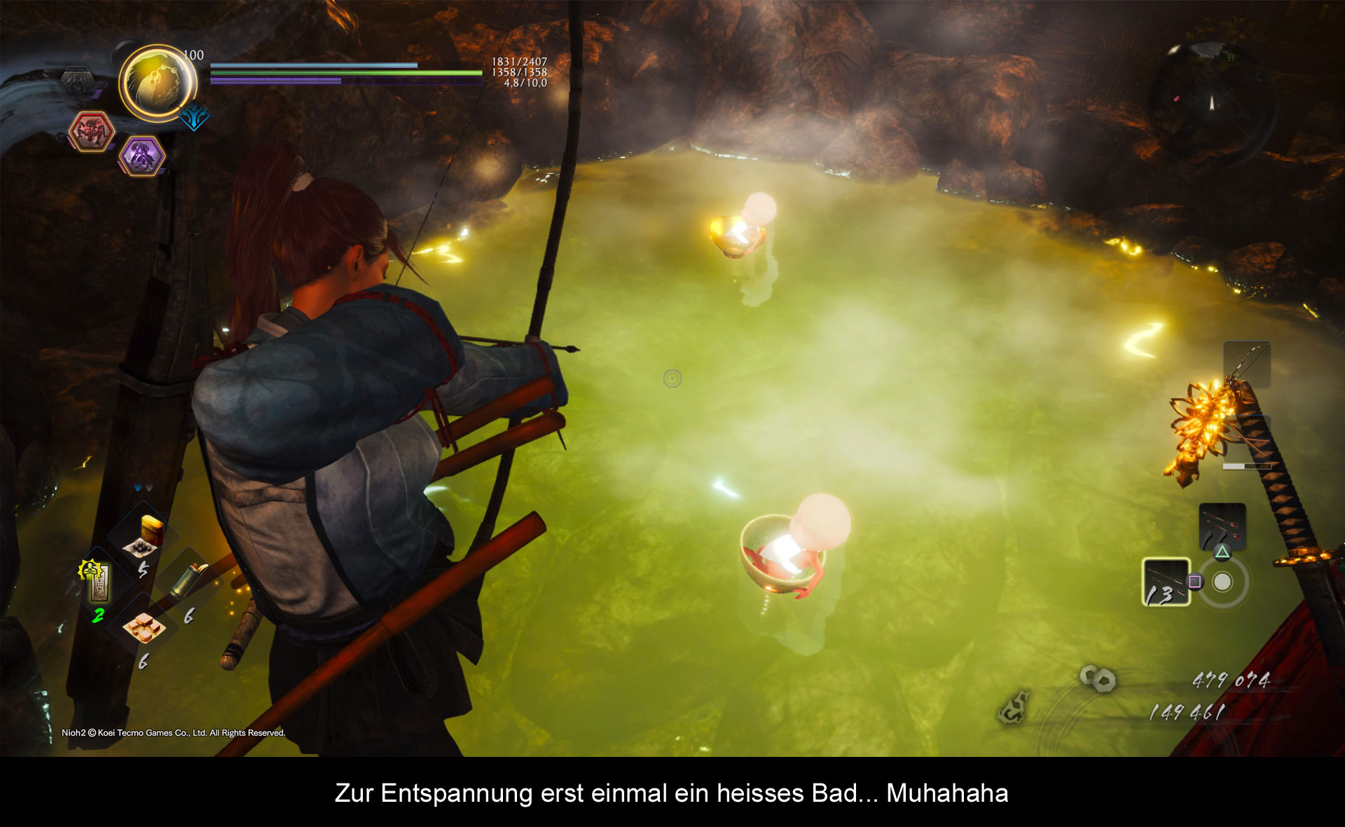 Wie auch immer, sobald wir unseren Samurai, im recht umfangreichen Editor und in wirklich gelungener Optik erstellt haben, stürzen wir uns auch schon ins neue Abenteuer. Während wir in der Geschichte voranschreiten und hübsche Zwischensequenzen serviert bekommen die musikalisch wunderschön untermalt sind, wie auch im restlichen Spiel, steigen wir Stufe für Stufe auf und maximieren unseren Charakter in allem was uns gerade so im Spiel weiterbringt. So fängt es schon mit der Waffenauswahl an, von einer Axt bis zum Katana über den Speer gibt es unzählige Möglichkeiten sich durch die Yokais und menschlichen Gegner zu schnetzeln. Und alle Waffen haben ihren Reiz und machen Spaß. Am Ende entscheidet mehr das persönliche Wohlbefinden darüber mit welcher Waffe man jetzt auf Beutejagd geht. Hier bei seid ihr allerdings auch nicht festgenagelt auf eine spezifische Waffenart. Der Wechsel auf eine andere Waffe ist hierbei jederzeit möglich. So kann man bis zum Ende des Spiels seinen Charakter immer weiter optimieren. Nicht nur vom Waffentyp hängt unser Erfolg ab, sondern auch mit welcher Rüstung wir uns gegen die immens starken Yokai stellen. Von leichter bis schwere Rüstung ist alles vorhanden, was das Samurai Herz begehrt. Während wir mit leichter Rüstung uns noch deutlich schneller bewegen und ausweichen können als mit schwerer, können wir dafür weniger einstecken und kassieren mehr Schaden. Die Wahl liegt wieder bei uns, wie wir vorgehen möchten und womit wir uns am Ende des Tages wohler fühlen. Mein Charakter hatte zumeist schwere Rüstung, aufgrund der teils besseren Bonis ist es mir ziemlich leichtgefallen, diese auch zu präferieren. Nach jeder Mission können wir uns beim Schmied, der erst mit der Story im Verlauf des Spieles freigeschaltet wird, unsere Waffen und Rüstungen weiter verfeinern. Wer den Vorgänger oder Spiele wie „Diablo“ gespielt hat, wird sich direkt wohlfühlen und braucht keine weiteren Erklärungen mehr. Mit verschiedenen Ressourcen die Gegner hinterlassen können wir nach Herzenslust die Bonis auf Katana, dem Helm oder der Brust wechseln. Negative Bonis, die unserem Spieltyp nicht liegen werden gegen andere für uns nützliche ausgetauscht. So ist man das ganze Spiel über beschäftigt, das möglichst beste aus seiner Ausrüstung zu holen. Und das ist auch wichtig, da dieses Mal die im Spiel auftauchenden Yokai verdammt stark sind. Wenn ich behaupte, das sie meine Nerven strapaziert haben, ist das noch gewaltig untertrieben. Zum Teil waren die Bosse einfacher als die Yokai, die im aktuellen Level seine Runden drehten. Vielleicht bin ich auch einer der wenigen, die das so sehen, aber mir haben sie im Spielverlauf mehr als nur einmal den Hals umgedreht. Ziemlich oft kommt es auch vor, das unglaubliche viele Dämonen in den Leveln platziert wurden, wohl um den Spielern eine echte Herausforderung zu bieten. Ich bin offen für 1vs1 Kämpfe, ich mag sie, wenn sie gut und fair inszeniert sind und wenn sie von mir all das Können abverlangen, was ich mir bis dahin im Spiel angeeignet habe. Aber wenn da mehrere Gegner sind (von Yokai über menschliche Gegner bis hin zu kleinen Schergen), die mir regelrecht den Schuh ausziehen und ich kein Land sehe, dann spüre ich da wenig von Herausforderung. Manchmal ist weniger mehr und in dem Fall hätte ich mir gewünscht, dass die Gegner in den Levels zumindest eine bessere Platzierung hätten. Während meiner Spielphase sind zwar mehrere Patches erschienen, die auch am Balancing geschraubt haben, aber viel leichter war es dadurch nicht. Immerhin gibt es eine neue zusätzliche Spielmechanik, die uns ein wenig hilft gegen die hin und wieder zu starken Gegner. Die Wuchtattacke kontert im richtigen Moment einen gegnerischen Angriff und wir bekommen dadurch Zeit, auf den Gegner mit allem was uns zur Verfügung steht, darauf ein zu prügeln. Viel Zeit bleibt nicht, da sie sich schnell davon wieder erholen. Da wir uns zum Yokai verwandeln können, wenn die entsprechende Amina Leiste voll ist vorausgesetzt, dann stehen uns einige mächtige Angriff zu Wahl. So können wir zum Teil erheblichen Schaden zufügen und bei einem Bosskampf ist davon auch dringend Gebrauch zu machen.