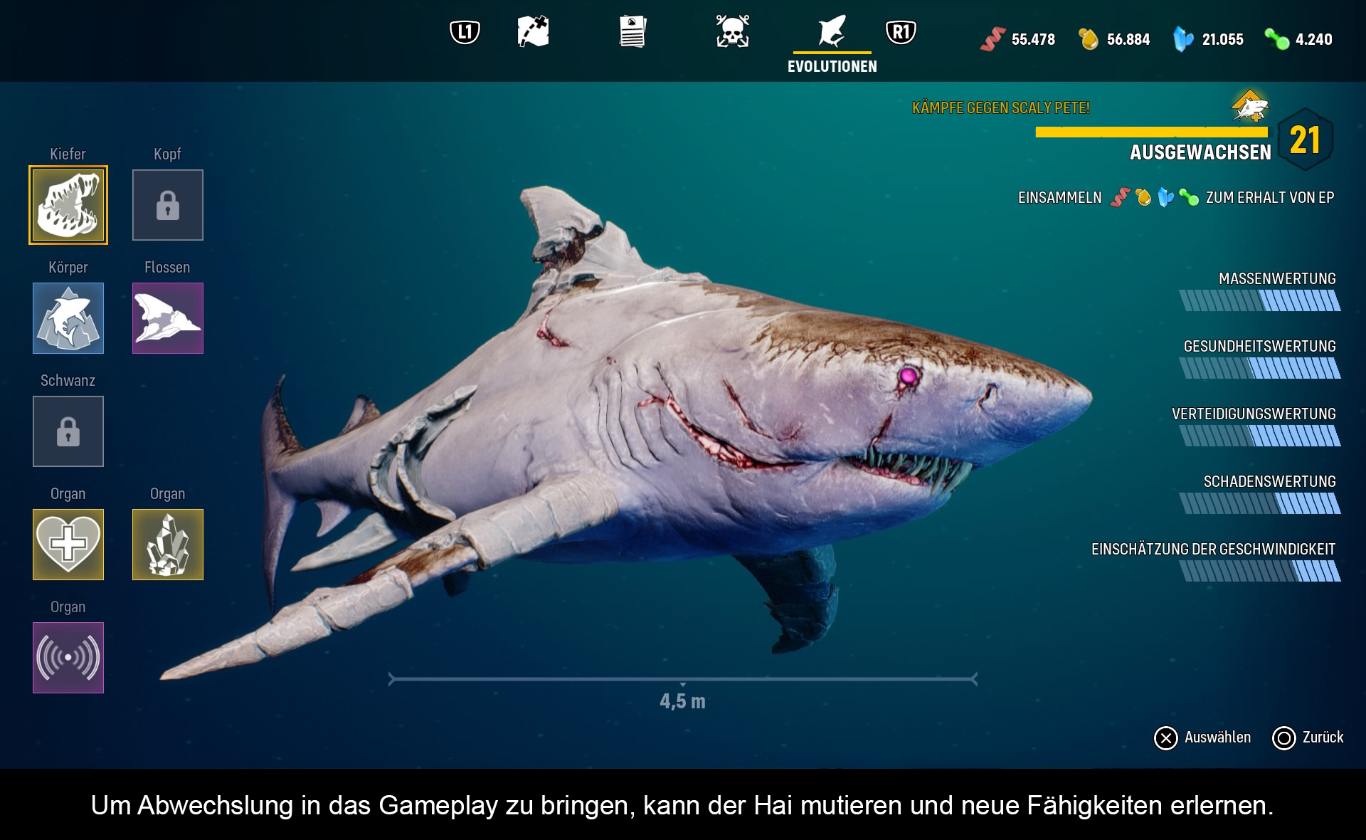 Spieltechnisch ist „Maneater“ relativ simpel gestrickt. In der offenen Spielwelt steuert man den Hai, dessen einzige Aufgabe es ist, größer zu werden. Im Grunde ist man immer zu auf der Jagd nach kleinen und großen Fischen, die es mit der Beißattacke (R2), zu verspeisen gilt. Die Steuerung des Haies geht einfach von der Hand und man hat sie schnell verinnerlicht. Neben beachtlichem Wachstum verfügt unser Hai auch über die Möglichkeit, meterweit aus dem Wasser zu springen und sich kurzzeitig auf Land fortzubewegen. Das macht ihn nicht nur für Meeresgetier gefährlich, sondern auch für die zahlreichen Menschen welche nahe am Wasser leben. Auch hat er die Möglichkeit geerbt, sich genetisch weiter zu entwickeln. Ein verstärkter Panzer, bessere Zähne oder die Fähigkeit bio-elektrische Impulse zu generieren, sind nur ein paar der Möglichkeiten, die man im Laufe des Spieles erlernt. Durch die Vielfalt der Optionen ist das Spiel letztlich mehr ein Rollenspiel als ein Actionspiel. Denn nur wer regelmäßig Erfahrungspunkte und Ressourcen sammelt, hat eine Chance in dieser Welt zu überleben.
