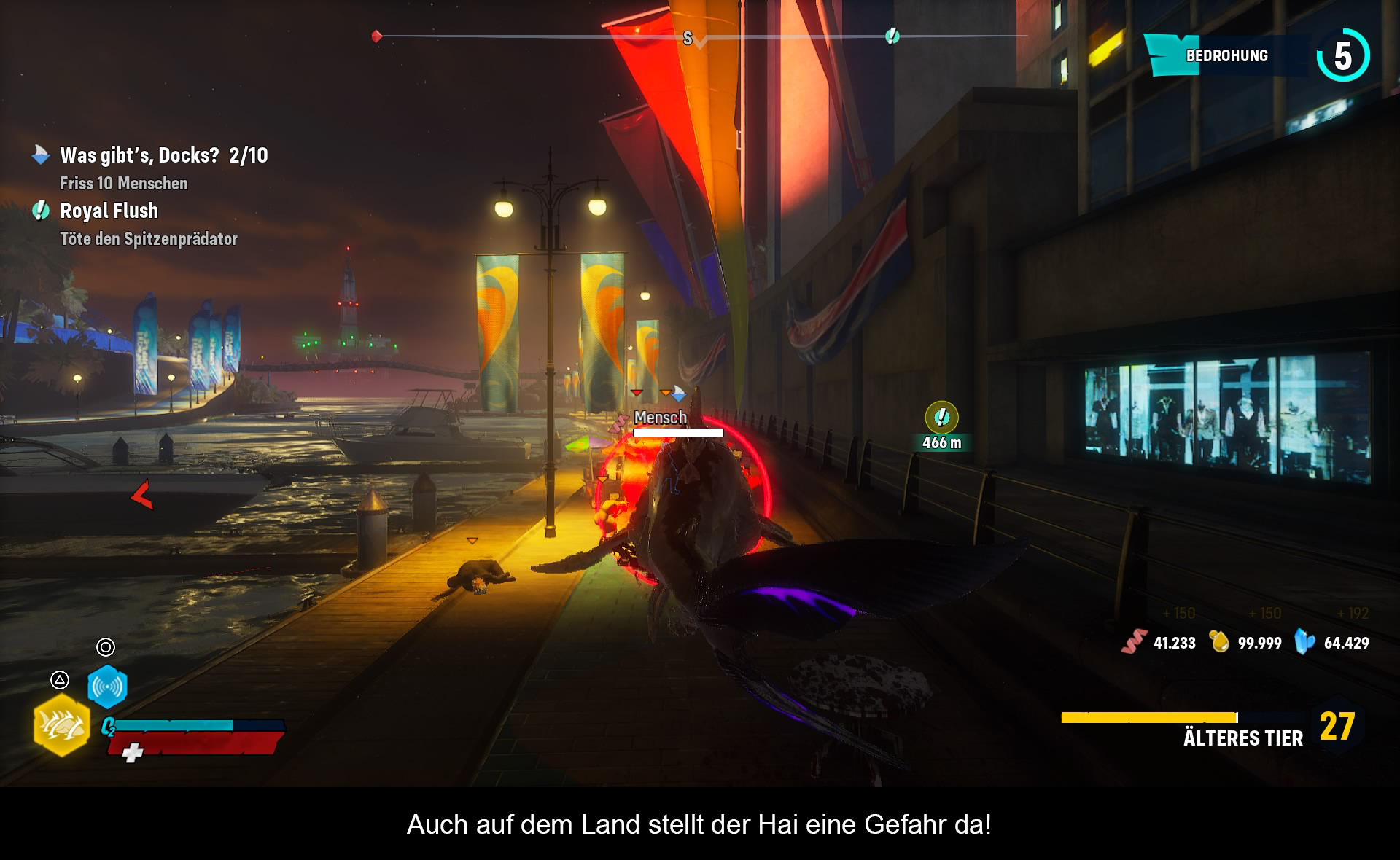 Einen Großteil der Missionen verbringt man damit, verschiedene Fische zu jagen. Fresse 10 Makrelen hier, Fresse 10 Makrelen da. Spielerisch keine große Herausforderung und nur ein klassisches Fetch-Quest um die Spielzeit zu strecken. Interessanter wird es hingegen, wenn man aktiv auf die Jagd nach Scaly Pete geht. Um diesen alten Seebären herauszulocken, muss man der gefürchtetste Hai von ganz Port Clovis werden und dies geht am Einfachsten, indem man gezielt Menschen verspeist. So steigt während des Spieles das Bedrohungslevel und man stellt sich den unterschiedlichsten Hai Jäger. Durch ihre Überzahl können diese durchaus gefährlich werden, stellen aber am Ende doch keine große spielerische Herausforderung dar. Durch gezieltes Beschädigen der Boote oder direkte Sprungattacken auf die Jäger finden diese fix ihr jähes Ende.