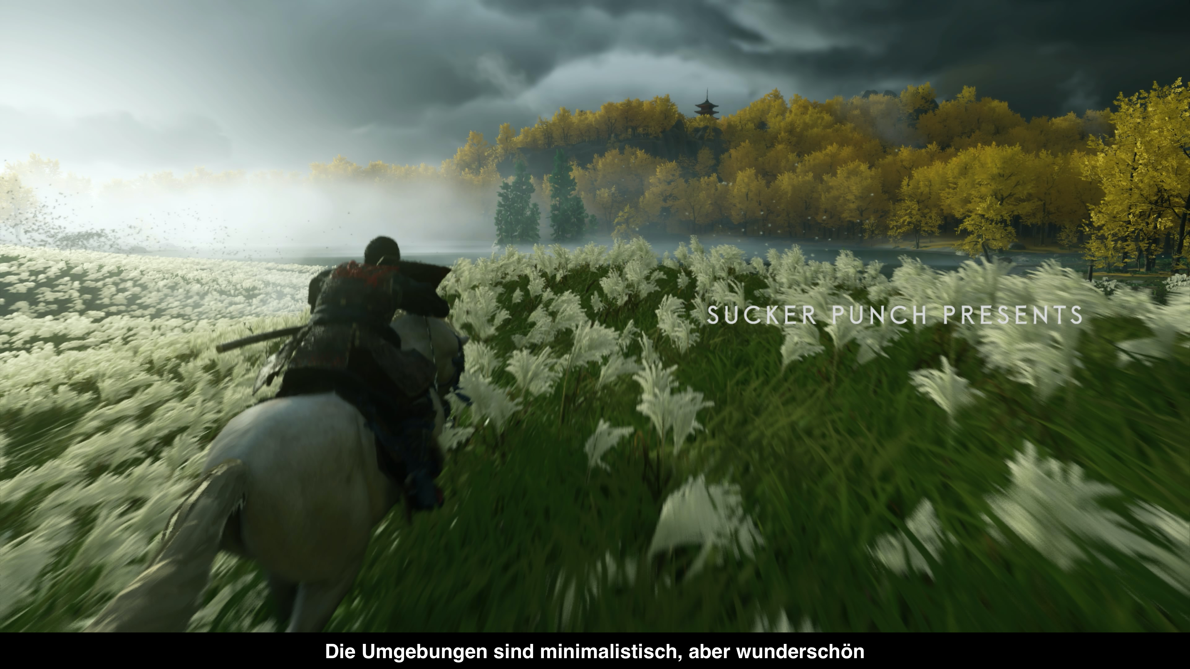 Bevor wir zu Grafik und allgemeiner Technik kommen, seien die Ladezeiten von Ghost of Tsushima erwähnt. Wie auch immer Sucker Punch dies geschafft hat, die Ladezeiten sind unglaublich kurz. Erstmals verdient der Schnellreise-Modus auch wirklich seinen Namen, weil man in ein paar Sekunden ans andere Ende der Karte wechseln kann. Hier haben die Entwickler super Arbeit geleistet. Aber auch ansonsten kann sich die Technik sehen lassen. Insbesondere grafisch wird einiges geboten. Die Welt von Tsushima mag zwar simpel sein mit vielen Feldern und Wäldern, aber die riesige Anzahl von Gräsern die sich realistisch im Wind bewegen, ist etwas was man so bislang noch nicht gesehen hat. Hinzu kommt die artistische Gestaltung die eher minimalistisch daherkommt, aber einfach super aussieht. Wenn der ganze Bildschirm in einem Wald in gelbe Blätter eingetaucht ist, wünscht man sich den Herbst herbei. Wie gut das der Fotomodus nur einen Tastendruck entfernt ist, um all das einzufangen. Dabei bietet der aber wirklich tolle Funktionen. So kann man z.B. die Tageszeit, die Windstärke, Blätter und vieles mehr völlig dynamisch einstellen, um das perfekte Bild einzufangen. Und all das läuft völlig problemlos in 4k mit 30 Bildern pro Sekunde auf der PlayStation 4 Pro.