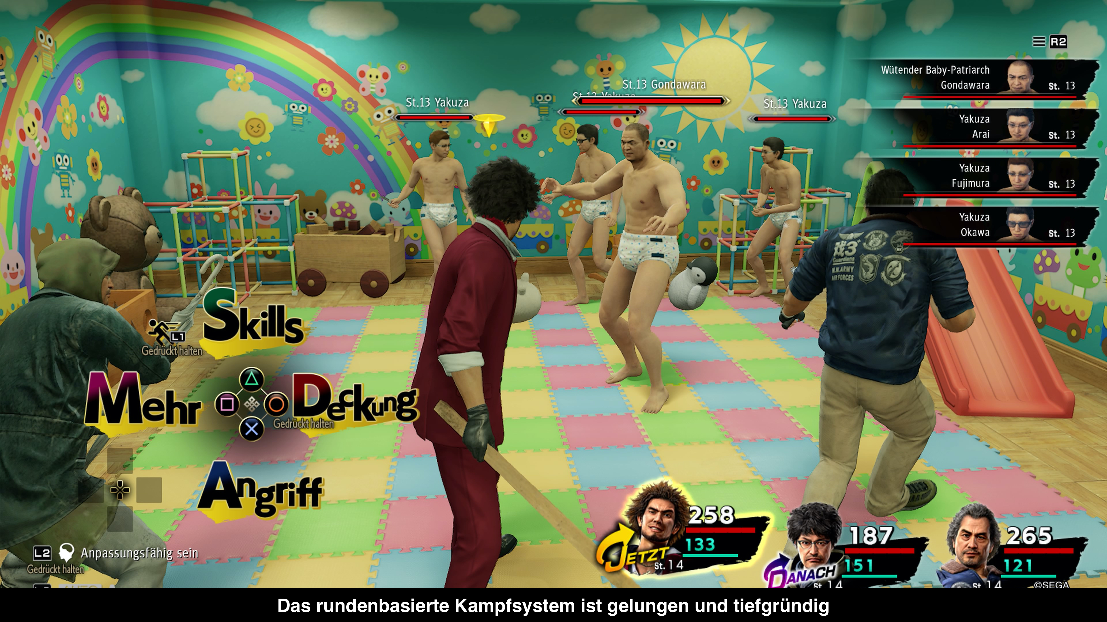 Da Ichiban als Kind zu viel Dragon Quest gespielt hat, ist das ganze Leben für ihn ein einziges Abenteuer wie im Spiel. Diesen Umstand merkt man auch im Spiel, denn vorbei sind die Zeiten in denen man sich wie in Streets of Rage oder Tekken durch die Gegner geprügelt hat. So ist Yakuza: Like a Dragon nämlich ein waschechtes, rundenbasiertes Rollenspiel, offensichtlich inspiriert von Dragon Quest & Co. Zum Beispiel kämpft ihr nun mit einer Gruppe und jeder Charakter kann entweder einen simplen Angriff auswählen, in Deckung gehen, Items nutzen oder besondere Skills auswählen. Dabei hat das neue System den Entwicklern erlaubt den eigenen Humor noch mehr einzusetzen, wenn z.B. ein Charakter dank Mundgeruch und Feuerzeug plötzlich Feuer speien kann. Dazu gibt es sogar noch ein waschechtes Job-System, der die Fähigkeiten jedes Charakters beeinflusst und die richtige Kombination kann für die Kämpfe entscheidend sein. Wie man sehen kann, ist also alles dabei und dabei hat man die eigenen Tugenden nicht vernachlässigt. So sind auch wieder die vielen Nebenquests und Minispiele vorhanden, die euch zwischen den Story-Happen bei Laune halten sollen.