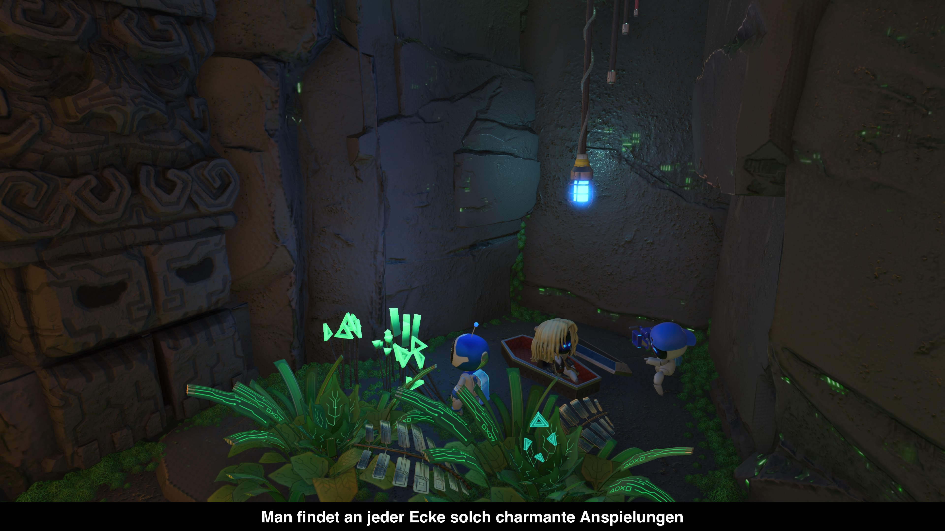 Ganz nebenbei erwartet einen noch eine Reise quer durch über 25 Jahre PlayStation Geschichte. So gibt es überall kleine Hommage an bekannte Spieleserien oder Peripherie aus vergangenen Tagen. Da steckt mal Cloud Strife sein Schwert im Boden, fürchtet sich Elli vor einem "befallenen" Astro Bot oder unser kleine Freund zockt fröhlich auf einer Vita oder stülpt sich PSVR über den Kopf. Herzerreissend!