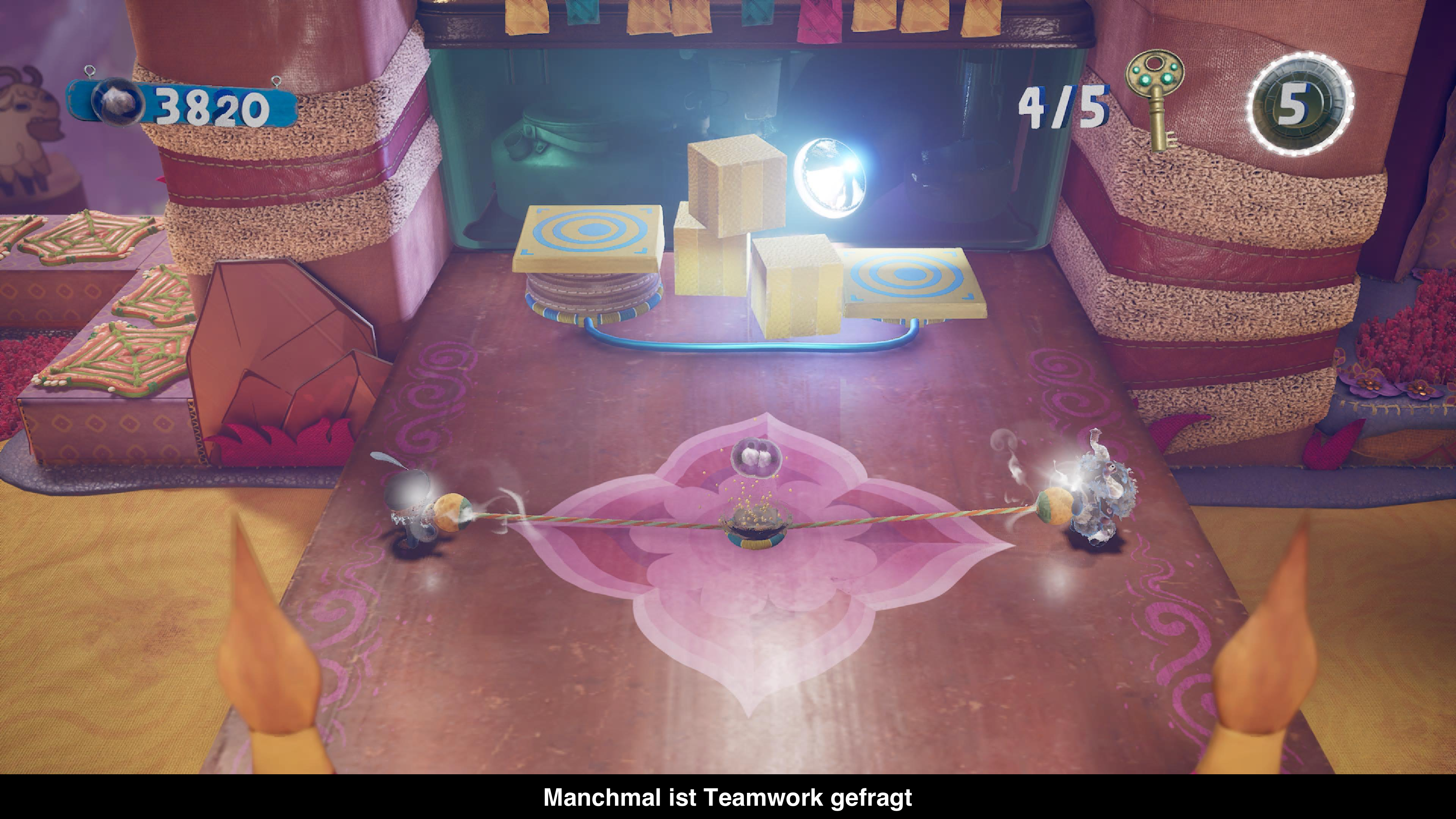 Wie auf der PlayStation 5 läuft Sackboy: A Big Adventure auch auf der PlayStation 4 mit 60 Bildern pro Sekunde. Die Auflösung wird aber stark heruntergedreht. Denn auf der PlayStation 4 Pro läuft das Spiel in 1080p und auf der PlayStation 4 sogar nur in 720p. Hier lag der Fokus also definitiv auf einer stabilen Bildrate, die auch gehalten wird. Die hohe Bildrate ist definitiv ein Vorteil und sorgt für genaue Tasteneingaben, die einem schon mal das Leben retten können. An sich fehlen nur ein paar Teppich-Elemente in Leveln und ein paar Reflexionen, die nur im Direktvergleich auffallen. Alles weitere ist identisch zwischen beiden Versionen. Ansonsten platzt das Spiel natürlich vor Charme dank des Little Big Planet Stils. Besonderen Wert legt man hier auf die originalgetreue Darstellung unterschiedlicher Materialien, wie Wolle, Glas, Schwamm und vieles mehr. Da die Welt aus all diesen Materialien besteht, entsteht eine kunterbunte Welt mit realistischen Touch, die umwerfend aussieht. Auch die Zwischensequenzen profitieren davon und manche davon könnten auch als Animationsfilm durchgehen. Die profitieren auch von der hervorragenden deutschen Synchronisation und dem phänomenalen Soundtrack. Der enthält einerseits Stücke, die so auch in Little Big Planet hätten vorkommen können, einige Eigenkreationen und lizenzierte Stücke, die dann für besondere Level eingesetzt werden. In diesen reagiert das Level auf den Beat der Musik und alles tanz und wippt zum Takt und das ganze Konzept erinnert an die Musiklevel aus Rayman Legends.
