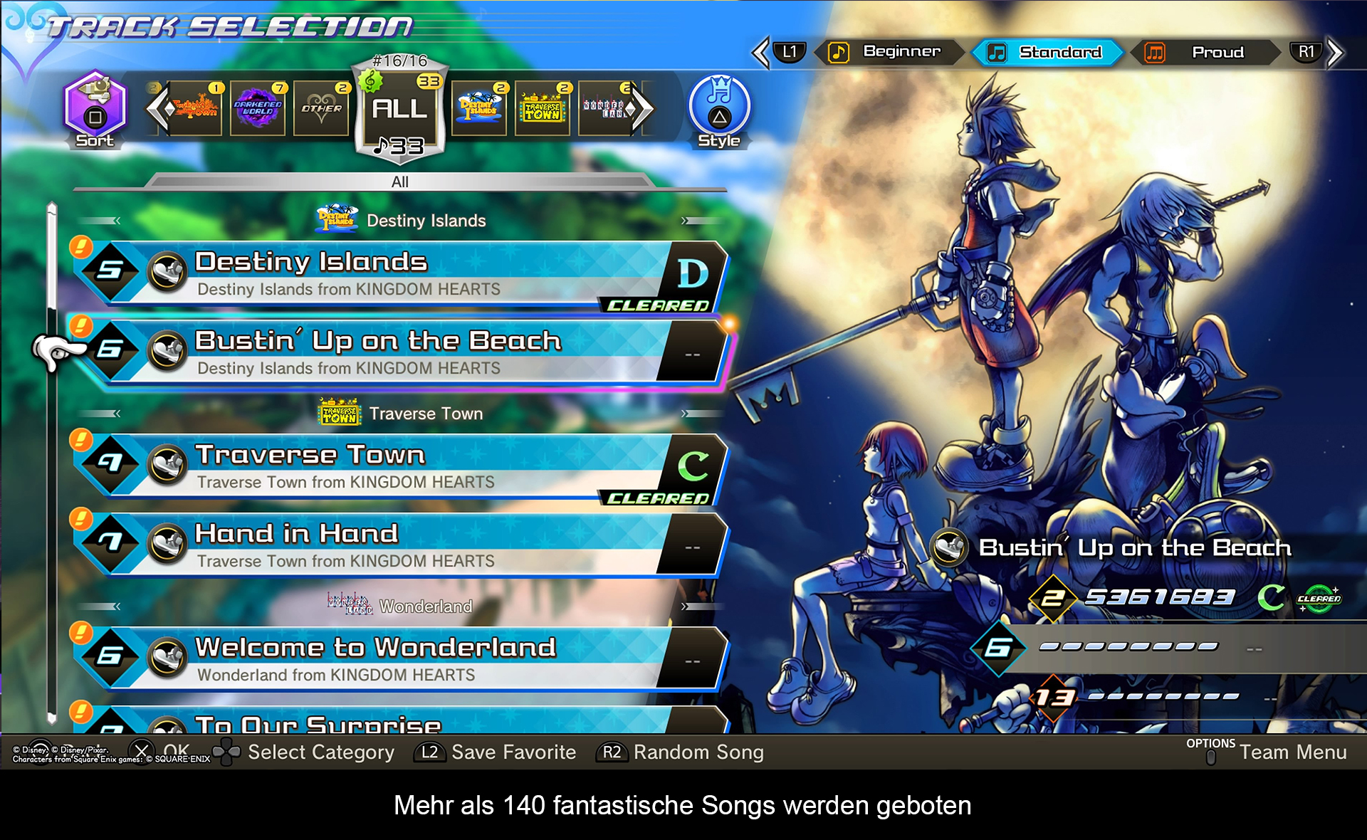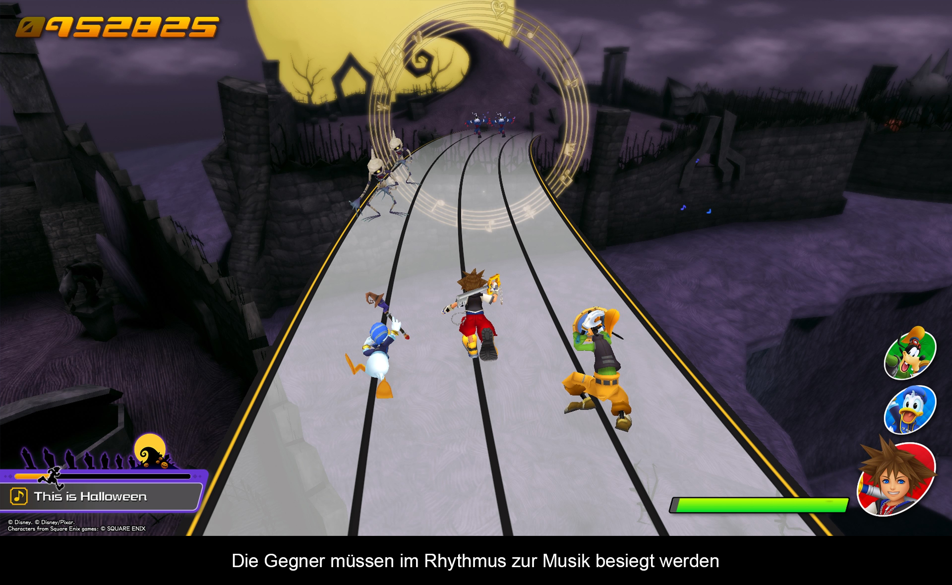 So erwartet dem Spieler im Gegensatz zum inoffiziellen Handheld-Vorgänger eine vollständige 3D-Optik, wo jeweils drei Charaktere nebeneinander einer geradlinigen Strecke folgen und im Rhythmus der Musik sämtliche Schurken zur Strecke bringen, die einem entgegen laufen. Umso mehr Gegner man trifft, desto mehr Punkte gibt es am Ende auch. Das Spiel ist äußerst fair mit dem Timing, wodurch die einfachen Schwierigkeitsgerade leicht zu meistern und kaum herausfordernd sind. Etwas anders sieht es jedoch bei den höheren Schwierigkeitsgeraden aus. Hier werdet ihr mit Gegnern und schwierigen Combos, wo ihr wirklich sehr schnell die jeweiligen Tasten auf einmal drücken musst, quasi überflutet. Um ein frühes Game Over jedoch zu vermeiden, sollte man vor Spielbeginn auf jeden Fall einen Blick in das Crafting-System werfen, wo man Potions, Elixire und weitere Hilfsmittel herstellen kann, die einem zum Beispiel Extra-Leben geben, wenn man kurz vorm Scheitern steht. Wer also sämtliche Level zu 100% abschließen möchte, ist nicht nur auf seine Fähigkeiten angewiesen, sondern kann sich auch zahlreiche Items zur Hilfe ziehen. Als Belohnung für das erfolgreiche Absolvieren eines Levels gibt es dann im Anschluss sowohl hübsche Artworks als auch die jeweiligen Songs, die man dann im Anschluss im freien Modus einzeln auswählen und ohne Druck nachspielen kann. Interessanterweise umfasst das Spiel auch ein RPG-ähnliches Level-Up System für eure Dreier-Party, wobei man jedoch sagen muss, dass das Aufleveln eurer Charaktere nur einen geringfügigen Einfluss auf das Spielgeschehen hat und im Grunde ignoriert werden kann, da euer Rang rein Gameplay-technisch keine großen Auswirkungen auf das Spielgeschehen hat. Wie eingangs erwähnt umfasst eure Party stets drei Charaktere. Im weiteren Verlauf des Spiels werdet ihr aber sowohl von Gastcharakteren - einschließlich vieler bekannter Disney-Helden wie Herkules, Peter Pan, Stitch uvm. - begleitet als auch von anderen Kingdom Hearts Protagonisten, wie Roxas, Xion, and Axel. Insgesamt warten 20 Charaktere auf euch. Dennoch muss man sagen, dass die sich abgesehen vom Aussehen rein Gameplay-technisch kaum untereinander unterscheiden. So geht es bei jedem Level einfach nur darum, die Gegner im Einkang mit der Musik zu erledigen. Ein simple, aber dennoch zufriendenstellende Gameplay-Erfahrung. Inbsesondere wenn man die späteren, sehr herausfordernden Level erfolgreich absolvieren kann.