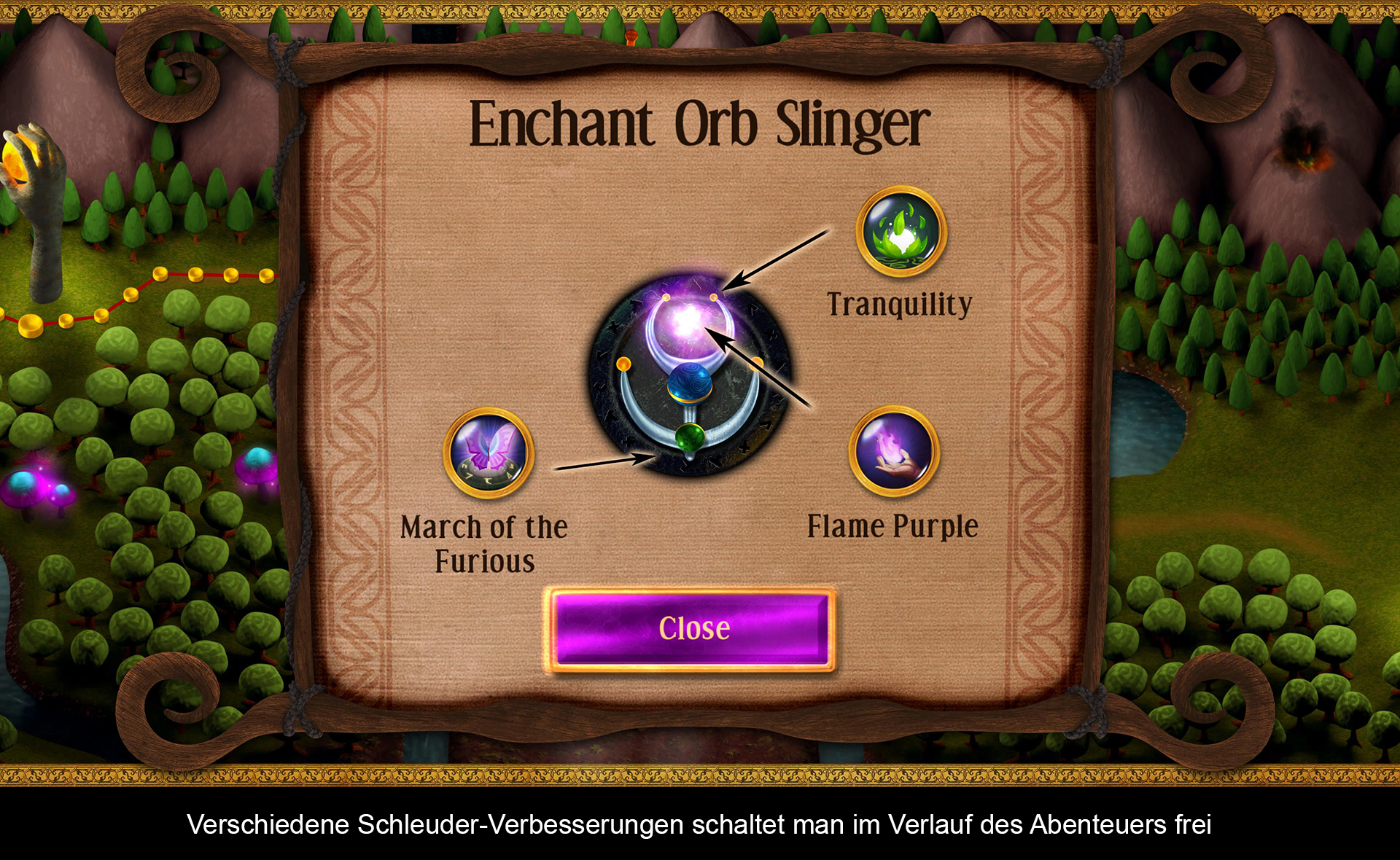 „Sparkle 2“ ist ein Murmelshooter, der auch Elemente von „Match 3“ Puzzlespielen beinhaltet. Ihr steuert auf einer bildschirmfüllenden Karte eine Schleuder und müsste die nahenden Murmeln davon abhalten, ins Ziel zu kullern. Dazu feuert man ebenfalls Kugeln ab, um passende Farbkombinationen zu erhalten. Mindestens drei Murmeln in einer Farbe braucht es, um die Reihe zu zerstören. Der Level ist beendet, wenn man die Runen der Schleuder gefüllt hat, der Zugang der Murmeln versperrt wurde und man alle Kugeln vom Bildschirm entfernt hat. Damit sich der Titel flüssiger spielt, kann man die geladenen Kugeln in der Schleuder wechseln. Zudem schaltet man bessere Extras frei, umso weiter man im Quest-Modus voranschreitet. Die Verbesserungen machen das Spiel dann auch etwas einfacher – zum Beispiel lassen sich Power-Ups magnetisch heranholen. Insgesamt sorgen 16 Verzauberungen für rund 200 Kombinationsmöglichkeiten. Dadurch kann man die Schleuder an seinen persönlichen Spielstil anpassen.