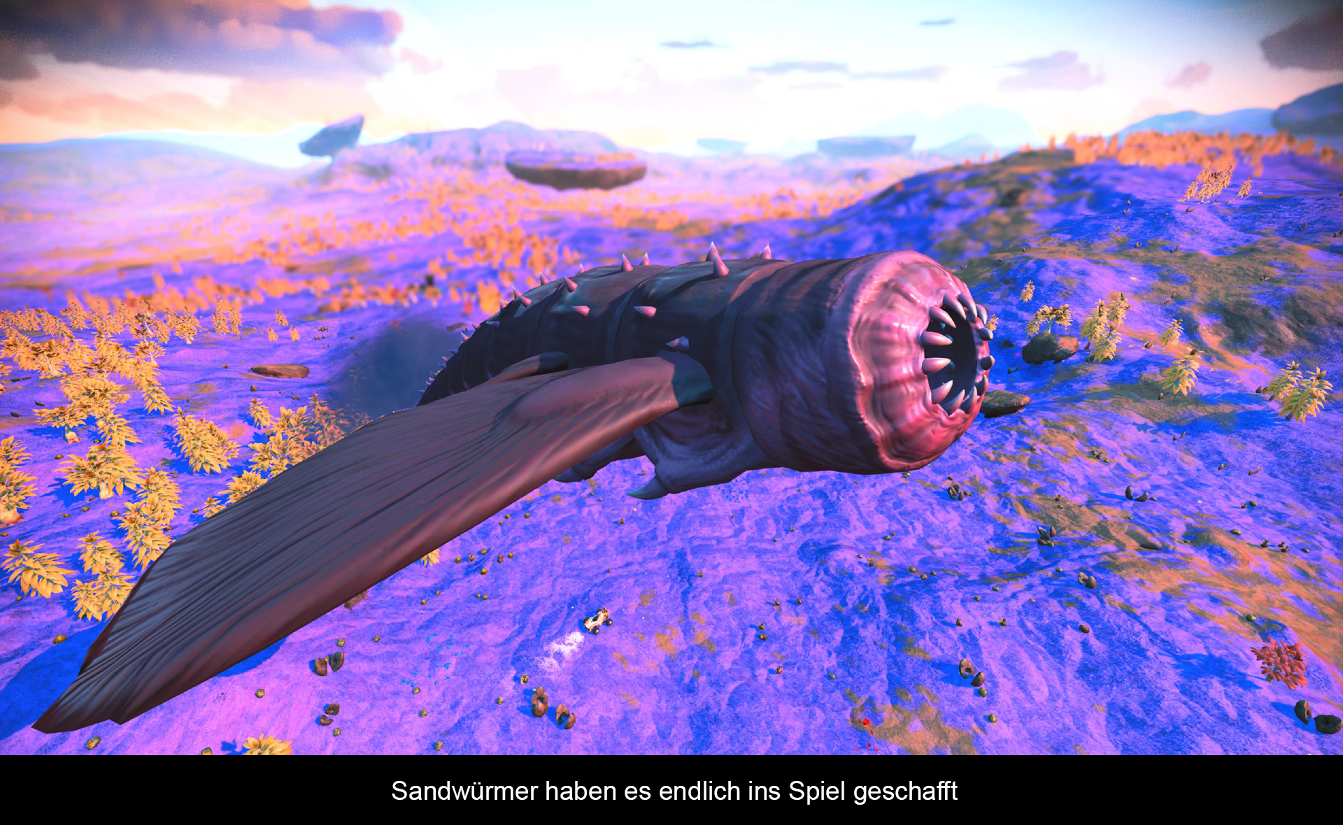 Natürlich existieren noch weitere Verbesserungen. Das komplette Elementsystem wurde ersetzt und weit logischer aufgebaut. Auch hat man den Realitätsansatz, dass bewohnte Planeten eher eine Seltenheit sind, verworfen. Dazu wurde die Galaxie neu erschaffen. Jetzt trifft man deutlich öfters auf Planeten, die mit neuen, einzigartigen Biomen aufwarten. Auf der Oberfläche gibt es nun tiefe Ozeane und Gebirgsketten, wie auch neue Wettereffekte. Gefahren wie Kometenschauer oder Vulkanausbrüche wurden ebenfalls ergänzt. Und bei der Kreaturen-Vielfalt hat sich auch einiges getan. Neben den riesigen Sandwürmen findet man nun auch Käfer und Robotertiere. Dank dem letzten Update lassen sich diese Kreaturen auch zähmen und als Begleiter rekrutieren. Ebenfalls wurde der Weltraum mit Leben gefüllt. Immer wieder trifft man hier auf Händler oder Kreaturen wie die Weltraumqualle. Sogar die Raumstation aus Version 1.0 fand eine passende Verwendung. Wer will, kann sogar einen alten Frachter aufsuchen und diesen plündern. Doch Vorsicht, hier warten zahlreiche Gefahren auf unvorsichtige Astronauten. Wer lieber auf seinem eigenen Frachter bleibt, freut sich, dass dieser nun als Basis und als Raumschiffgarage dient. Mit dem nötigen Kleingeld lassen sich sogar Fregatten rekrutieren, die man dann regelmäßig auf Missionen entsenden kann. Man kann auf diesen sogar landen! Weiterhin gibt es zahlreiche Verbesserungen im Lagersystem und selbst Crossplay mit XBox und PC Spielern unterstützt das Spiel mittlerweile. Die vielen Quality of Life Verbesserungen kann man gar nicht aufzählen – vertraut mir einfach, wenn ich sage, es sind sehr viele. Zu guter Letzt sei noch der VR-Modus erwähnt. Wer eine PlayStation VR Brille besitzt, kann das komplette Spiel damit virtuell erleben. Jedoch gibt es einen großen Nachteil: Man kann damit nur die PS4 Variante spielen. Auch ist es nicht möglich, dass sich die PS4 und PS5 den Spielstand teilen. Hat man einmal auf die PS5 Version gewechselt, gibt es kein Zurück mehr.