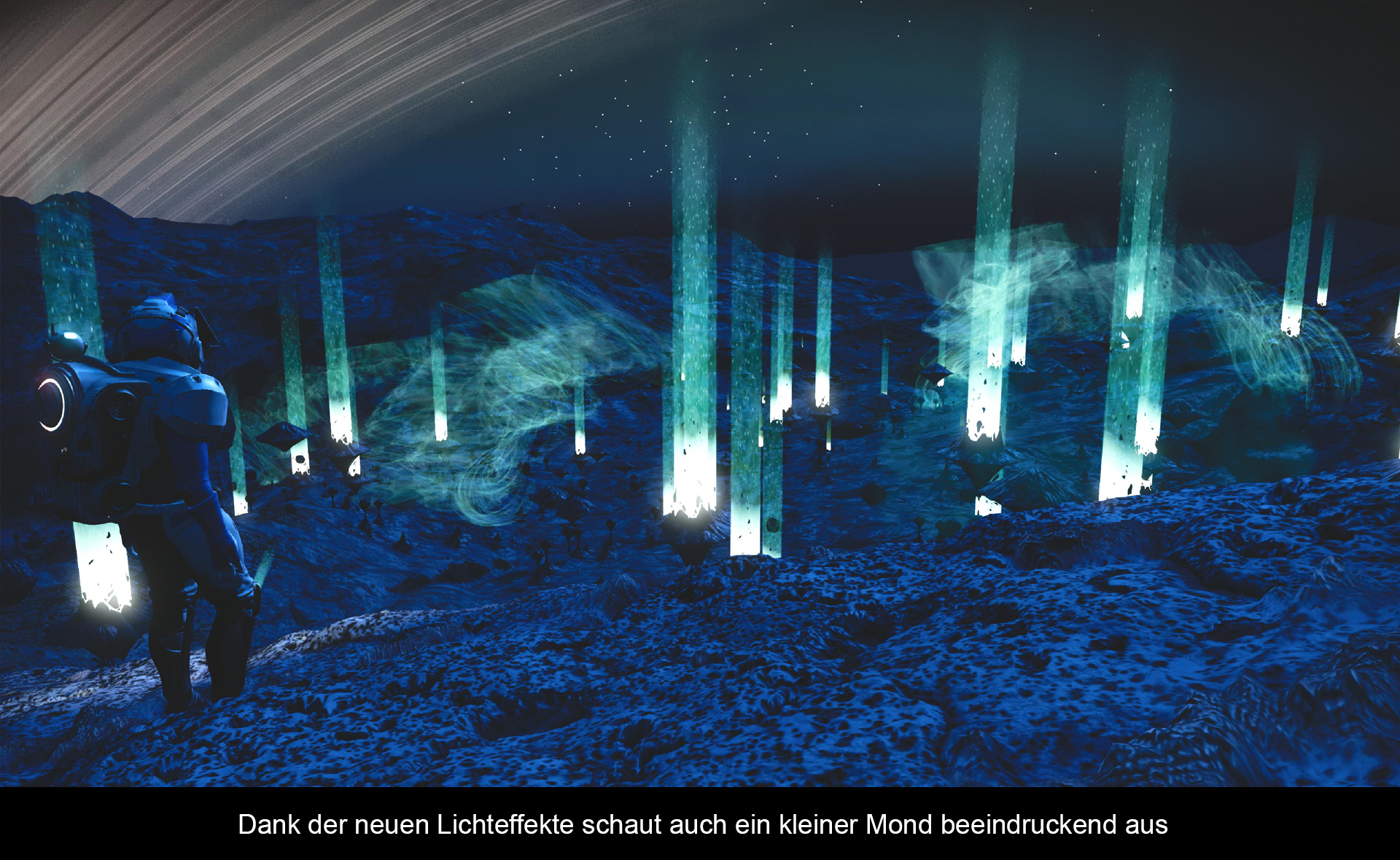Zwar machte der Titel bereits auf der PS4 Pro eine gute Figur, aber auf der PS5 ist das nochmals ein anderes Kaliber. Wer das Spiel auf der neuen Konsole startet, wird sofort merken, dass die Ladezeiten drastisch reduziert wurden. Zwar ist man hier nicht ganz auf „Spider-Man“ Niveau, aber die Reisen zwischen den unterschiedlichen Galaxien gehen schneller denn je von statten. Auch haben Flora und Fauna einen ordentlichen Boost bekommen, wodurch die Planeten nun vor Leben regelrecht sprühen. Technisch kämpft man beim Planetenanflug allerdings immer noch mit Pop-Ups. Diese sind zwar wesentlich besser als auf der PS4, stören aber das Gesamtbild. Ist man jedoch gelandet, sind diese dann eine Seltenheit. Dank der 4K Auflösung wirken die Planeten nun so exzellent, wie es die ersten Trailer versprachen. Besonders die neuen Lichtspiele der Pflanzen, Minerale und Tiere lassen die Landschaft in einem neuen Glanz erstrahlen. Wer von einem Gewittersturm überrascht wird, bekommt imposante Wettereffekte zu sehen und dank der Power der PS5 blitzt es nun auch mit stabilen 60fps. Auch der Dualsense Controller bzw. dessen Features werden genutzt. Durch die erweiterte Rumble-Technologie merkt man, wenn zum Beispiel eine haushohe Kreatur vorbeistampft. Die Trigger werden zwar auch unterstützt, fallen aber nicht besonders ins Gewicht. Im Kontrast dazu steht der 3D Sound, dieser ist überaus gelungen und trägt definitiv zum audiophilen Erlebnis bei.