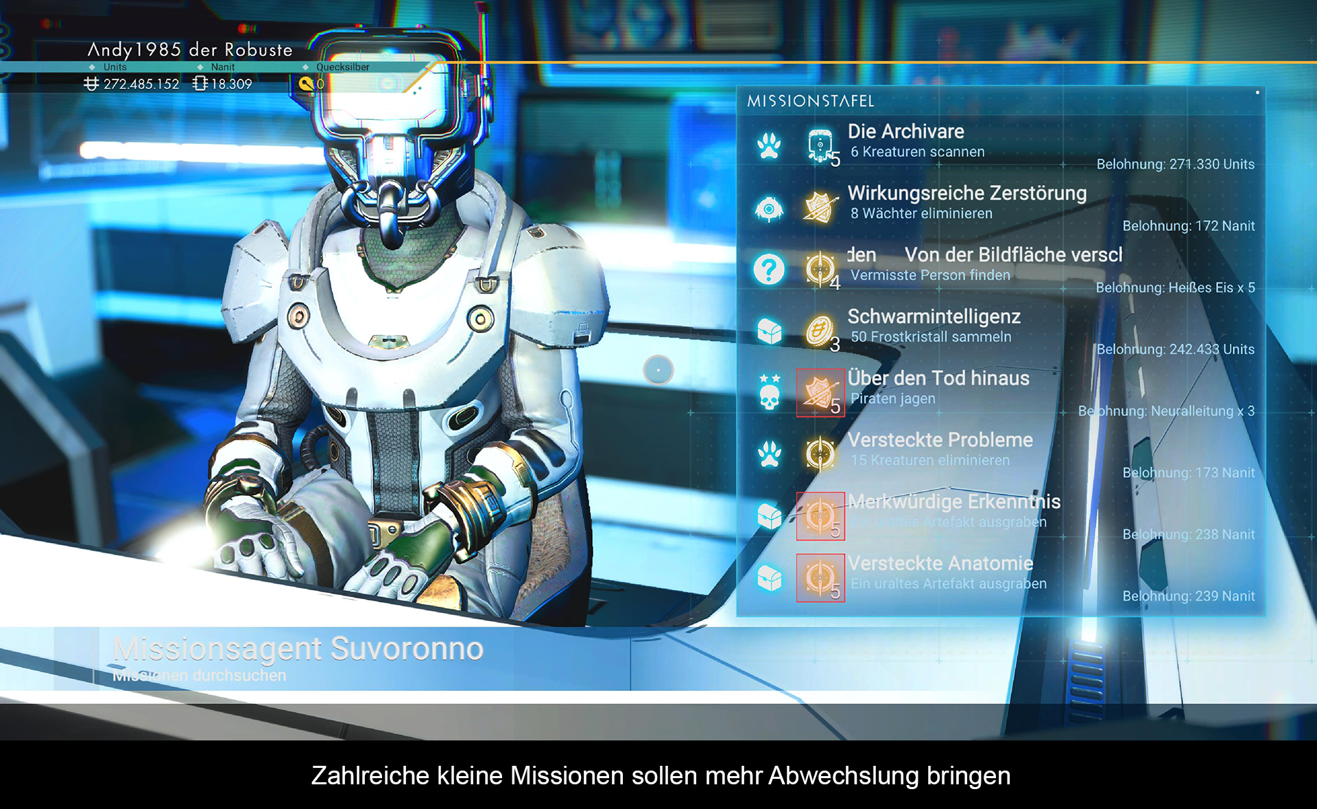 Um mehr Kontext in die Geschichte zu bringen, wurden Planeten und Raumstationen generalüberholt. Auf den Planeten findet man nun Tempel und Archive, welche kleine Hintergrundgeschichten liefern. Auch gibt es nun mehr bewohnte Basen, wo sich NPCs herumtreiben. Den radikalsten Umbau haben jedoch die Raumstationen erlebt. Gab es hier früher nur 2-3 NPCs, trifft man nun wesentlich mehr KI gesteuerte Figuren. Auch findet man nun deutlich mehr Geschäfte vor, die unterschiedliche Ausrüstung verkaufen. Besonders erwähnenswert ist der Gildenvertreter. Hier kann man für die unterschiedlichen Rassen und Gilden diverse Aufgaben erfüllen, die auch gut entlohnt werden. Jedoch sind die Missionen einfach gestrickt und es reicht oft, Kreaturen zu scannen / zu töten, oder einen Gegenstand auf einen anderen Planeten zu bringen. Eine wesentlich interessantere Quest-Reihe, die sich im Laufe der Handlung ergibt, ist die Suche nach einem biologischen Schiff und einer Unterwasserbasis.