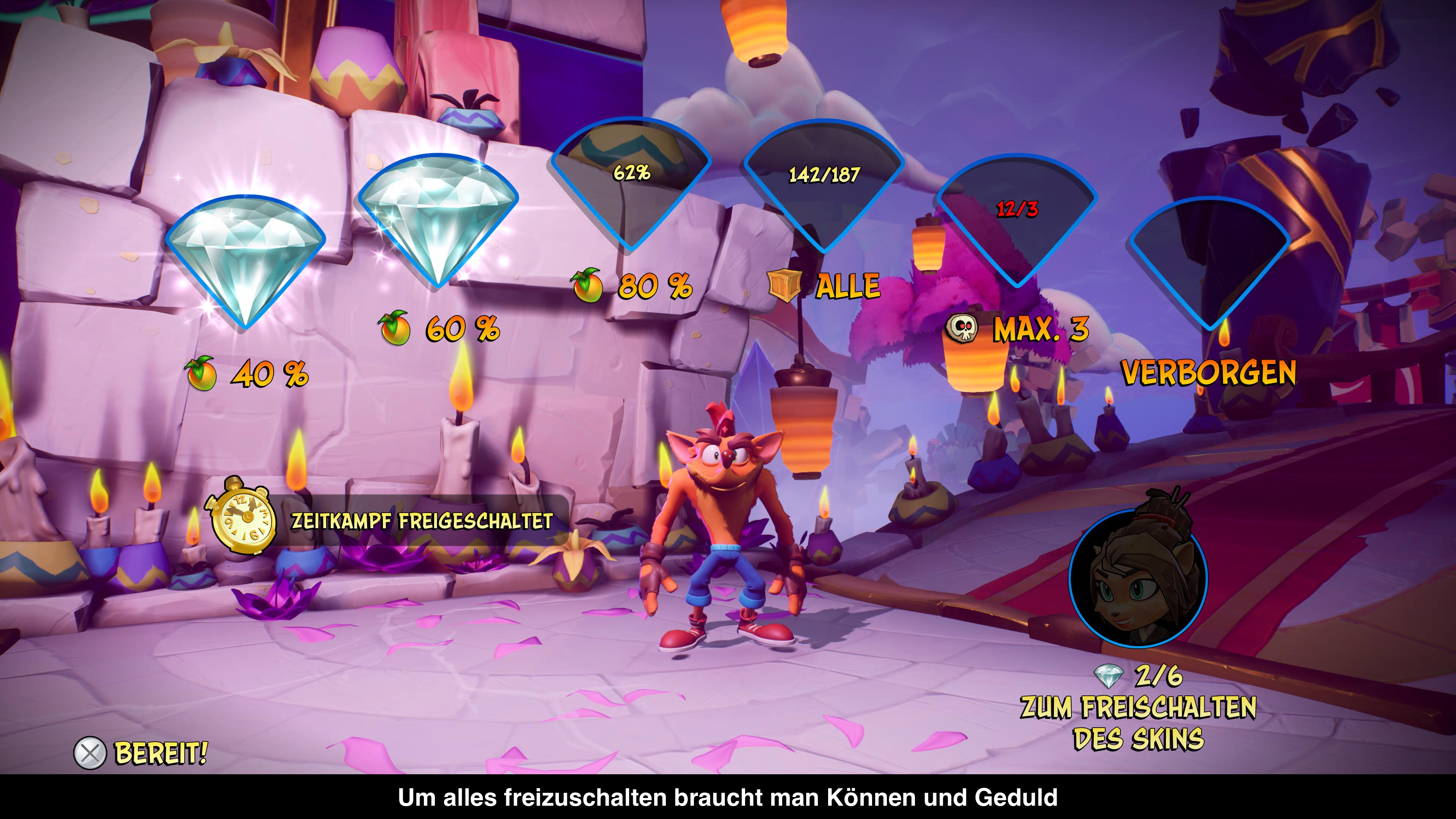 Wem das alles aber zu langweilig ist, kann übrigens auch auf eine Vielzahl von Herausforderungen zurückgreifen, um das Spiel entsprechend schwer zu machen. Das fängt mit kleinen Bonus Arealen in den Leveln an, steigert sich dann mit den Vorraussetzungen um alle Kristalle in einem Level zu erlangen und schließt dann mit speziellen Herausforderungen ab, die man auch erst freischalten muss. Spätestens die Herausforderungen sind nichts mehr für den Otto-Normal Zocker. Leider verstecken sich hinter vielen der Sonderaufgaben auch Skins die man freischalten kann, um das Aussehen von Crash & Co. im Spiel anzupassen. Den meisten dürften diese aber wohl verwehrt bleiben.