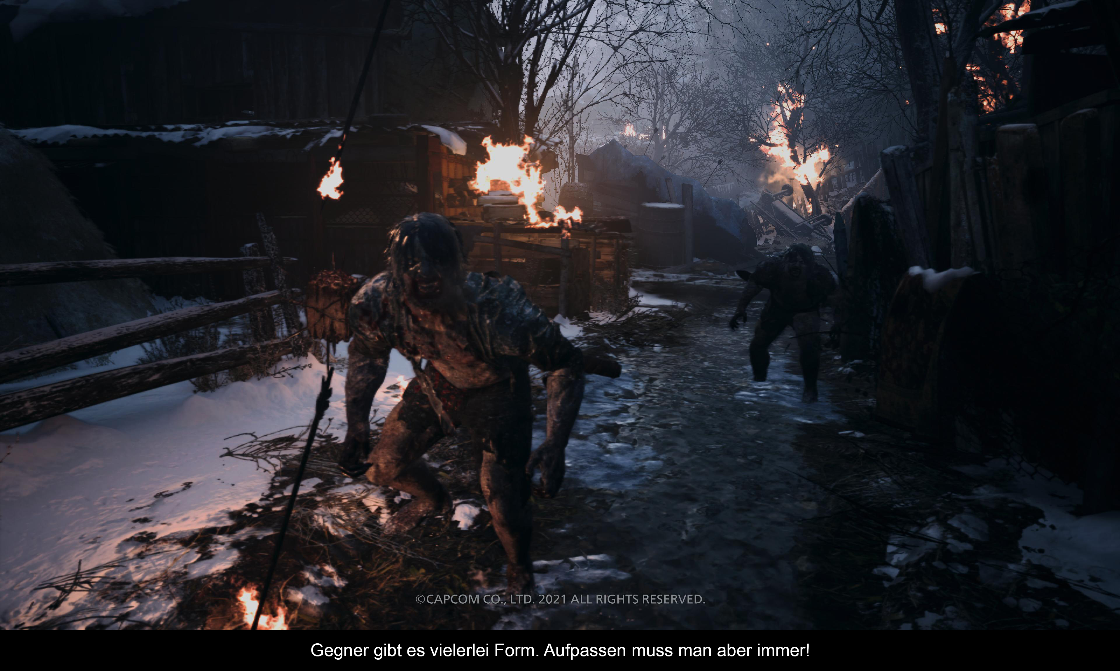 Je nach Schwierigkeitsgrad variiert die Spiellänge, wobei ein Lauf durchaus zwischen 8 bis 13 Stunden dauern kann. Was die Struktur des Spiels angeht, bietet es einen Mix aus Rätseln und Schieß-Passagen. Wie schon beim 7. Teil wird das Geschehen erneut aus der Ego-Shooter-Perspektive dargestellt. Einen VR-Modus sucht man dieses Mal jedoch vergebens. Wobei dies dem Spiel um ehrlich zu sein keinen Abbruch tut. Während Horror-Elemente beim 7. Teil noch im Vordergrund standen und dank VR nochmals intensiviert wurden, ist der allgemeine Ablauf nun deutlich Action-reicher. Zugegebenermaßen hat mich das Spiel doch sehr an den legendären 4. Teil der Serie erinnert. Und zwar nicht nur aufgrund der spektakulären Action, sondern auch aufgrund des europäischen Settings und der Rückkehr des Händlers, wo ihr zwischendurch immer wieder gegen Bares eure Waffen aufwerten oder eure Ausrüstung nachfüllen könnt. Waffen gibt es im Übrigen im großen Umfang, wodurch auch Item-Management wieder mal eine große Rolle spielt, da es keine Truhen gibt, wo ihr die Waffen einfach verstauen könnt. Gleichzeitig könnt ihr beim Händler auch spezielle Buffs anfertigen lassen, die zum Beispiel eure Resistenz steigern. Ein cooles Feature, welches sich vor allem in den höheren Schwierigkeitsgraden absolut auszahlt. Das Geld für eure Upgrades bekommt ihr im Übrigen vornehmlich durch den Verkauf von Kristallen, die ihr von besiegten Gegnern erhält. Und was eure Feinde angeht, erwartet auch ein Best Of an Resident Evil Gegner-Varianten: Von klein und wendig bis hin zu groß und gefährlich. Ein Wermutstropfen bei den Gegnern war jedoch die Tatsache, dass diese nur geringfügiges Feedback zeigen, wenn man auf sie schießt. Ein bisschen mehr Realismus beim Knall von Patronenhülsen hätte der Atmosphäre nicht geschadet. Das größte Highlight bleiben jedoch die epischen Bosskämpfe, wo ihr teilweise mit Bildschirm-füllenden Monstern konfrontiert wird. Strategisches Denken bleibt hierbei jedoch meistens außen vor, da es oftmals nur darum geht, so oft wie möglich auf das jeweilige Monster zu schießen, um diesen schließlich zur Strecke zu bringen. Das große Spektakel macht jede einzelne Auseinandersetzung dennoch absolut sehenswert. Gerade in den spektakulären Bosskämpfen zeigt sich Capcoms langjährige Erfahrung mit der RE Franchise. Gleichzeitig hilft es auch, dass der Dual Sense in der Lage ist, jede Waffe mit seinem eigenen Rumble-Profil auszustatten. Die Steuerung von Resident Evil Village mag zwar nicht so präzise sein, wie zum Beispiel die von Call of Duty, aber das gute Force Feedback macht dabei einiges wieder wett.