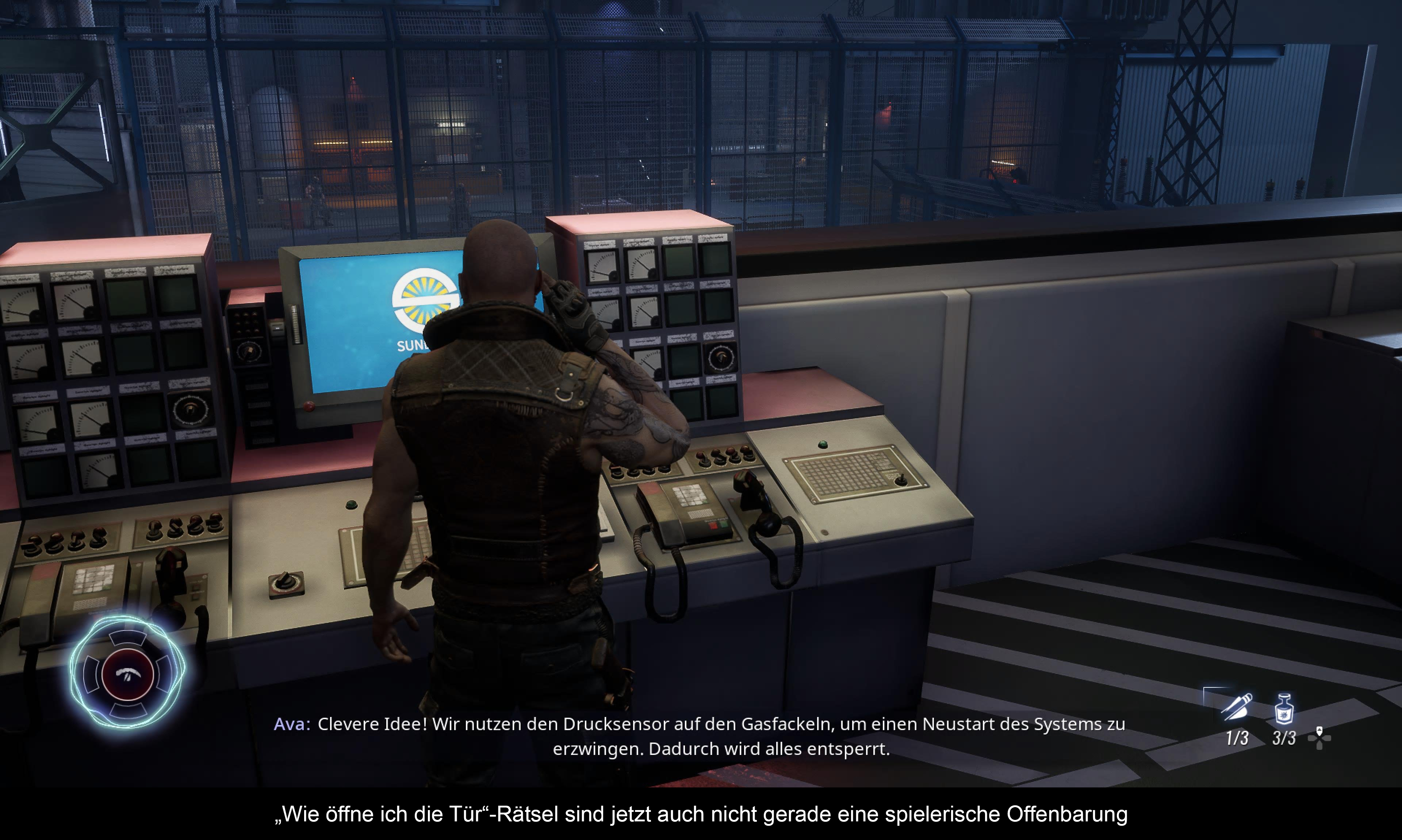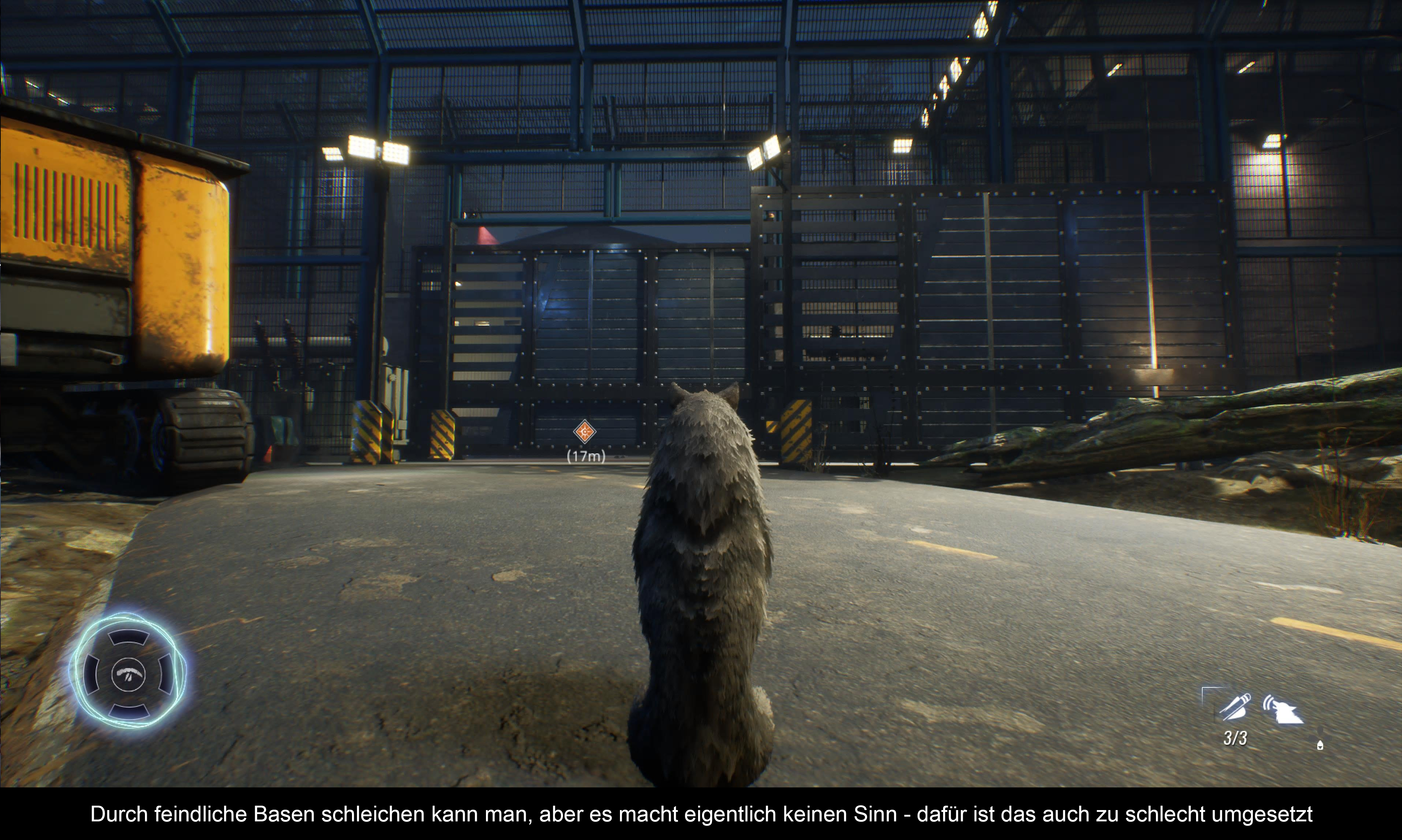 Das Gameplay ist schnell erklärt. Man findet sich in einem größeren Gebiet wieder – zum Beispiel einem Wald oder einer Wüste. Dort erledigt man erst kleinere „Basen“ und dann knackt man den Jackpot. Ein paar Nebenaufgaben gibt es auch – aber die sind weder relevant, noch der Mühe wert. Ist man bei einer „Basis“ – ja ich weiß, Vorposten oder so trifft es vielleicht besser – angelangt, dann kundschaftet man es aus, öffnet Türen, schaltet Kameras und Geschütztürme aus und versucht natürlich von keiner Wache gesehen zu werden. Natürlich kann man die auch meucheln (alternativ auch mit Miniarmbrust), aber das ist eher nervig, als lohnend. Zumal, man die Tore für Verstärkung zwar deaktivieren kann aber, wenn man nicht alle schafft, dann kommen auch aus den defekten Türen neue Soldaten raus. Aber wie gesagt, warum sich den Stress machen? Eigentlich kann man sich auch gleich ins Gefecht stürzen. Dazu verwandelt man sich per Knopfdruck in die Crinos-Form und mischt alles und jeden mit dem recht simplen Kampfsystem auf.