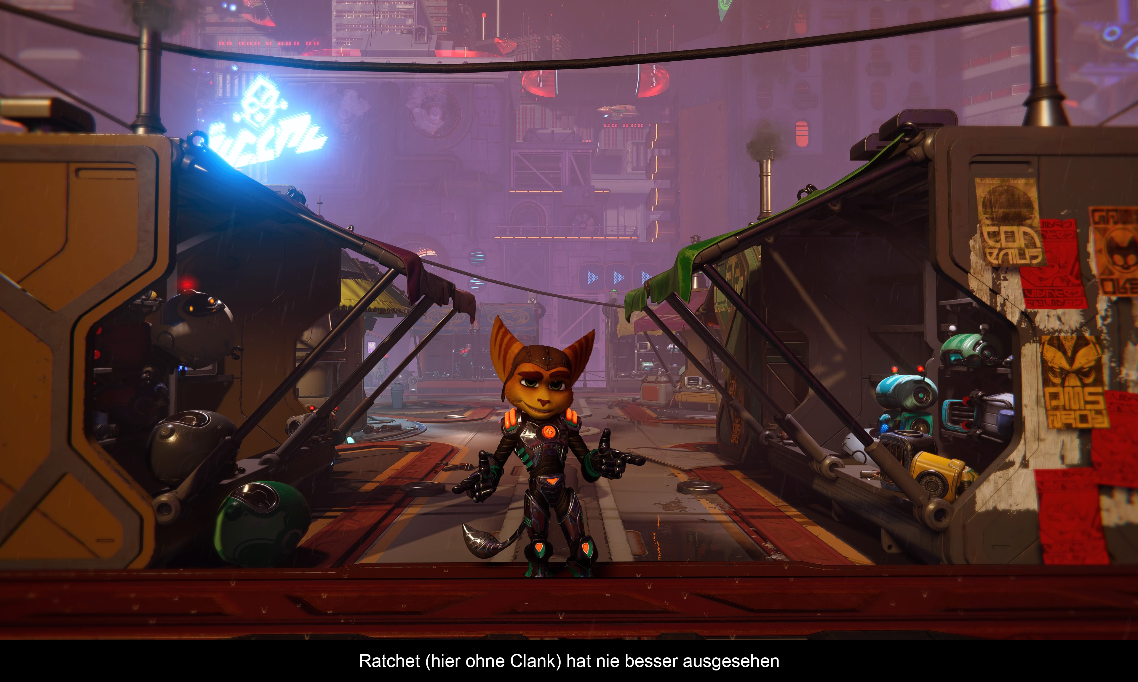 Seit dem ersten PS3 Ableger hat diese Serie den Ruf, wie ein spielbarer Animationsfilm zu sein und der neueste Teil bekräftigt diese Aussage ebenfalls. Die PS5 erlaubt es zudem, aus verschiedenen Grafikmodi zu wählen. Deshalb kann man sein Spielerlebnis ganz an seine Vorlieben anpassen (für alles in einem Modus ist jedoch auch die PS5 zu schwach). So steht ein 4K 30fps Modus mit aktiven Raytracing zur Verfügung, aber auch ein 4K 60fps Modus, ohne Raytracing. Den Mittelweg bietet ein Modus mit 60fps, aber nur 1080p Auflösung, dafür aber mit aktiviertem Raytracing. Via Update kam noch ein 120hz Modus dazu, der mit 1080p, 40fps und minimalem Raytracing läuft. Die 40fps sind deshalb gewählt, weil es ein Drittel der möglichen Bildwiederholrate ist und äußerst flüssig läuft – zumindest in der Wahrnehmung flüssiger als 30fps. Was hier aus der Konsole herausgeholt wurde, schreit regelrecht nach Next-Gen Feeling. Die Spielewelt wirkt lebhaft und lädt an vielen Stellen zum Staunen ein. Selbst bei hektischen Gefechten mit jeder Menge bombastischen Effekten geht die Framerate nicht in die Knie. Das Beste sind jedoch die Ladezeiten, die praktisch nicht vorhanden sind. Das Spiel wechselt flüssig von Gameplay zu vorgerenderter Szene. Auch bei einem Spieletot ist man nach einer Sekunde gleich wieder am Start. Es ist schon beeindruckend, in wieweit eine schnelle Festplatte (SSD) das Spielgeschehen beeinflussen kann. Auch sollte man die unzähligen, liebevollen, Details der Figuren loben. Wer im Fotomodus an die Helden heranzoomt kann sogar feine Fellhärchen erkennen. Generell wurde sehr viel Zeit in die Animation der Figuren investiert. Statt auf Motion Capturing zu setzen, wurden alle Figuren per Hand animiert. Was sie im Endeffekt noch eine Spur lebendiger erscheinen lässt. Auch die Synchronisation ist auf relativ hohem Niveau und musikalisch gibt es auch kaum was zu kritisieren. Naja, vielleicht nur das entfallene Video der Musical Nummer! Bleibt nur noch die Einbindung des neuen DualSense Controllers zu erwähnen, denn auch das wurde durchdacht integriert. Ähnlich wie bei „Returnal“ werden die unterschiedlichen Waffenmodi mit den Triggern ausgelöst. Leicht Draufdrücken für einen Einzelschuss und Durchziehen für Dauerfeuer bzw. je nach Waffe unterscheiden sich die Funktionen. Wer sich bislang fragte, wie weit man das haptischen Feedback ausnutzen kann, sollte beim zweiten Durchgang den Pixelator mal genauer beobachten.