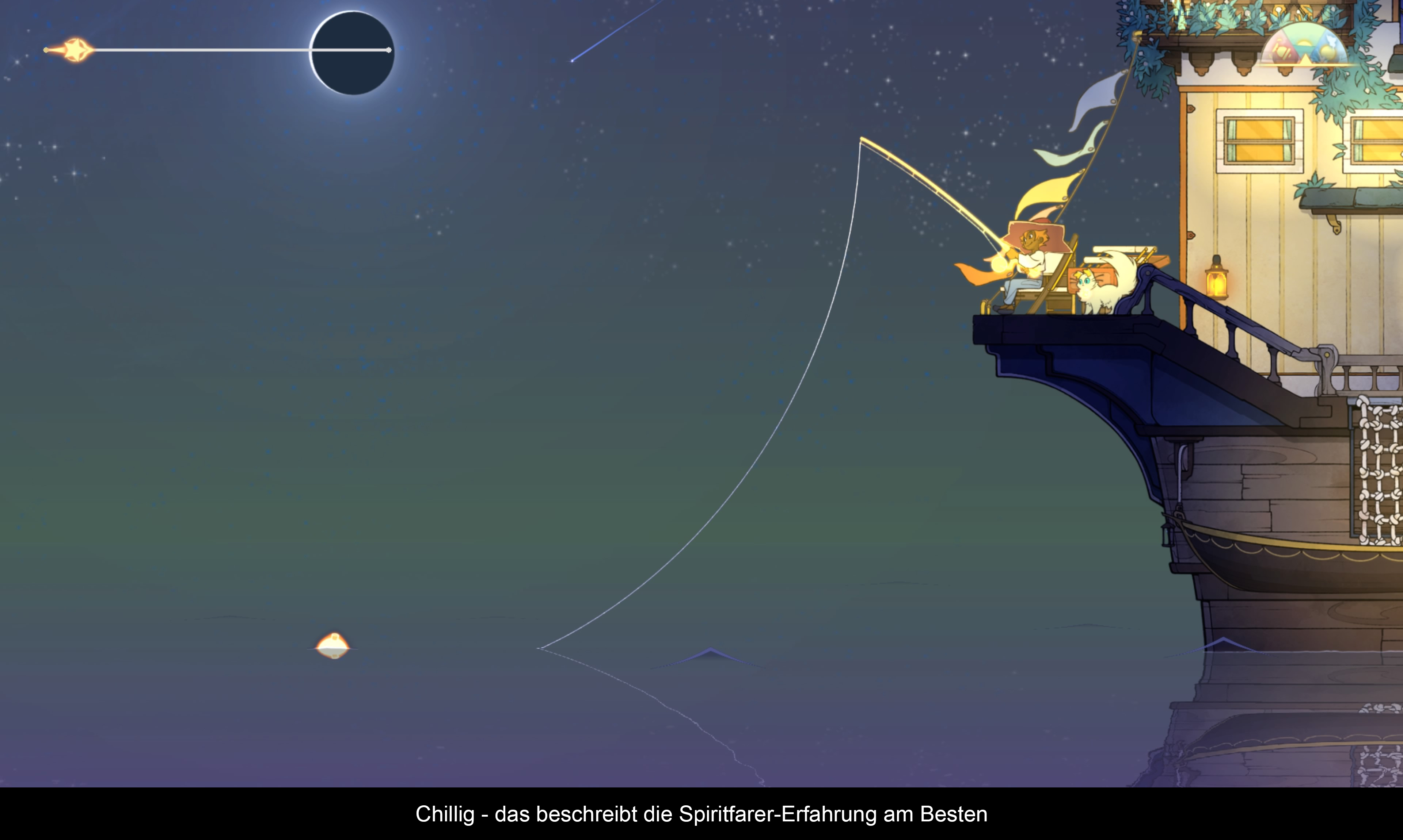 „Spiritfarer“ präsentiert sich in reinem 2D. Der Stil erinnert dabei an Aquarellmalereien und wirkt fröhlich, hell und mitunter wunderschön. Mir persönlich hat vor allem der Tageszeitenwechsel gefallen. Und nicht gerade selten habe ich mich dabei erwischt, wie ich einfach nur geangelt, dabei die Wellen beobachtete und mich in der traumhaften Welt verloren habe. Die Animationen der Figuren sind ebenfalls flüssig und detailliert. Genauso wie die zahlreichen Hintergrundgrafiken, Drachen, Schildkröten und Ereignisse. Die Ladezeiten könnten allerdings einen Tick kürzer sein und die Auflösung höher. Denn gerade wenn herangezoomt wird, verlieren die Figuren an Schärfe. Vorteile, wenn man das Spiel auf der PS5 spielt, gibt es übrigens nicht. Die englische Sprachausgabe beschränkt sich nur auf wenige Worte, dafür jedoch nimmt die musikalische Untermalung eine wichtige Rolle ein und besitzt einen großen Anteil an der Wohlfühlatmosphäre.