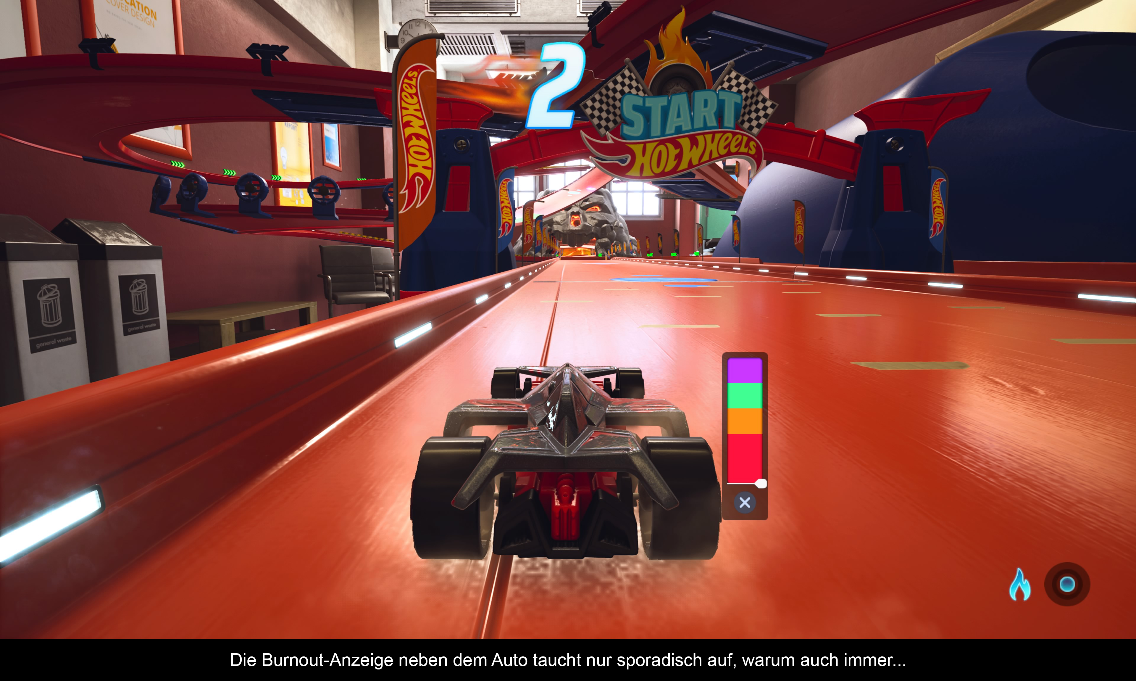 Das visuelle Design fängt den markanten Hot Wheels Look gut ein. Die Autos sehen wirklich haargenau so aus, wie ihre Spielzeugvorbilder. Die Proportionen stimmen, die Materialanmutung passt und die vielen Details (u.a. unterschiedliche Lackfarben) stehen den Boliden gut zu Gesicht. Streiten kann man sich über die Fahrzeugwahl – neben unzähligen Fantasy-Autos gibt es auch ein paar lizenzierte Modelle und diverse aus Film und Fernsehen bekannte Mobile wie den Turtles-Wagen. Am Ende kann man es natürlich nicht jedem recht machen, aber bei der riesigen Auswahl an Hot Wheels Vorbildern, hätten es schon mehr als 80 Autos sein können. Vor allem wenn man sich die „Überraschungsmechaniken“ im Spiel vor Augen führt. Auch hilft es nicht, dass schon mehrere (!) Season Pässe angekündigt wurden. Aber zurück zur Grafik: Die Streckenbauteile glänzen mit hübschen Reflektionen und Lichteffekten, die Umgebungen fallen dagegen trist und langweilig aus. Es gibt keine grünen Landschaften, keine coolen Wohnungszimmer oder eine Spielzeug-Hot Wheels Stadt. Garage, Baustelle, Skatepark, Uni und Keller sind eben nicht gerade spektakulär und ähneln sich auch noch. Immerhin sind die Ladezeiten kurz und die Framerate läuft flüssig über den Schirm. Was jedoch ein regelrechter Griff ins Klo ist: Der Soundtrack – gefühlt fünf ähnlich klingelnde Jingles wechseln sich im Minutentakt ab – sowas Nerviges mussten meine Ohren schon lange nicht mehr ertragen. Der Rest ist auch nur Durchschnitt – vor allem die Motorengeräusche wubbern überhaupt nicht und klingen eher wie Staubsauger.
