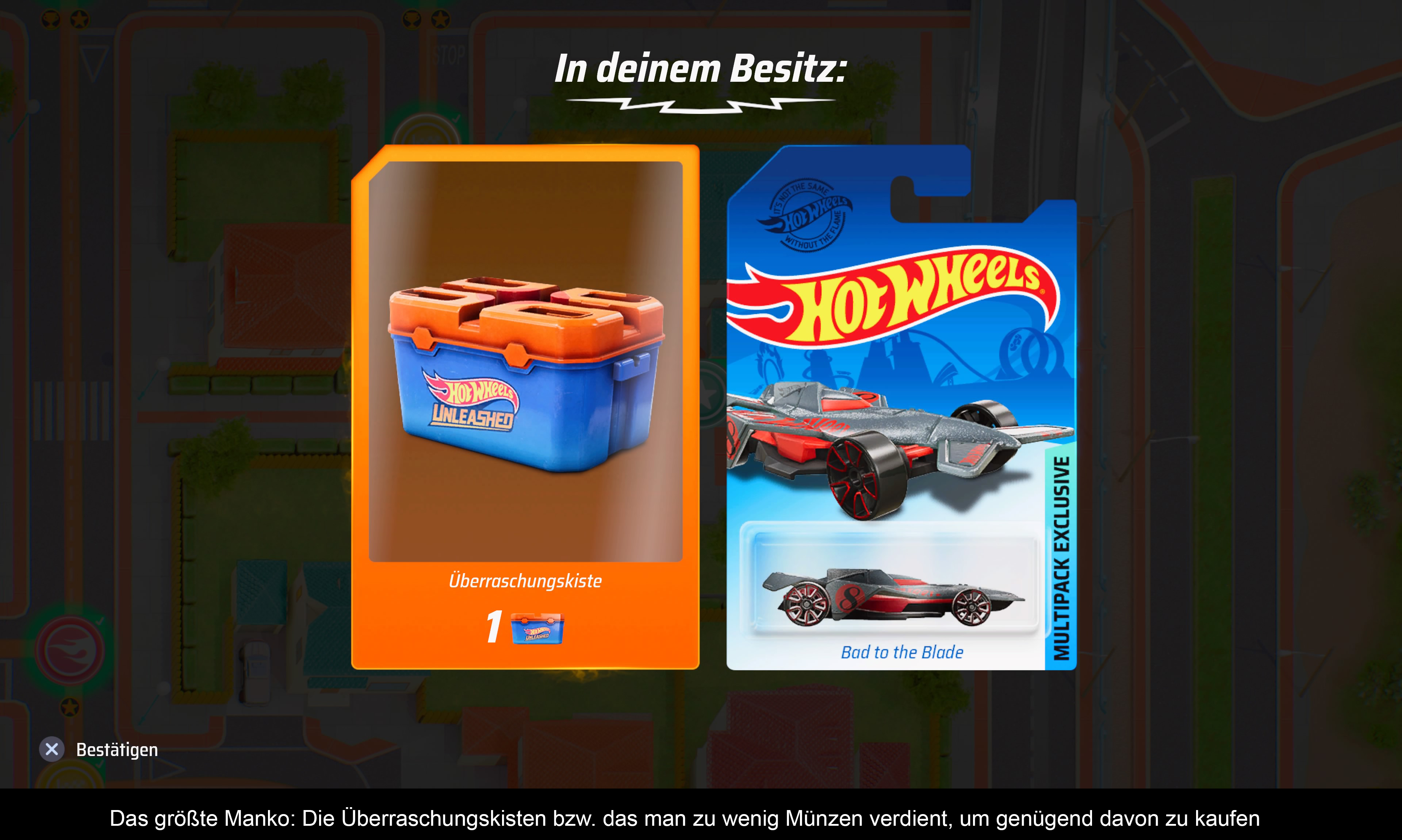 In „Hot Wheels Unleashed“ existieren zwei Spielwährungen. Zum einen gibt es Zahnräder, die man zum Tunen des Wägelchens braucht (200 oder 500 Stück). Gewinnen kann man diese in den Kampagnenrennen, oder wenn man Hot Wheels Autos verschrottet. Die zweite Währung sind goldene Münzen. Damit kann man neben spezifischen Hot Wheels (kosten auch mal 1200 Münzen; die Auswahl rotiert alle paar Stunden) für jeweils 500 Taler Überraschungsboxen kaufen. Da ist dann natürlich ein Hot Wheel drin, dass man entweder schon hat, oder nicht. Doppelte Fahrzeuge kann man wie bereits geschildert verschrotten, oder man verkauft es für 300 Münzen. Manchmal bekommt man in der Kampagne auch Autos bzw. Überraschungsboxen geschenkt. Ebenso gewinnt man ein paar Münzen bei Rennen. Aber da braucht es schon eine Handvoll gewonnener Events, damit man sich eine Überraschungsbox leisten kann. Alternativ kann man auch z.B. über das „schnelle Rennen“, Münzen gewinnen, da gibt es 50 Stück pro Sieg – also muss man 10 Rennen fahren, damit man wenigstens eine Box kaufen kann. Nach der Hälfte des Spiels hatte ich gerade einmal 1/3 der Hot Wheels freigeschaltet. Wie ich die Sammlung komplettieren soll, ohne endlos in den „schnellen Rennen“ zu grinden – keine Ahnung!