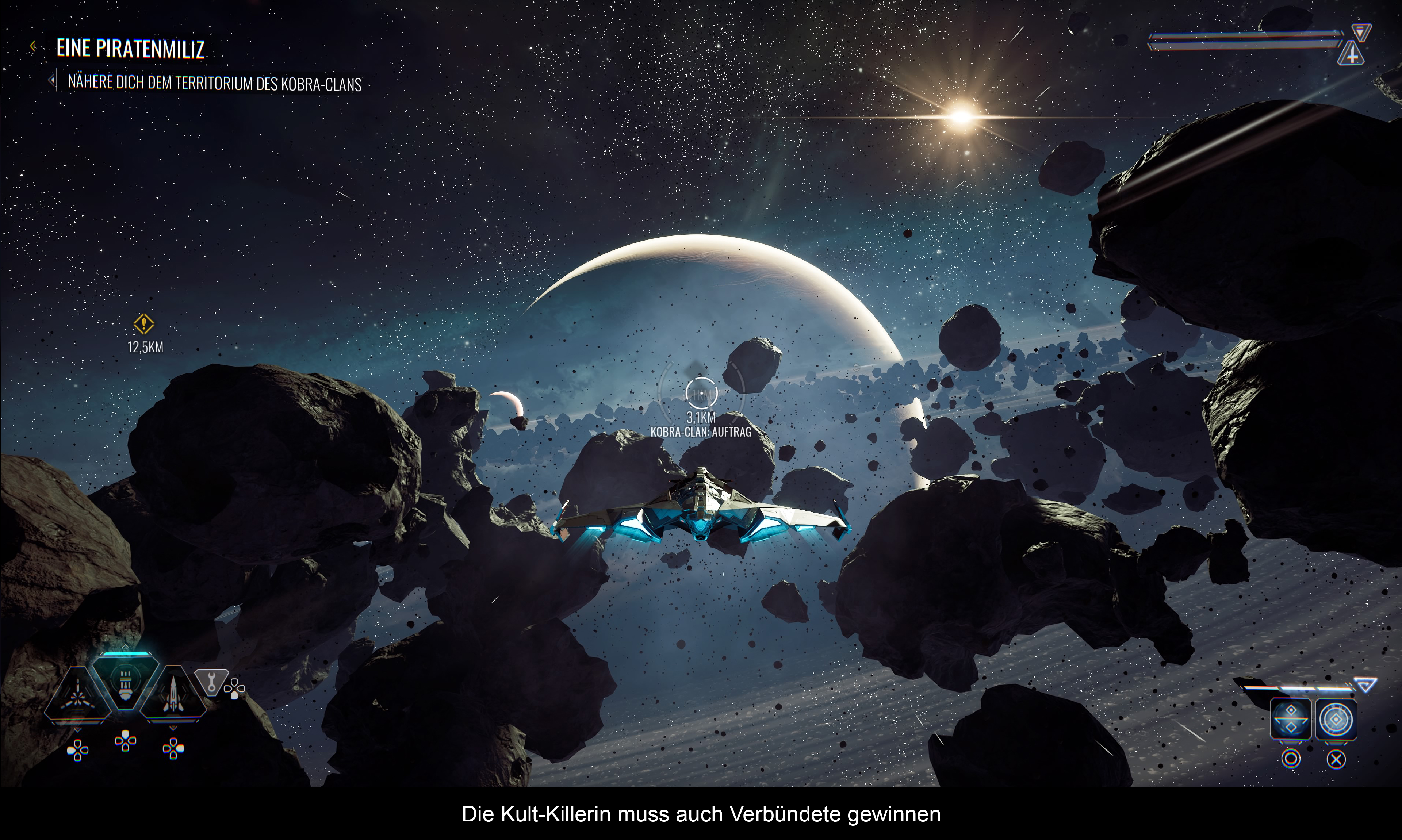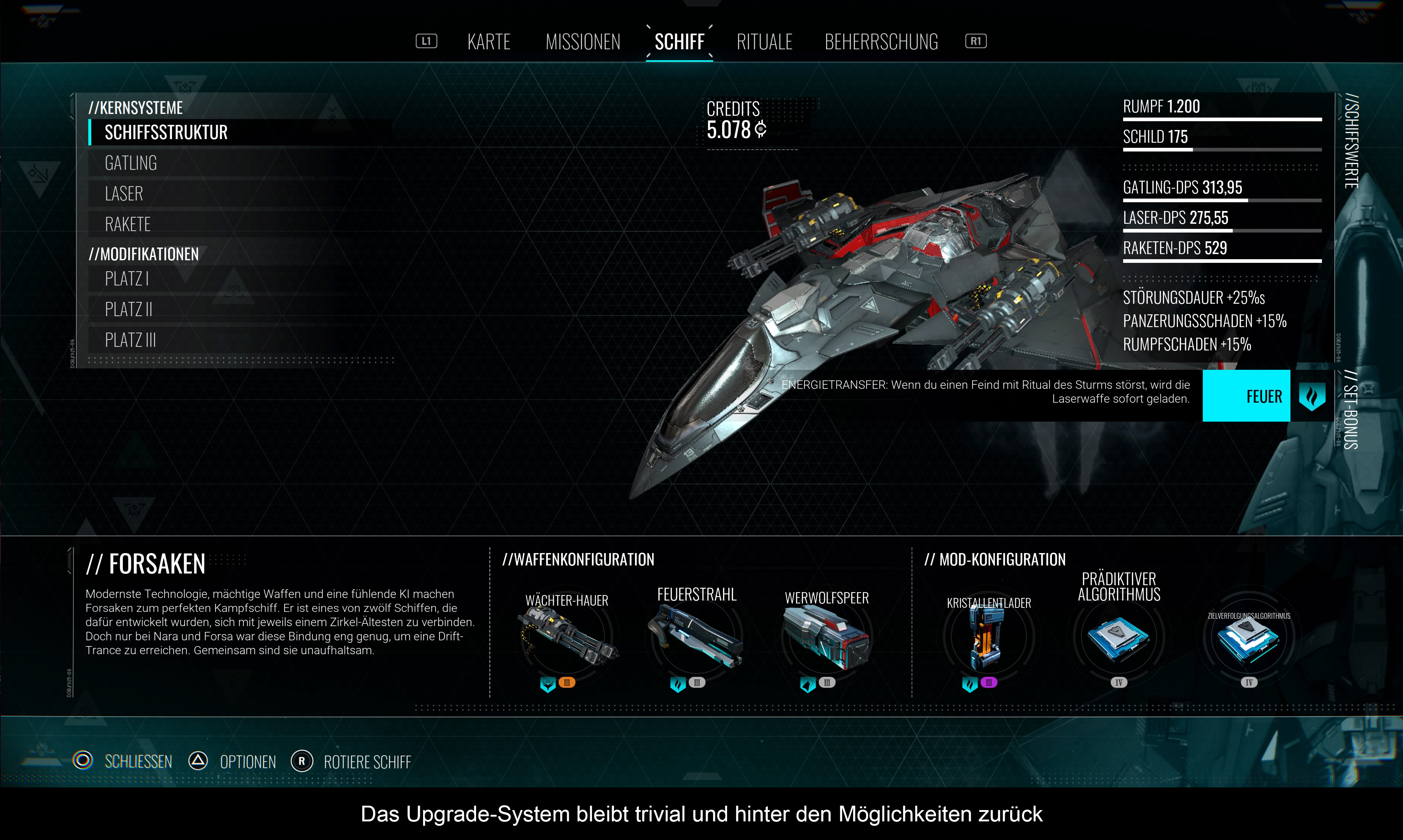 Die Steuerung orientiert sich klar an Ego-Shooter, oder besser gesagt: An den Flugmissionen von „Call of Duty: Infinite Warfare“. Mit allen Vor-und Nachteilen. Auf der einen Seite, sieht man hier wenigstens sein Schiff von hinten (es gibt keine Ego-Perspektive), auf der anderen Seite ist das größte Problem das Bremsen, denn das geht nur via linkem Stick und dauert zu lange, wenn man gerade boostet und driftet. Deshalb passiert es vor allem in Höhlen oder riesigen Raumschiffen, dass man irgendwo unfreiwillig dagegen knallt – was oft auch dem Ableben gleichkommt. Das Driften (L1) soll zwar schnelle Wendungen ermöglichen, aber die Wahl der Taste ist dafür eher unglücklich. Schließlich nutzt man L2 für den Nachbrenner. Mit dem rechten Stick kontrolliert man die Blickrichtung, während R2 dazu dient, die Waffe abzufeuern. Davon gibt es drei Typen: Gatling, Laser und Raketen. Verschiedene Gegner verlangen nach unterschiedlichen Taktiken: Laser sind gut für Schilde, Raketen dezimieren gelbe Panzerung und Gatling-Kanonen feuern vor allem schnell hintereinander. Später erlernt man diverse spirituelle Rituale, welche zusätzliche Fertigkeiten mit sich bringen. Vor allem wertvoll: Das Ritual des Sturms, mit dem man Feinde zum Trudeln bringt und deren Schilde ausschaltet. Daraufhin geben sie perfekte Ziele ab. Interessant ist sicherlich auch das Ritual der Jagd, bei dem man schnell an ein Ziel heranspringt, um es dann durch das Ritual des Sterns (Energiespeer) zu zerstören. Die letzte Kraft (Ritual der Kontrolle) bekommt man für meinen Geschmack zu spät, um damit noch sinnvoll was anstellen zu können. Ansonsten nutzt Nara ihre übersinnlichen Fähigkeiten auch zum Scannen der Umgebung (um wichtige Punkte aufzudecken) und zum Erleben von Weltraum-Erinnerungen.