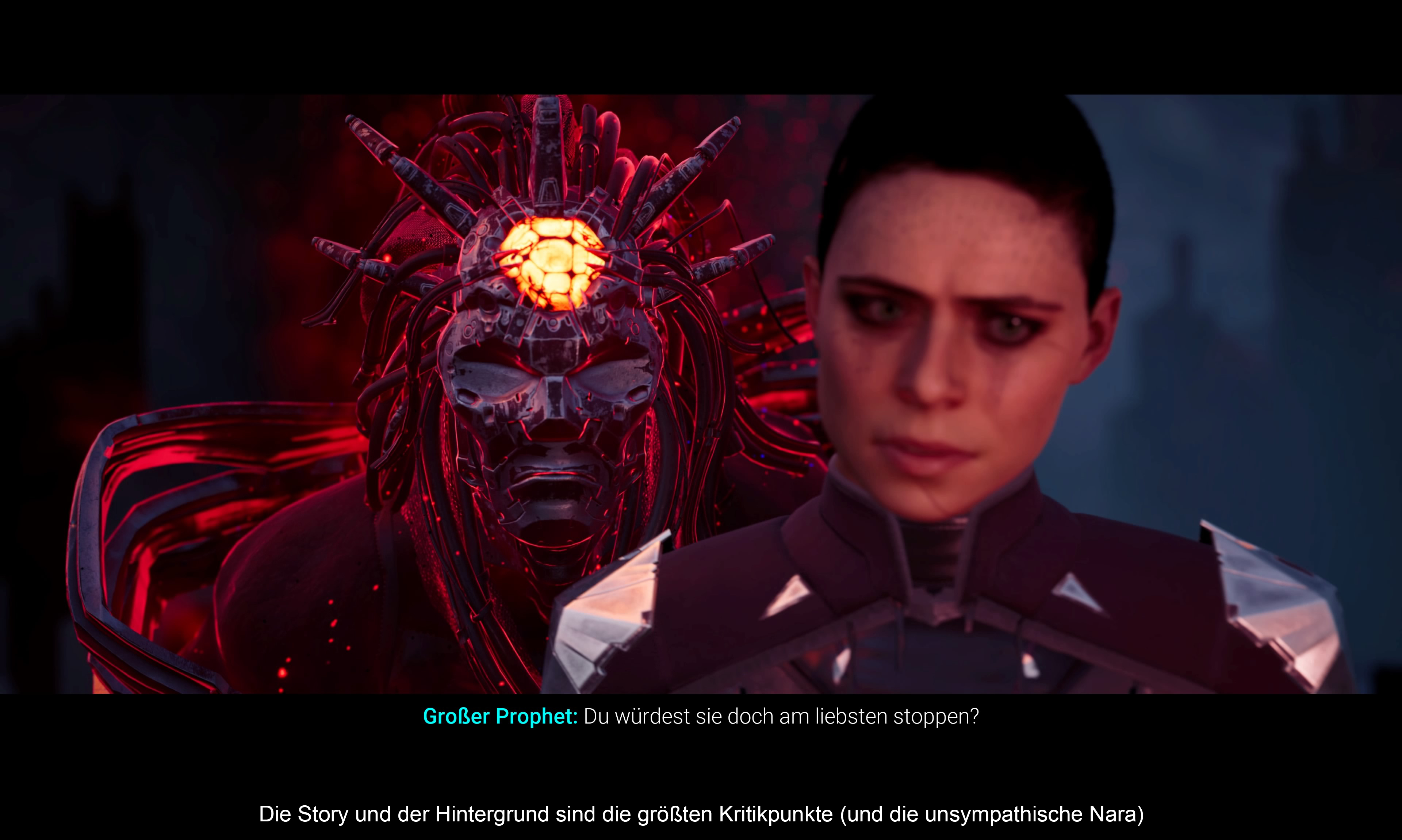 Mein größtes Problem mit dem Spiel ist die Story bzw. der Hintergrund im Allgemeinen. Man kann zwar erahnen, was den Entwicklern vorschwebte, aber der hier präsentierte Weltraum-Horror kann nicht überzeugen. Dazu ist die Geschichte einfach zu doof – ihr habt richtig gelesen, zu doof. Das fängt bei dem Kult an (Stichwort Chorus = Harmonie mit dem Universum), geht mit dem Propheten weiter (das bekommt man schon im Vorspann mit), nervt noch mehr mit esoterischen Unfug wie ausserdimensionalen Emotionen die zu manifestierten Gesichtslosen werden und hört bei der Spielfigur auf. Nara oder Naran (wie sie vorher hieß) ist total unsympathisch und vor allem, man nimmt ihr die Bekehrung (schließlich hat sie Milliarden von Menschen getötet) einfach nicht ab. Dagegen ist ihr Partner in Crime - eine dämonische Schiffs-KI namens „Forsaken“ regelrecht vernünftig. Fragt sich bloß, welcher Schlauberger darauf kam, dass man doch auch Kosenamen verwenden könnte. Eine fremde Entität, welche in einen Schiffsrumpf eingesperrt wurde, spreche ich nicht mit „Forsa“ an. Zwar klärt sich am Ende doch noch etwas auf, aber selbst diese Botschaft (hah, das wird an der Stelle nicht verraten) wirkt wenig überzeugend. Zuviel Hybris, pseudo-religiöses Geschwafel und belehrendes Gesappel vermiesen jeglichen Spannungsaufbau. Wie es richtig geht, zeigt zum Beispiel die „Dead Space“-Reihe. Aber das hier – nein danke.