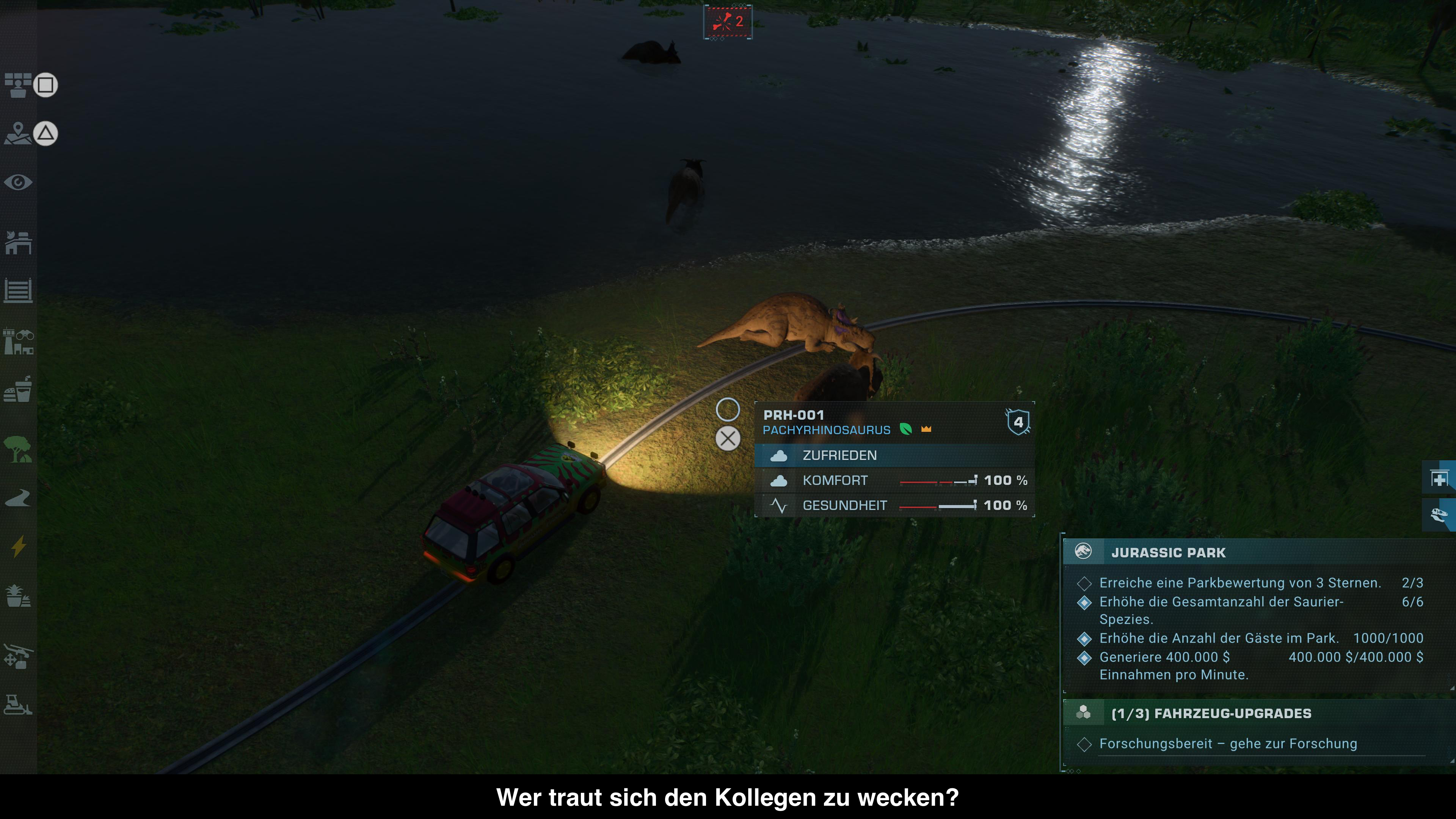 Nach der Kampagne seid ihr aber bereit für den zweiten großen Modus des Spiels, die Chaos-Theorie. Hier bekommt ihr die Aufgabe die Saurier-Parks der fünf Filme nachzubauen und idealerweise passiert dies ohne Katastrophen. Hier fängt das Spiel eigentlich erst so richtig an. Denn plötzlich müsst ihr nicht nur für die Saurier sorgen, sondern auch noch für die Gäste im Park und die wollen natürlich unterhalten werden. Und nur glückliche Gäste lassen ihr Geld im Park. Zudem können Katastrophen wie Tornados für ungewollte Herausforderungen sorgen, wenn Saurier plötzlich frei herumlaufen. All das sorgt für eher schlechte Kundenbewertungen. Aber natürlich geht es in erster Linie um die Saurier. Ihr müsst also auf Expeditionen gehen und neue Fossilien finden aus denen ihr dann die Gensequenzen extrahiert um neue Saurier zu züchten. Dabei könnt ihr das Genom sogar modifizieren und beispielsweise das Aussehen oder den Charakter der Saurier anpassen. Beispielsweise können Saurier resistenter gegen Krankheiten werden oder sind weniger Streitlustig. Das könnt ihr wiederum ausnutzen um mehrere Saurier-Arten in einem Gehege zu halten. Dieses Optimieren des Parks ist erstaunlich süchtig und sobald man verstanden hat wie alle Systeme ineinandergreifen, läuft alles ziemlich entspannt. Leider erklärt das Spiel die verschiedenen Möglichkeiten eher schlecht und manches erfährt man nur per Zufall.