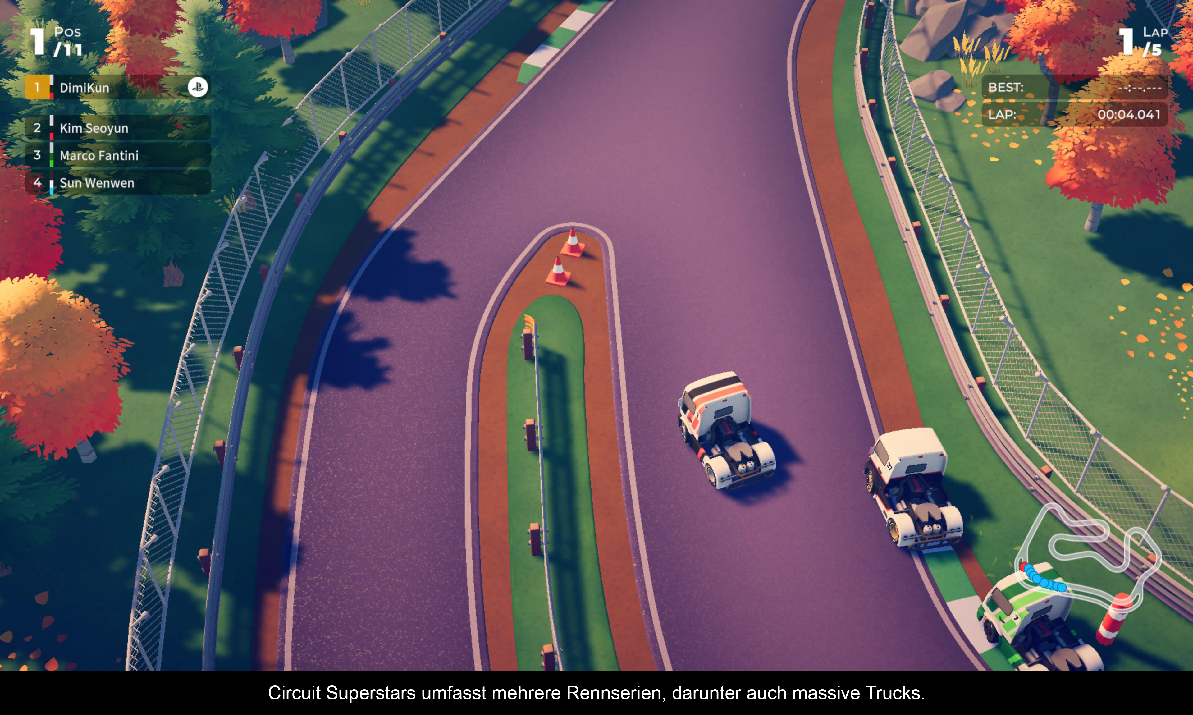 Direkt zu Beginn fällt auf, dass Circuit Superstars große Ambitionen hat. Von Anfang an stehen einem unter dem Menüpunkt „Grand Prix“ nämlich stolze 12 Rennserien zur Verfügung. Angefangen mit getunten Straßenwagen über wuchtige Renn-Trucks bis hin zu imposanten Muscle Cars und sogar F1-Boliden. Dem Spiel mangelt es zwar an offiziellen Lizenzen, aber selbst Laien erkennen sofort mit was für Fahrzeugen man es in den einzelnen Rennserien zu tun hat. Jede einzelne Serie ist dann nochmal in 4 Strecken unterteilt, deren Rennlänge von 5 bis maximal 12 Runden variiert. Hinzu kommen 5 verschiedene Schwierigkeitsgrade, die zusammenfassend eine richtig gute Lernkurve bieten. Doch spätestens beim höchsten Schwierigkeitsgrad sollte man zumindest schon mal die Strecken auswendig können, da euch die Gegner absolut keinen Raum für Fehler erlauben. Das Spiel selber umfasst insgesamt 18 verschiedene Strecken, die allesamt ein eigenes Layout besitzen. So gibt es unter anderem einfache Strecken mit langen Geraden und wenigen Kurven, aber auch auch herausfordernde Pisten, wo man eine Kurve nach der nächsten meistern muss, um als Erster das Ziel zu erreichen. Erfolgreiche Rennen werden im Anschluss mit neuen Helmen oder Jubelanimationen belohnt, mit denen man dann seinen eigenen Fahrer nachträglich modifizieren und individualisieren kann. Und wer schließlich alle Grand Prix-Serien erfolgreich abgeschlossen hat, kann sein Können anschließend sowohl im Time Trial zur Schau stellen als auch im Online-Modus. Am Time Trial gefiel mir vor allem die Interaktivität des Modus, da man jede Woche neue Strecken-Kombinationen von den Entwicklern vorgelegt bekommt. Bei den Zeiten misst man sich dann gegen die Rekorde anderer Zocker, deren besten Runden man Anhand eines Online-Leaderboards nachverfolgen kann. Und auch der Online-Modus funktionierte während des Tests recht ordentlich, wobei es stets etwas dauerte bis man ein Rennen betreten konnte. Und da das Spiel zum Zeitpunkt des Tests nicht über die größte Spielerschaft verfügte, haben sich die vorhandenen Online-Gegner stets als richtig harte Konkurrenten entpuppt, weil es sich hierbei sicherlich um große und bereits eingespielte Fans des Titels gehandelt haben muss. Dennoch lässt sich zusammenfassen, dass man für rund 20 Euro ein gutes und solides Paket erhält.