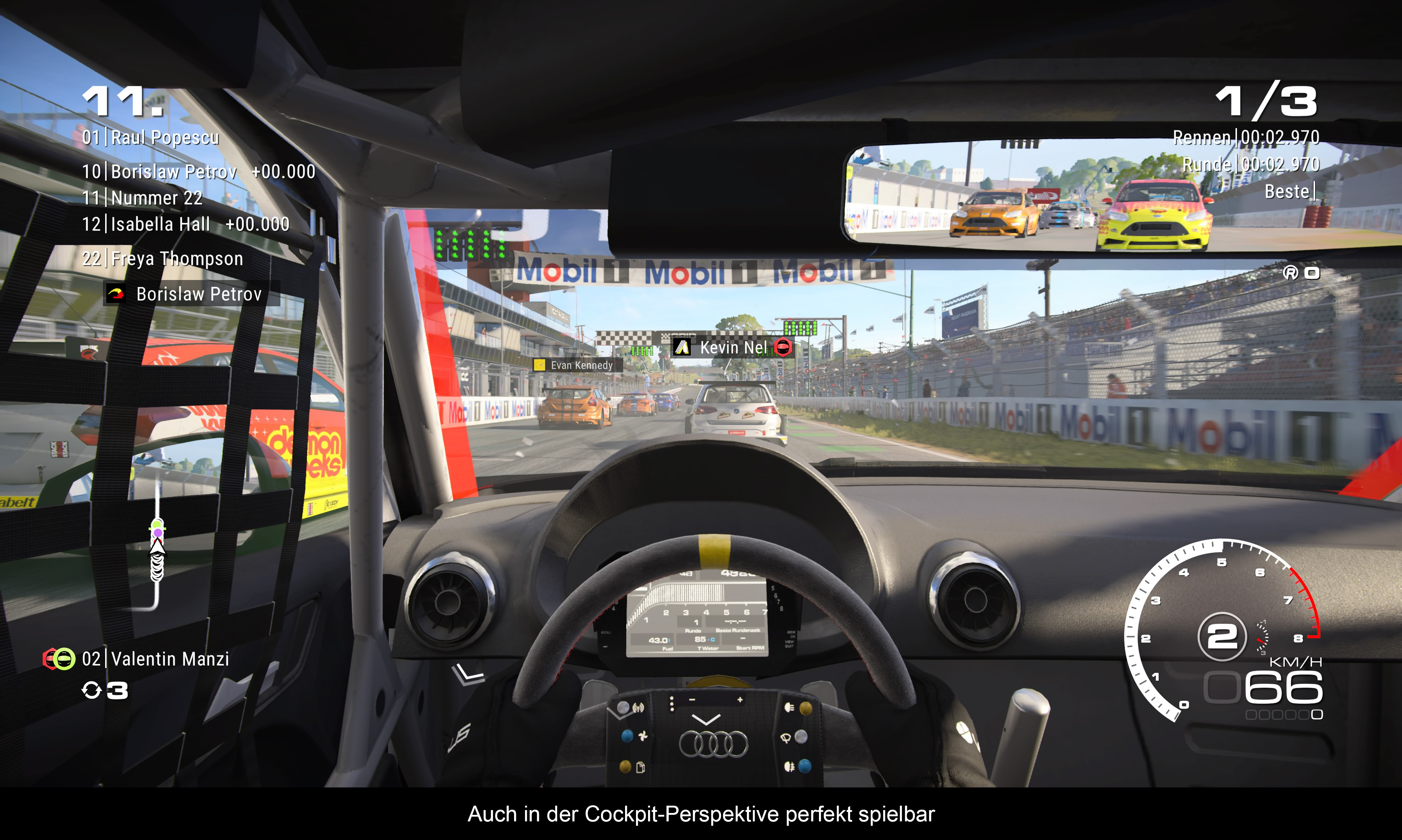 Die erste große Neuerung in „GRID Legends“ ist der „spannende“ Story-Modus. Darin schlüpft man in die Rolle eines Amateur-Rennfahrers, der mit einem Rennstall (Seneca) zu Ruhm und Ehre gelangen will. Natürlich existiert innerhalb des Teams ein Konkurrenzkampf um die Rangordnung, genauso wie es reichlich Ärger mit dem übergroßen Ravenwest Konkurrenten gibt. Somit ist genügend Material für eine spannende Geschichte vorhanden. Leider wird das nicht wirklich sinnvoll genutzt. Es gibt lediglich ein paar Live-Action Filmsequenzen zwischen den 36 Veranstaltungen. In dieser Zeit wachsen weder der Teamchef, noch die Kameraden oder die Gegner dem Spieler ans Herz. Wer auf eine Videospielumsetzung von Michell Valliant gehofft hat, darf seine Erwartungen ruhig nach unten schrauben. Ich würde das Ganze eher als eine Art langes Tutorial sehen, dass den Spieler auf die richtige (wesentlich unaufgeregtere) Kampagne vorbereiten soll.