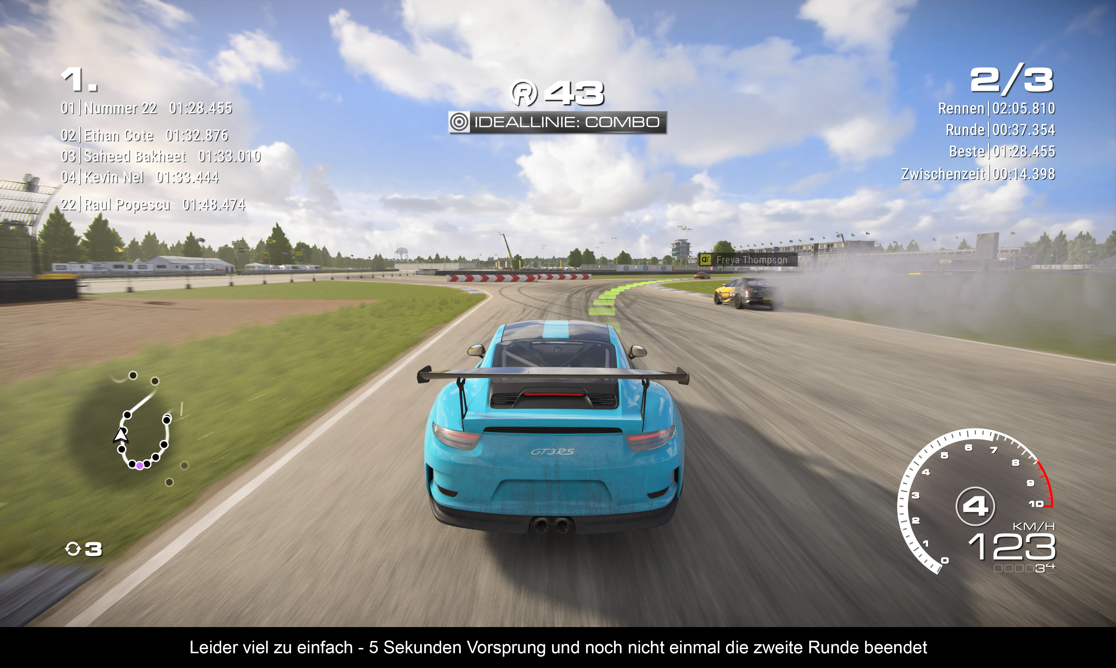 Normalerweise bin ich nicht so empfindlich, was die Soundqualität eines Videospiels betrifft. Doch was Codemasters hier abliefert, ist eine herbe Enttäuschung. Im Story-Modus fällt das weniger auf, denn dort sind die Rennen mit dramatischer Musik unterlegt. Aber sonst? Da gibt es nur die Motorengeräusche und Effekte. Und beides kommt äußerst flach und platt aus den Boxen (oder dem Headset, das habe ich übrigens auch ausprobiert, weil ich gehofft habe, dass der Mix dort besser rüberkommt, aber Pustekuchen!). Dreht man also in aller Ruhe seine Runden, dann kann einen der unaufgeregte Sound regelrecht einschläfern. Am Schlimmsten sind dabei die Elektro-Rennen – das Gesurre ist so spannend, wie einer Waschmaschine beim Waschen zuzuhören. Nee, wirklich, was haben sich die Briten dabei gedacht?