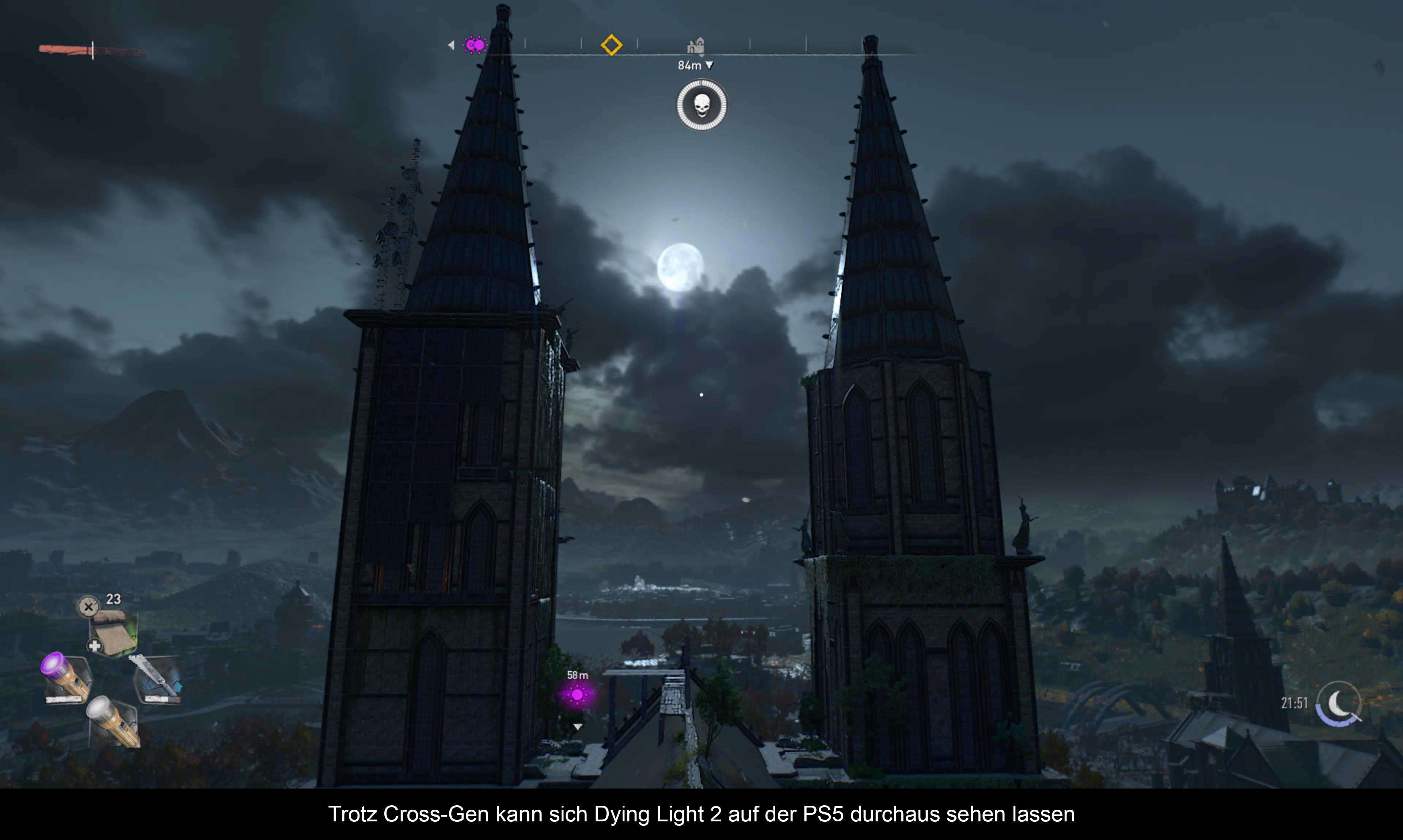 Was den grafischen Aspekt von Dying Light 2 angeht, wird man erstmal vor der Entscheidung gestellt, welchen Modus man aktivieren möchte. Während der Quality-Modus mit Ray Tracing und besseren Schatten- als auch Licht-Effekten für sich wirbt, läuft das Spiel hier leider nur mit 30 FPS und 1080p. Wer es hingegen gestochen scharf mag, kann auch den Resolution-Modus auswählen, wo es zwar kein Ray Tracing gibt, aber stattdessen immerhin eine anständige Auflösung von 4K. Aber auch hier muss man sich mit 30 FPS begnügen. Als Alternative gibt es auch noch einen Performance-Mode, den ich persönlich am Besten fand. Hier gibt es zwar Abzüge bei der Auflösung, aber immerhin läuft das Spiel durchgehend mit stabilen 60 FPS, was vor allem die Parkour-Läufe deutlich flüssiger gestaltet. Und auch mit den Abstrichen in der Auflösung sieht das Spiel immer noch ziemlich gut aus. Die Farbpalette mag zwar manchen eventuell etwas zu eintönig sein, aber was die Bauwerke und Gebäude von Villedor angeht, bietet das Spiel eine durchaus beeindruckende und imposante Stadtkulisse. Man merkt an jeder Stelle, dass viele Jahre nach dem Ausbruch sowohl die Natur als Zombies den Kampf gegen die Menschheit klar gewonnen haben. Aber auch die Animationen können sich sehen lassen. Vor allem die Parkour-Runs, die einen wesentlichen Bestandteil des Spiels ausmachen, sind äußerst agil und mit einem guten Momentum versehen. Etwas unverständlich fand ich jedoch die träge Hauptmenü, wo das Wechseln einer Seite nur mit etwas Verzögerung durchgeführt wird. Sowas darf es in einem Spiel dieser Größe eigentlich nicht gebebn. Abschließend möchte ich auch noch auf die akustische Untermalung von Dying Light 2 eingehen, die ihren ihren Job definitiv erfüllt. Während die Hintergrundmusik absolut zur dystopischen Stimmung passt, erfüllen sämtliche Synchronsprecher ihrer Aufgabe mit vollster Überzeugung. Kaum eine Performance wirkt unmotiviert oder lieblos. Ein großes Lob verdienen auch die Zombie-Geräusche, die vor allem mit dem Pulse-Headset von Sony äußerst bedrohlich klingen.
