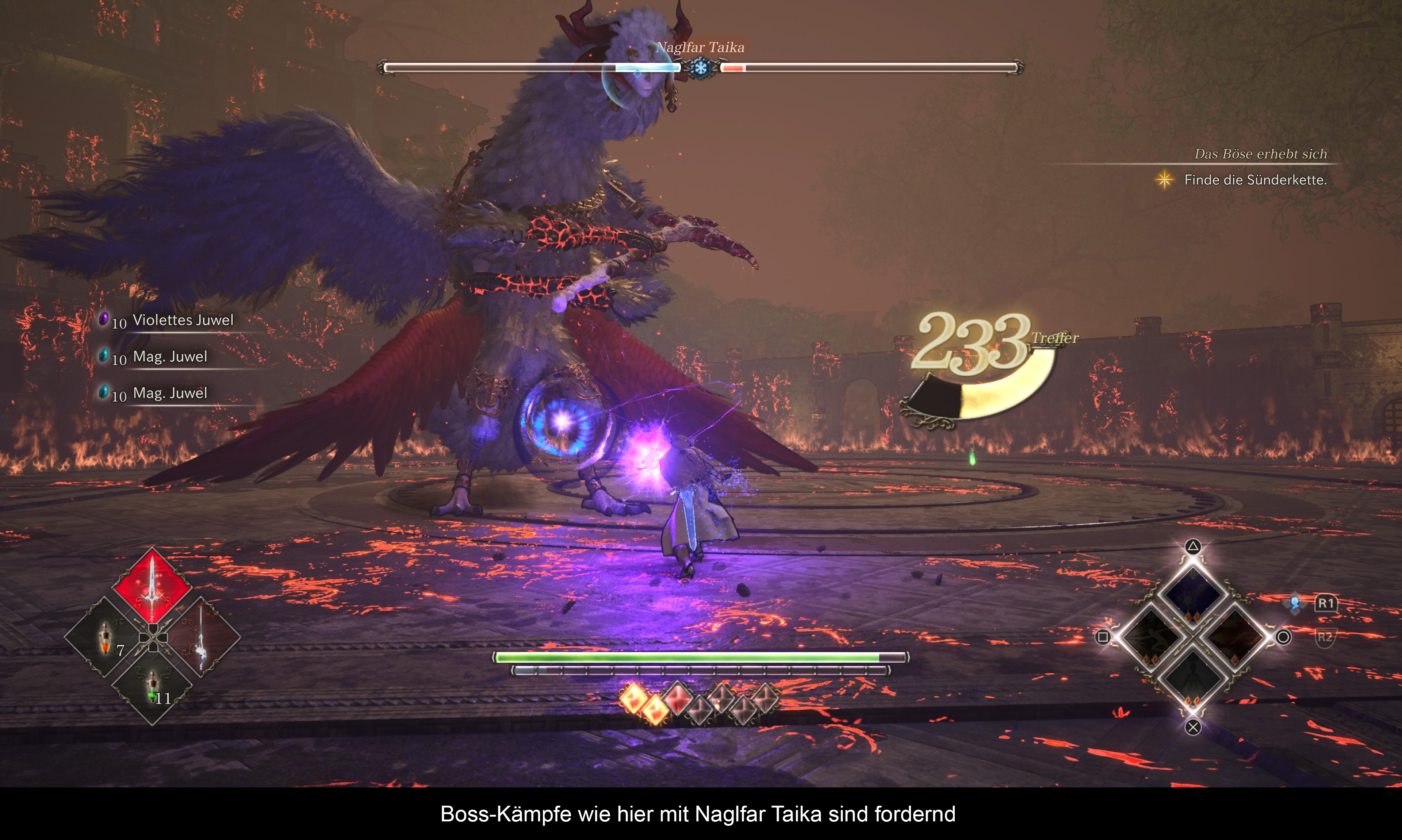 Die actionreichen Kämpfe gehen gut von der Hand und lassen kaum Frust aufkommen. Kombos kann man leicht miteinander verketten und hohe Trefferquoten sind an der Tagesordnung. Wie gesagt, die Steuerung ist einfach gehalten, was sie aber auch effektiv macht. Besser hätte jedoch die DualSense Unterstützung ausfallen sollen und müssen. Gerade die Triggertasten fühlen sich im Spiel nicht gut an. Vor allem L2 ist sensibel, das ist die Taste zum Ranspringen an einen Gegner. Dafür reicht schon ein kleiner Druck auf die Taste aus, was eben auch im Eifer des Gefechts versehentlich passieren kann. Wiederum nervt, das beim Öffnen von Türen die Taste durchgezogen werden muss und die Aktion deshalb nicht selten sofort erkannt wird.