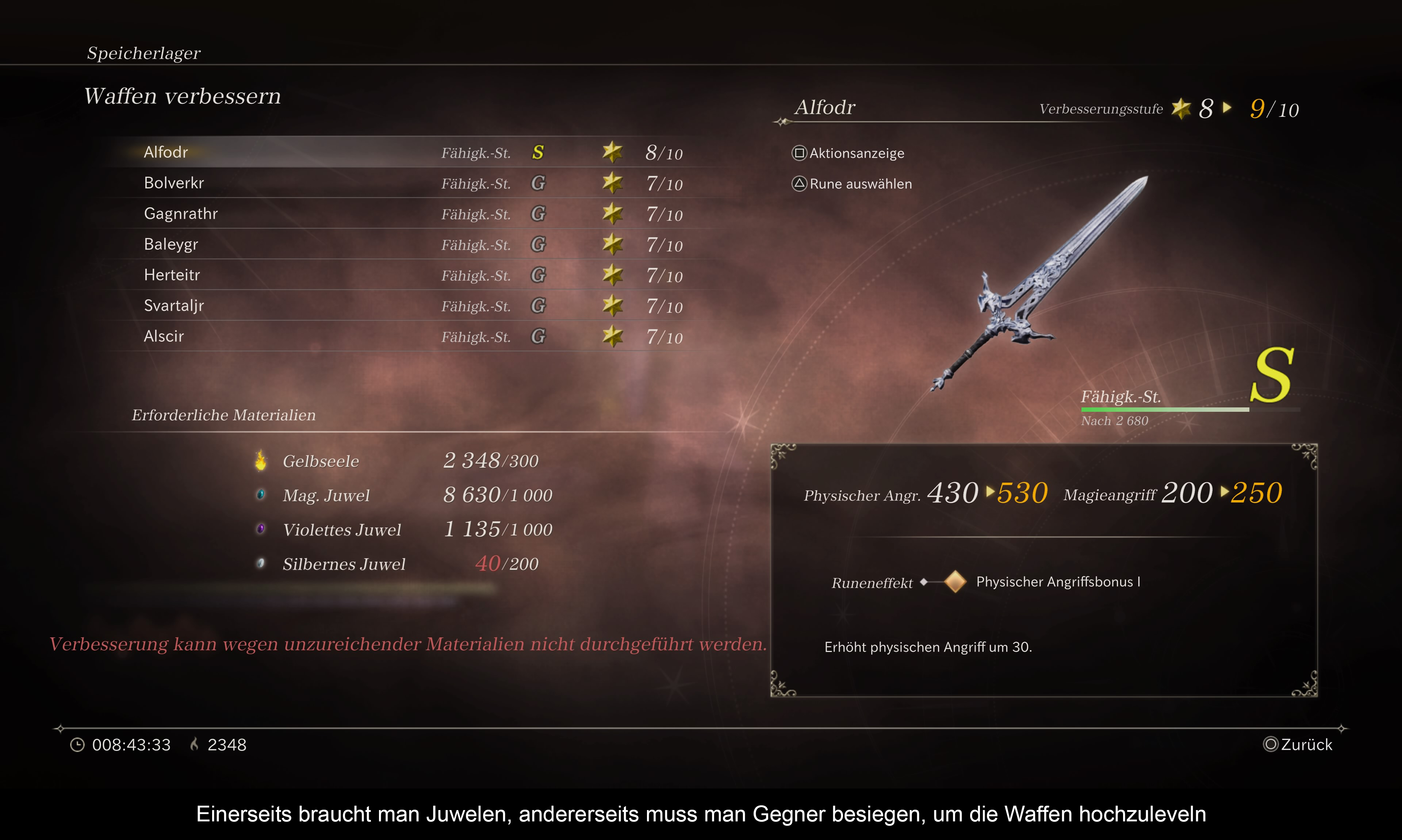 Komplex wird die Steuerung dabei zum Glück nicht: X ist zum Springen da, Kreis zum Ausweichen, Viereck zum Schlagen und Dreieck für einen Hieb. L1 ist zum Blocken da, L2 zum Ranspringen an den Gegner und Reden, R1 ruft über ein Auswahlmenü die Einherier zur Hilfe und R2 aktiviert die Zauber. Jeder Level wird zum Schluss bewertet und man kann Ränge inklusive Belohnungen erhalten. Rätsel gibt es übrigens keine, die großen Umgebungen sind dafür weitläufig und mit zahlreichen Checkpoints versehen. Auch sind die „Kapitel“ wiederholbar (um zum Beispiel weitere Seelensteine zu sammeln oder seine Wertung zu verbessern). In Asgard erstattet man Odin (regelrecht fesch gekleidet) Bericht und kann auch zahlreiche Nebenaufträge erledigen. Diese sind kurz und knackig und bringen zusätzliche Runen für Waffen und andere Sachen ein. Auch kann man die Geschichte der Einherier erforschen. Leider wird gerade das recht lieblos präsentiert. Am ehesten lässt sich das Spielgeschehen mit „Ys: The Lacrimosa of Dana“ vergleichen – wem das gefallen hat, wird auch hier seine Freude haben. Allerdings dauert diese nicht sonderlich lange an – rund 15 Stunden benötigt man bis man die verschiedenen Enden gesehen hat. Dabei stehen drei Schwierigkeitsgrade zur Auswahl, die jedoch nicht jederzeit im Spiel gewechselt werden können. Zum kompletten Leveln der Waffen und damit verbunden, den Fertigkeiten der Walküre, braucht man mehr als einen Durchlauf. Gleiches gilt auch für die Platin-Trophäe. Ein New Game Plus gibt es aktuell noch nicht, man startet am Ende immer vor dem letzten Kapitel. Aber zumindest soll es im November ein Update geben, das neben weiteren Schwierigkeitsgraden auch noch einen neuen Spielmodus namens „Hilde's Rache“ und mehr beinhalten soll.