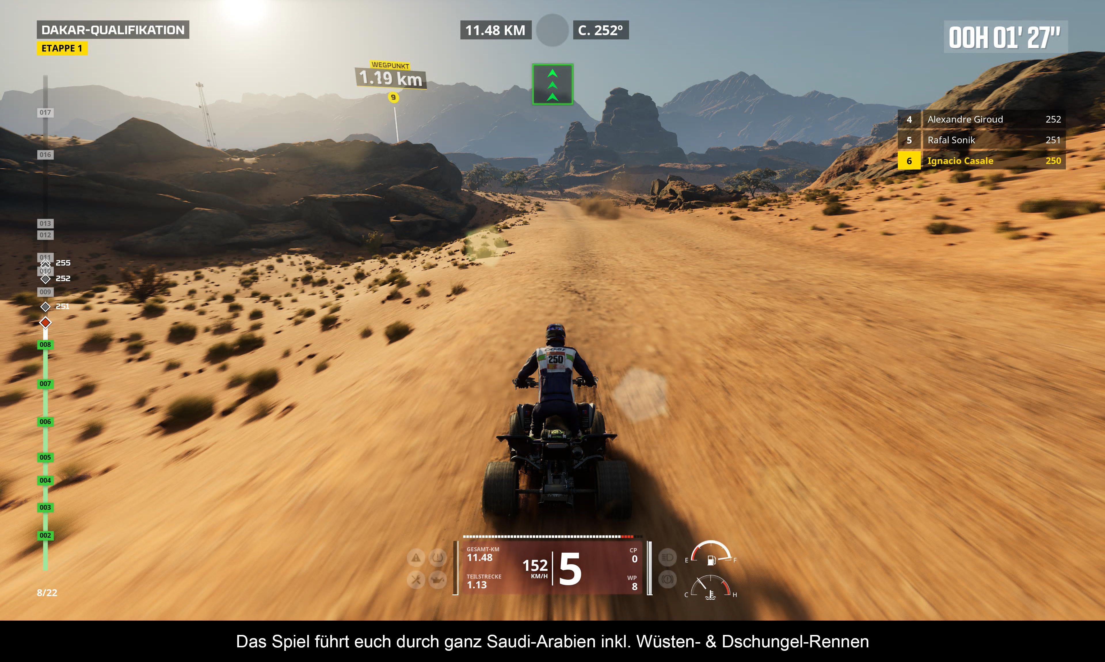 Und wo wir schon beim Thema Kurven sind. Ist Dakar Desert Rally eigentlich Simulation oder Arcade? Nun ja, die Antwort - wie so oft - ist irgendwo in der Mitte. Das Spiel verfügt nämlich über drei Schwierigkeitsgrade, die das Fahrverhalten enorm beeinflussen. Einsteigern empfehle ich an dieser Stelle, zunächst den Sport-Modus auszuprobieren, wo die Fahrzeuge ein wenig einfacher zu kontrollieren sind. Darüber hinaus wird einem auch bei der Orientierung enorm geholfen, da man hier zahlreiche Wegpunkte vorgesetzt bekommt, die man dann nachfahren muss. Werden Wegpunkte nicht eingenommen, bekommt ihr Zeitstrafen aufgesetzt. Weitere Zeitstrafen gibt es auch für Reparaturen, die vorgenommen werden müssen, wenn euer Fahrzeug zu viel Schaden genommen hat. Das Endergebnis des jeweiligen Wettbewerbs hängt dann von eurer Gesamtzeit ab. Noch kniffliger wird es hingegen im Pro-Modus, wo es keine Wegpunkte gibt und ihr die Strecke entweder der Karte entnehmen müsst oder sie von eurem Co-Piloten beschrieben bekommt. Und ab Level 25 gibt es sogar noch einen extremen Simulations-Modus, wo wirklich sämtliche Hilfen, inkl. Checkpoints oder Respawns entfernt und Kosten für Reparaturen immens erhöht werden. Für Casual-Gamer reicht der Sport-Modus jedoch absolut aus. da man sich auch hier zahlreichen Herausforderungen stellt. Denn neben der schwammigen Steuerung, die wie anfangs beschrieben ziemlich gewöhnungsbedürftig ist, hat man auch mit einer Vielzahl an aggressiven AI-Gegnern zu tun, die oftmals nichts besseres zu tun haben als wie der letzte Vollidiot in euch hinein zu rasen. Dies mag zwar extrem klingen, aber entspricht leider der Wahrheit. Selbst beim Start scheuen sich die Gegner nicht davor, euch einfach nieder zu mähen - selbst, wenn sich die AI dabei selbst aus dem Spiel nimmt und crasht. Es bleibt zu hoffen, dass dieses brutale Verhalten hoffentlich mit einigen Updates später noch korrigiert wird. Und leider gibt es neben Gameplay und AI noch einen weiteren Punkt, der euch vor große Herausforderungen stellen wird…