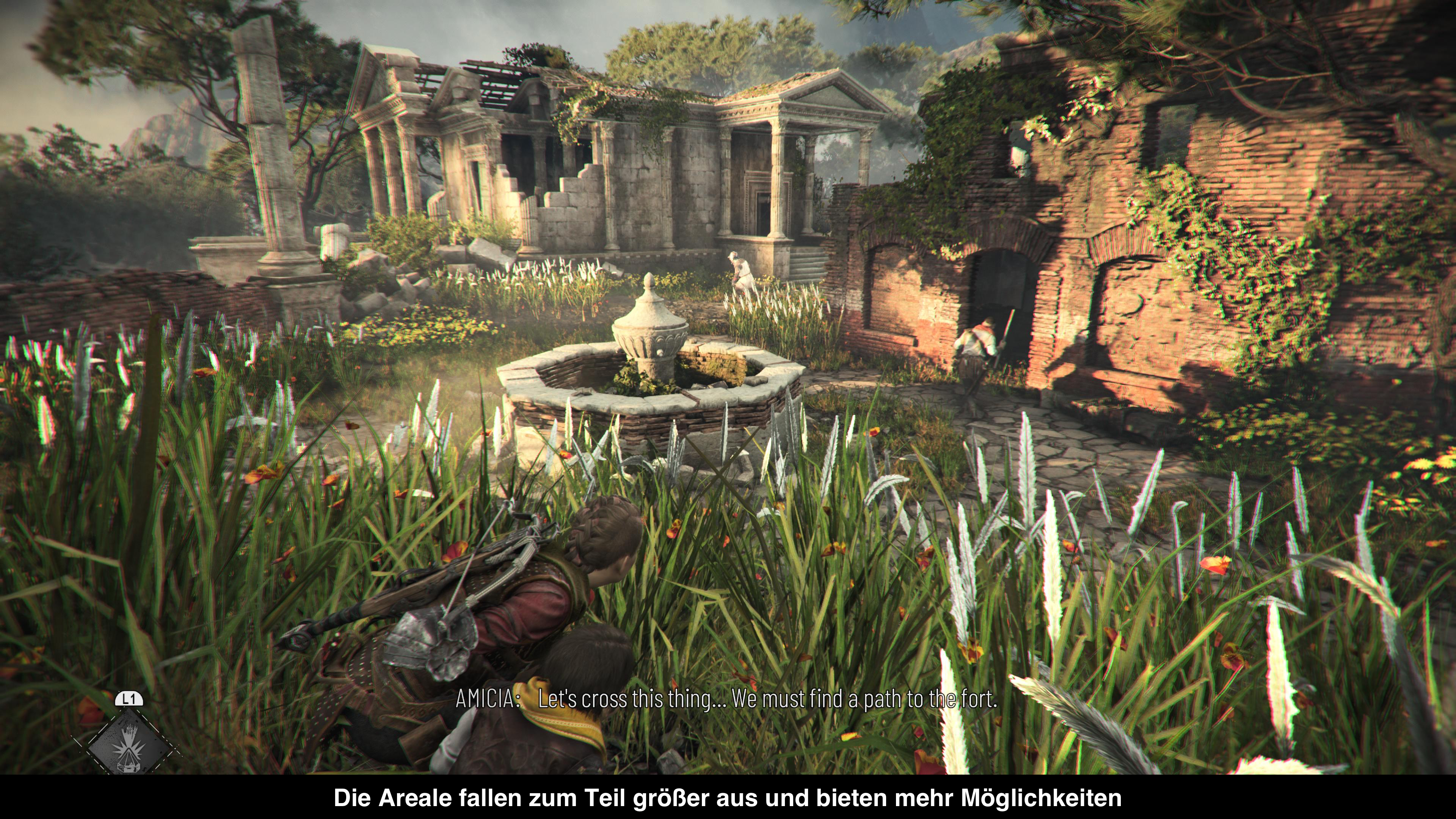 Fans des Vorgängers werden sich in A Plague Tale: Requiem direkt wohlfühlen, denn das Gameplay ist eine konsequente Fortführung. In erster Linie ist das Spiel also weiterhin ein Stealth-Spiel, aber im Notfall kann man sich auch wehren. Insbesondere in dem Aspekt hat man zugelegt. Beispielsweise hat man einen Konter-Move, um sich von Wachen zu lösen, und im Spielverlauf findet man auch Messer, die man im Notfall nutzen kann. Die Messer können aber auch für das Öffnen besonderer Schränke genutzt werden und gehen danach zu Bruch, genauso wie ein Messer nur einmal zur Abwehr genutzt werden kann. So muss man sich entscheiden, was einem wichtiger ist. Zudem erhält man im Spielverlauf auch eine Armbrust mit seltenen Pfeilen, um noch ruchloser vorgehen zu können. Ansonsten kann man die aus dem Vorgänger bereits bekannten Spezialsteine mit z.B. Feuereffekt erstellen und dann entweder im Kampf oder für kleinere Rätsel einsetzen. Es gibt aber auch neue Effekte, die wieder neue Möglichkeiten eröffnen. Überhaupt ist das Spiel nicht mehr ganz so offensichtlich dabei zu verraten, was die Lösung für eine bestimmte Szene ist und bietet mehr Möglichkeiten. Das liegt auch daran dass das Spiel auch nicht mehr so linear ist wie der Vorgänger, denn oftmals trefft ihr auf Gegner und Ratten in größeren und offeneren Arealen, die es im Vorgänger nur sehr selten gab.