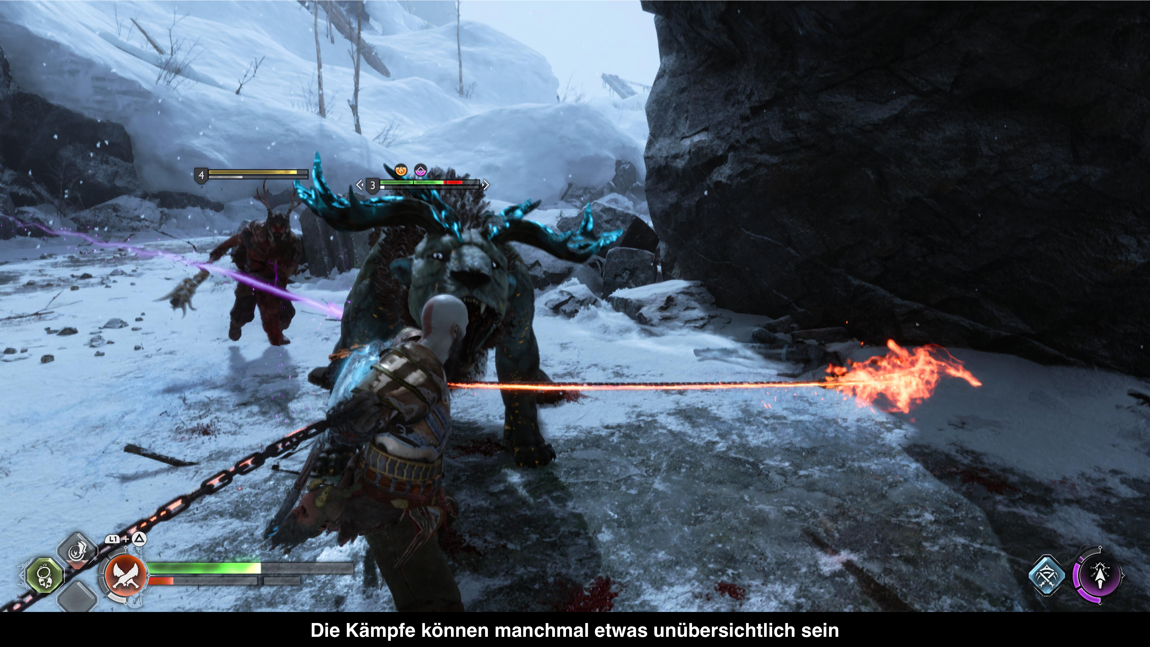 Im Vorgänger hat man viel Zeit in Midgard verbracht, was als Hub und eine Mini Open World zur Verfügung stand. Das ist immer noch der Fall in Midgard, aber man verbringt nun auch deutlich mehr Zeit in den anderen Welten und auch diese sind nun deutlich offener und bieten ein paar Nebenaufgaben. Ansonsten läuft man in diesen halbwegs offenen Gebieten trotzdem recht linear durch die Welt um der Geschichte zu folgen und darf kleinere, sehr simple Puzzle lösen, den Charakteren beim Quatschen zuhören und natürlich immer wieder gegen Gegner kämpfen. DIese tauchen meist in kleinen Arenen auf, die man meist betritt, indem man sich durch einen Spalt zwängt oder einen Stein zur Seite schiebt und dort dann erstmal gefangen ist, bis alle Gegner besiegt wurden. Das Kämpfen selbst erinnert an den Vorgänger und einige der Kombos kommen auch direkt aus dem Vorgänger. Neuerdings geht alles aber etwas leichter von der Hand und die Kämpfe sind auch deutlich vertikaler geworden. Denn Kratos kann sich jetzt problemlos auf Plattformen schwingen oder von oben auf Gegner springen. Auch die Gegner sind deutlich agiler geworden und treten auch in großer Zahl auf. Da die Kamera quasi am Rücken von Kratos klebt, kann das schon sehr frustrierend werden, wenn man keine wirkliche Übersicht im Kampf hat. Dadurch sind viele der Standardkämpfe oft fordernder als die meisten Bosse in der Geschichte. Denn wenn man im Eins gegen Eins ist, funktioniert der Kampf mit der engen Kamera deutlich besser und man ist nicht nur panisch am Ausweichen.