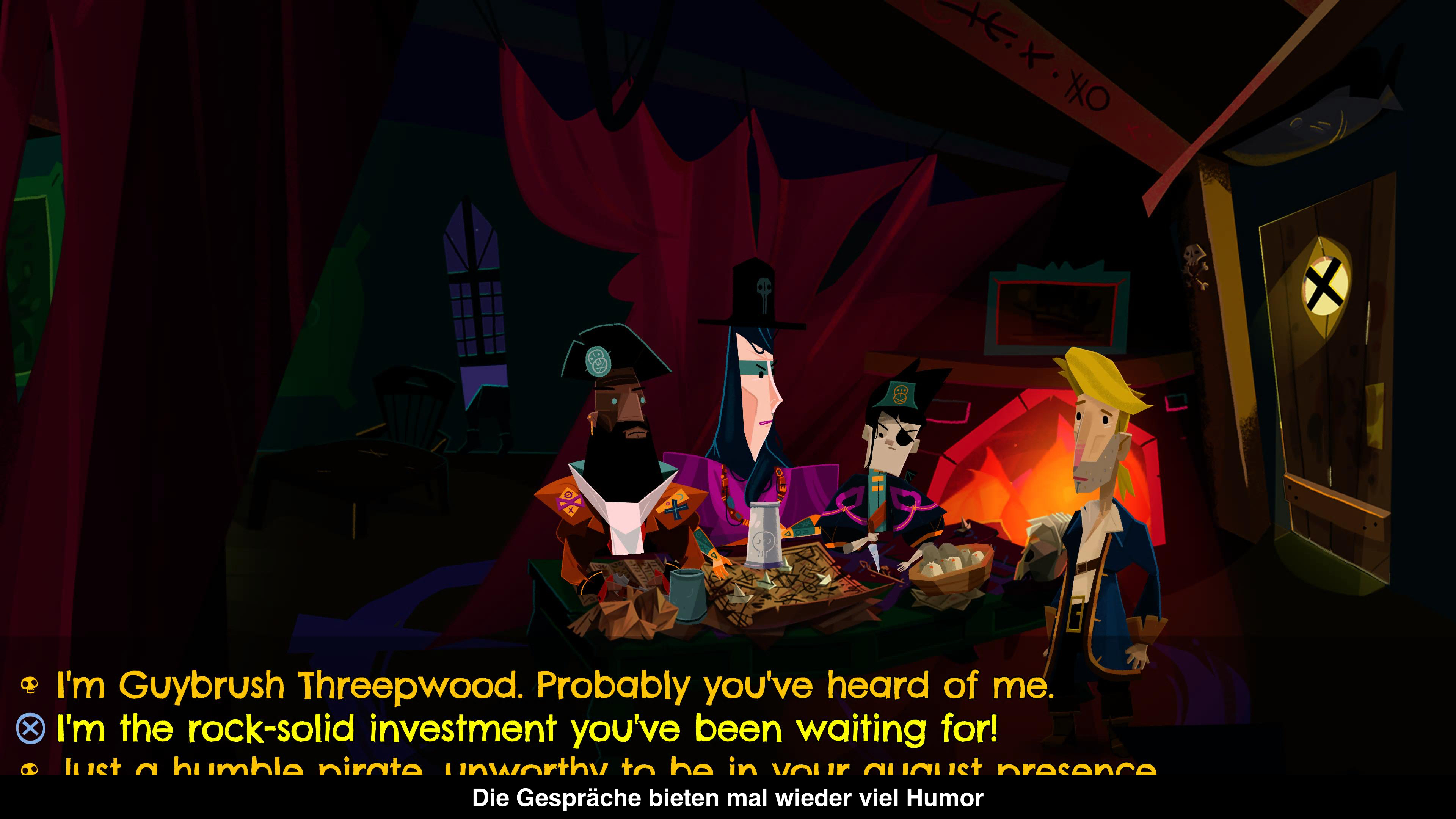Natürlich dreht sich die Geschichte in Return to Monkey Island um den Piraten Gubrush Threepwood. Dieser erzählt seinen Kindern eine vergangene Geschichte, in der er nach Monkey Island zurückgekehrt ist, um das Geheimnis der Insel zu lüften. Aber wie so oft steht ihm der böse Pirat LeChuck im Weg, der ebenfalls das Geheimnis lüften will. Im Laufe der Geschichte besucht ihr also viele bereits bekannte Orte und trefft auch bekannte Gesichter wieder. Diese sind wieder so skurril wie damals und der Humor der Serie ist in alter Stärke zurück. Zu fast keinem Zeitpunkt nimmt sich das Spiel wirklich ernst und sorgt so regelmäßig für Lacher. Mit ca. 3-5 Stunden Spielzeit gehört es auch zu den etwas kürzeren Spielen.