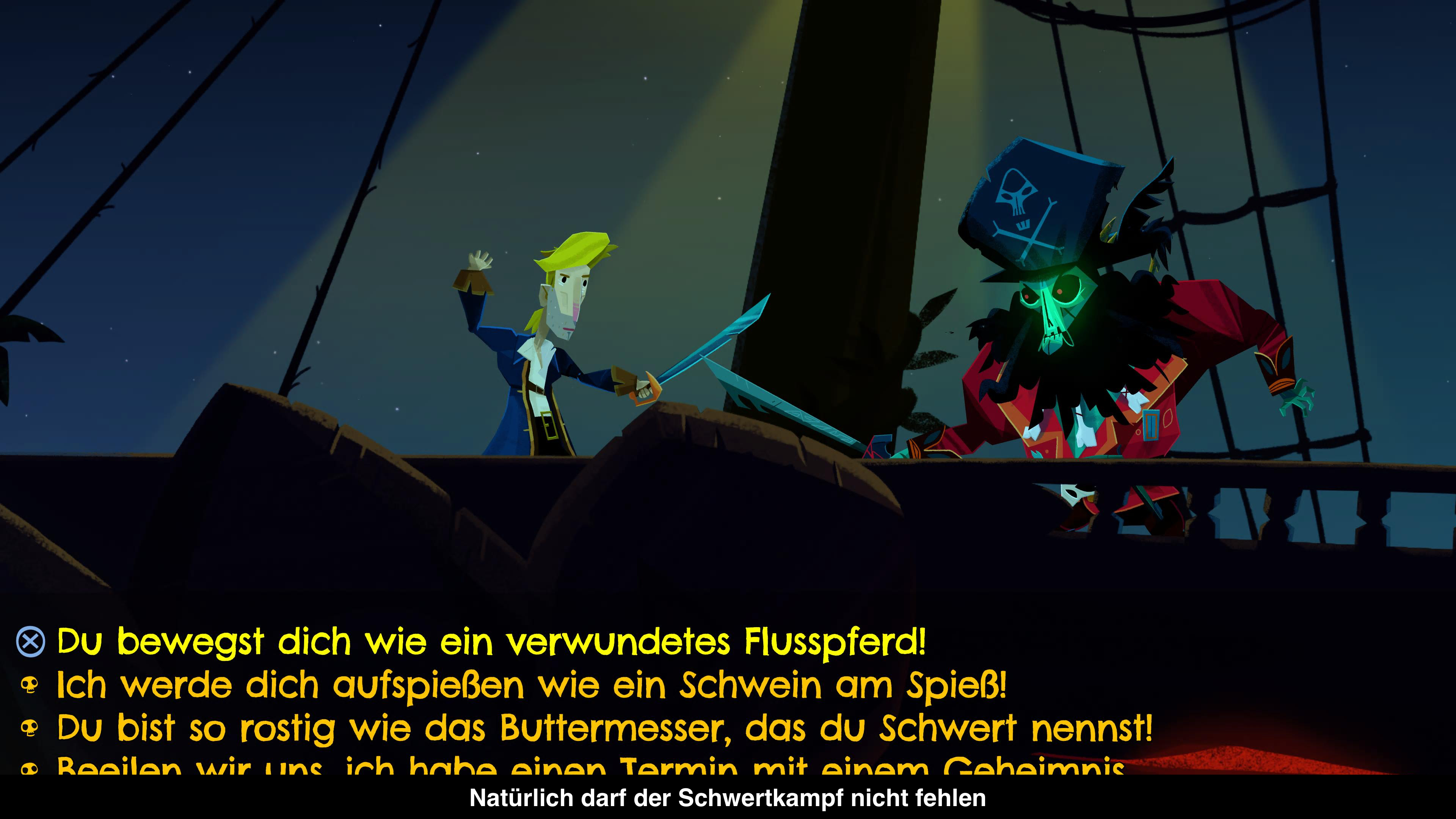 Point and Click Adventure profitieren immens von einer Maus zur Steuerung, weswegen man solche Spiele selten auf den Konsolen antrifft. Return to Monkey Island versucht dies aber mit einigen Kniffen zu umgehen. So steuert ihr die Figur mit dem Analogstick und anklickbare Objekte sind mit einem Kreis markiert und falls die Figur nicht richtig ausgerichtet ist, kann man immerhin mit der R1-Taste zwischen den Objekten hin- und herschalten. Das funktioniert ziemlich gut, außer die Objekte werden nicht hervorgehoben. Denn nur die Objekte in der Nähe des Charakters sind markiert und diese Erkennung funktioniert manchmal etwas fummelig. Ansonsten löst man natürlich konstant irgendwelche Rätsel, um z.B. Personen von eurem Anliegen zu überzeugen oder an bestimmte Objekte zu kommen. Der Schwierigkeitsgrad der Rätsel ist dabei angemessen und die meisten davon sind auch gut lösbar. Nur ganz selten steht man auf dem Schlauch bzw. ist des Rätsels Lösung etwas unkonventionell. Zum Glück gibt es dafür aber auch Tipps im Spiel, die ihr nach Belieben nutzen könnt, falls ihr mal stecken bleiben solltet. So kann das Spiel jeder beenden.