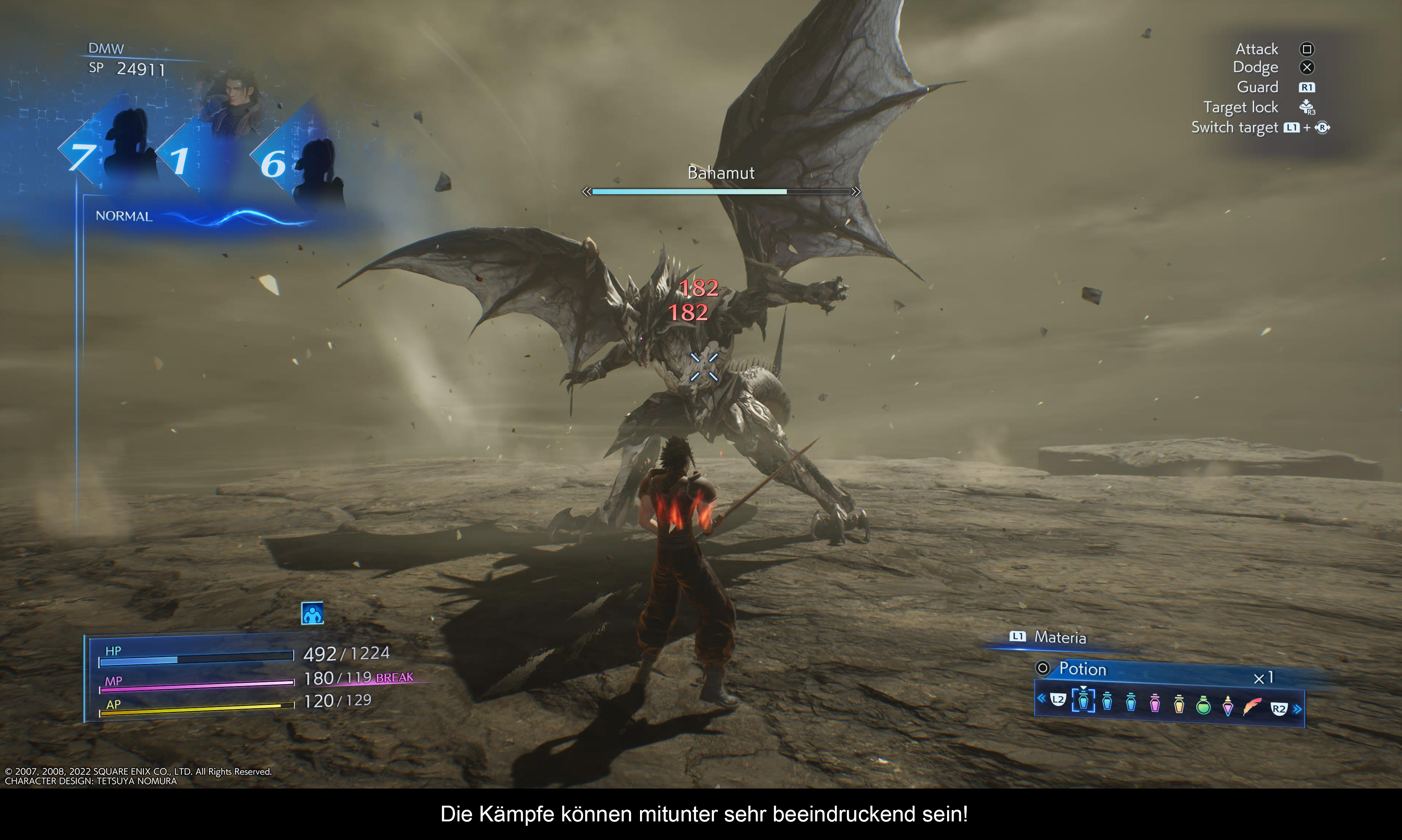 Neben der Story hat auch das Kampfsystem dazu beigetragen, dass Crisis Core in den Gedächtnissen vieler Spieler geblieben ist. Denn im Gegensatz zu zahlreichen anderen Final Fantasy Spielen seiner Zeit wirkt Crisis Core auch heute noch deutlich agiler und actionreicher. Zwar sind die Kämpfe nach wie vor Zufallsbasiert, aber einmal im Kampfbildschirm angekommen, kann Zack nicht nur frei herumlaufen, sondern mit simplen Tastenkombinationen auch verschiedene Attacken durchführen. Neben den standardmäßigen Schwertattacken kann man zum Beispiel auch noch brachiale Magie- und Kraft-Attacken ausführen, die wiederum MP- oder AP-Punkte für die Nutzung benötigen. An dem System gefällt mir unter anderem die Tatsache, dass man vorab selbst entscheiden kann, worauf man seinen Fokus setzen möchte. Und selbst wenn man mal auf einen Gegner stößt, der zum Beispiel resistent gegen Magie ist, kann man nach einem verlorenen Kampf stets sein Equipment komplett neugestalten und beispielsweise Materia und Ausrüstungsgegenstände anlegen, um den physischen Schaden zu erhöhen. Und wo wir schon beim Thema Materia sind: Materia - also aus Mako-Energie hergestellte Kugeln, die euch allerlei Fähigkeiten und Status-Upgrades zur Verfügung stellen - gibt es in Hülle und Fülle. Und im Gegensatz zum Original Final Fantasy VII könnt ihr diese nicht nur hochleveln, sondern später auch miteinander fusionieren, um zum Beispiel aus zwei starken Attacken eine mächtige Mega-Attacke zu formen. Gepaart mit der Möglichkeit, auch diverse Items in den Fusions-Mixer zu werfen, hat man tatsächlich ungemein viel Spielraum bei der Herstellung der Materia. Das System ist nicht allzu kompliziert und es macht enorm viel Spaß mit seinen Items herum zu tüfteln. Und neben dem actionreichen Kampfsystem und dem innovativen Materia-Mixer ist auch das DMV - also das Digital Mind Wave - ein wichtiger Bestandteil von Crisis Cores Gameplay. Dabei handelt es sich um ein kleines Roulette, welches am linken oberen Bildschirmrand dargestellt wird. Je nach Zacks Gefühlslage können mittels des Roulettes Erinnerungen an Freunde oder auch Beschwörungsmonster geweckt werden, mit deren Hilfe man dann mächtige und Bildschirm-füllende Spezialattacken (z.B. Limit Breaks) oder Statistik-Booster (z.B. unendlich MP oder AP) aktivieren kann. Alles in allem gehört das Kampfsystem von Crisis Core immer noch zu meinen Lieblingssystemen der Final Fantasy Reihe. Und ich frage mich, wie es wohl inzwischen aussehen würde, hätte Square Enix diesem System noch ein paar weitere Chancen gegeben.
