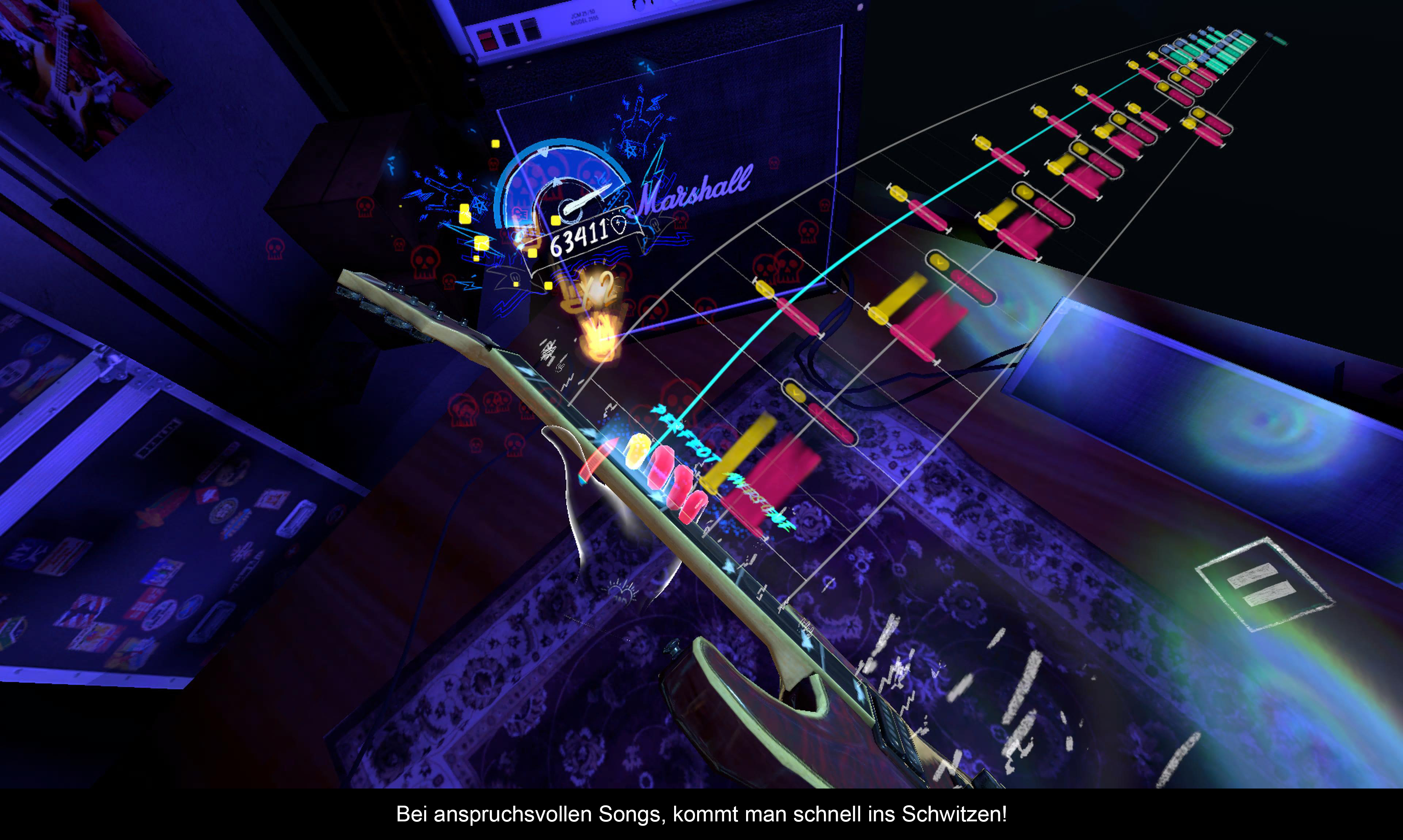 Ich habe viel Spaß mit Unplugged Air Guitar und ich schwanke sogar, was mir letztendlich besser gefällt. Guitar Hero, oder eben die Luftgitarren"simulation". Ich war sehr skeptisch, wie "echt" es sich anfühlen wird, im Nichts rumzuschrammeln. Doch die Gitarre wurde so gekonnt fixiert, dass ich einen Plastikcontroller nicht vermisst habe. Klar, mit einem Gitarrencontroller spielt man präziser, was aber nicht gleichzeitig spaßiger bedeuten muss. Man kann die Gitarre hochreißen vor und zurückdrücken, ohne dass das Tracking spinnt. Das Fingertracking funktioniert ebenfalls sehr gut, wenngleich ich ab und an einen kleinen Krampf im Handgelenk bekomme, wenn man dieses drehen muss um umzugreifen. Technisch und von der Inszenierung her, kommt Unplugged Air Guitar leider sehr dürftig daher. Auf der Bühne gibt es nichts zu sehen und die Locations sind düster, was wohl auch mit der dürftigen Technik der Quest VR Brille der Konkurrenz zu tun hat. Die originalen Songs klingen technisch sehr gut, doch leider ist soundtechnisch sonst nicht viel los. Hier und da jubelt und grölt Mal jemand, aber es wäre auch deutlich mehr drin gewesen. Auch gibt es keine richtige Kampagne, wo man von Stadt zu Stadt tingelt und immer bekannter wird. Hier merkt man deutlich, dass es sich um einen Nischentitel auf einer Nischenplattform handelt. Dennoch schrammelt man immer wieder gern die über 40 lizenzierten Songs (keine Coverversionen und dem Preis entsprechend genug Songs) hoch und runter. Man sollte aber unbedingt auf mindestens Normal spielen, da es auf Easy schnell eintönig und zu einfach wird. Klar, man schafft dann zwar jeden Song, der Spaß bleibt aber etwas auf der Strecke. Als Partyspiel ist Unplugged Air Guitar ebenfalls nur bedingt geeignet, da man durch die PSVR2 zum einen zu sehr abgeschottet ist, zum anderen es technisch bedingt keinen Zwei-Spieler Modus gibt.