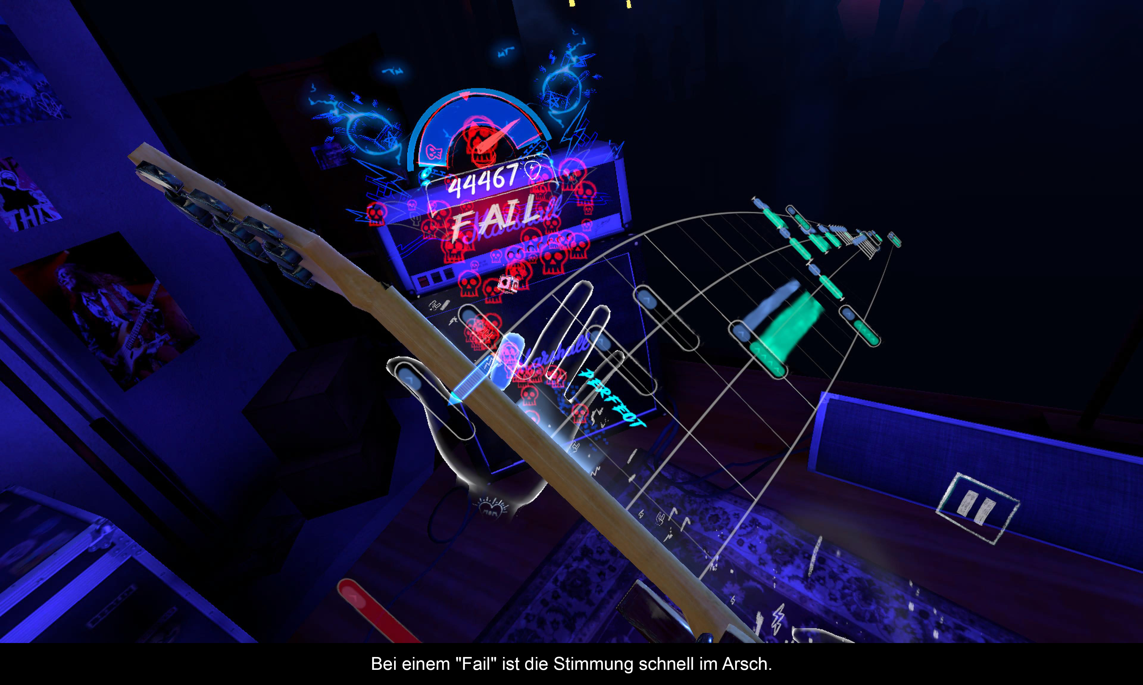 Los ging's dann in einer kleinen Spelunke, wo ich ein paar einfache Songs zum Besten gab. Die anfangs einfachen Griffe gingen gut von der Hand, wenngleich ich stets auf den Gitarrenhals schauen musste, um alle Noten ordentlich zu treffen. Vier Finger, ein Finger, drei Finger und dass über den ganzen Gitarrenhals… puh… da komm ich als alter Sack bei den drei Griffen schon etwas ins Schwitzen. Richtig schwitzig wurde es schließlich in den weiteren Locations, wo ich bei komplexeren Songs noch umgreifen durfte und plötzlich sechs Griffe beherrschen musste. Das Solo von "Free Bird" spielt sich halt nicht von alleine. Aber es ist schon echt cool, wieder auf der Bühne zu stehen, auch wenn es nur eine kleine ist. Das Anschlagen der Töne geht super von der Hand, während die andere Hand gekonnt den Gitarrenhals hoch und runter tanzt. Da ich nicht im Studio stehe, muss auch nicht jeder Griff perfekt sitzen, solange ich die benötigten Finger einsetze. Wenn ich besonders geil im Flow war, flogen wie in guten alten Zeiten sogar BHs auf die Bühne. Hach ja, hat mir das gefehlt! Für etwas mehr Finesse kann man einige Töne auch ein bisschen ziehen oder einen drauf los schrammeln. Zum Angeben ganz cool. Leider geht das Publikum aber nicht steil, wenn ich die Gitarre hochziehe und da meine Whammy Bar defekt ist, kann ich hier auch nicht gerade Akzente setzen. Na ja, in meinem Alter habe ich schon genug damit zu tun, die allgemeinen Töne zu treffen.