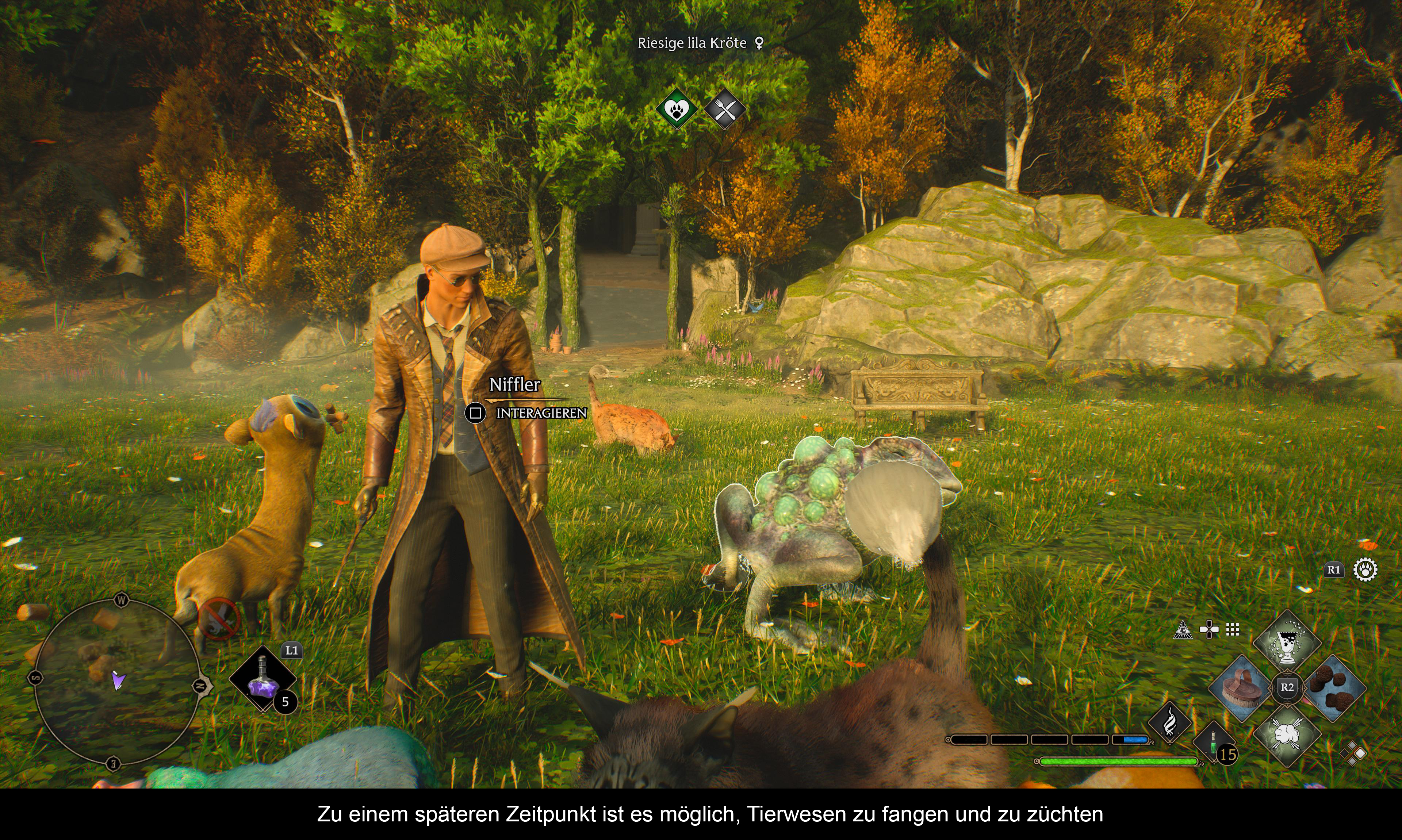 Abgesehen davon findet man aber auch deutlich neuere Elemente im Spieldesign. Für die Spielfigur gibt es zahlreiche Kleidungsstücke, welche über unterschiedliche Attribute verfügen und auch das Aussehen deutlich ändern. Auch existiert eine Transmog Funktion. Sprich man kann jederzeit die getragene Kleidung optisch durch eine andere ersetzen und behält dabei die Werte. Früh schaltet man auch den Raum der Wünsche frei, wo man selbst Zutaten für Zaubertränke anbaut und diese mischt, aber auch die zahlreichen Tierwesen finden dort ein neues Zuhause. In der Spielwelt lassen sich elf verschiedene phantastische Tierwesen einfangen, wie Thestrhrale oder das Knuddelmuff. Wer will darf sie auch züchten und hoffen, dass dabei ein „Shiny“ rauskommt. Ähnlich wie beim Rest des Spieles ist auch in dieses Feature viel Liebe hineingeflossen, wovon die letzten beiden „Phantastischen Tierwesen“ Filme ja nur träumen können.