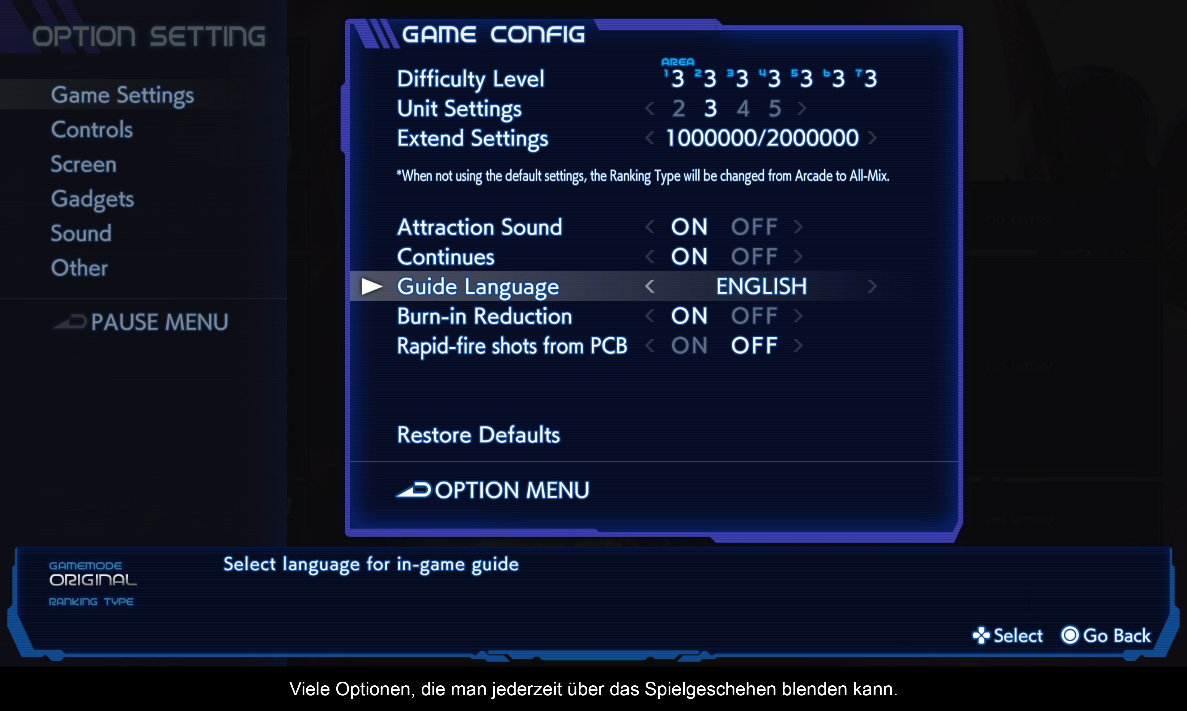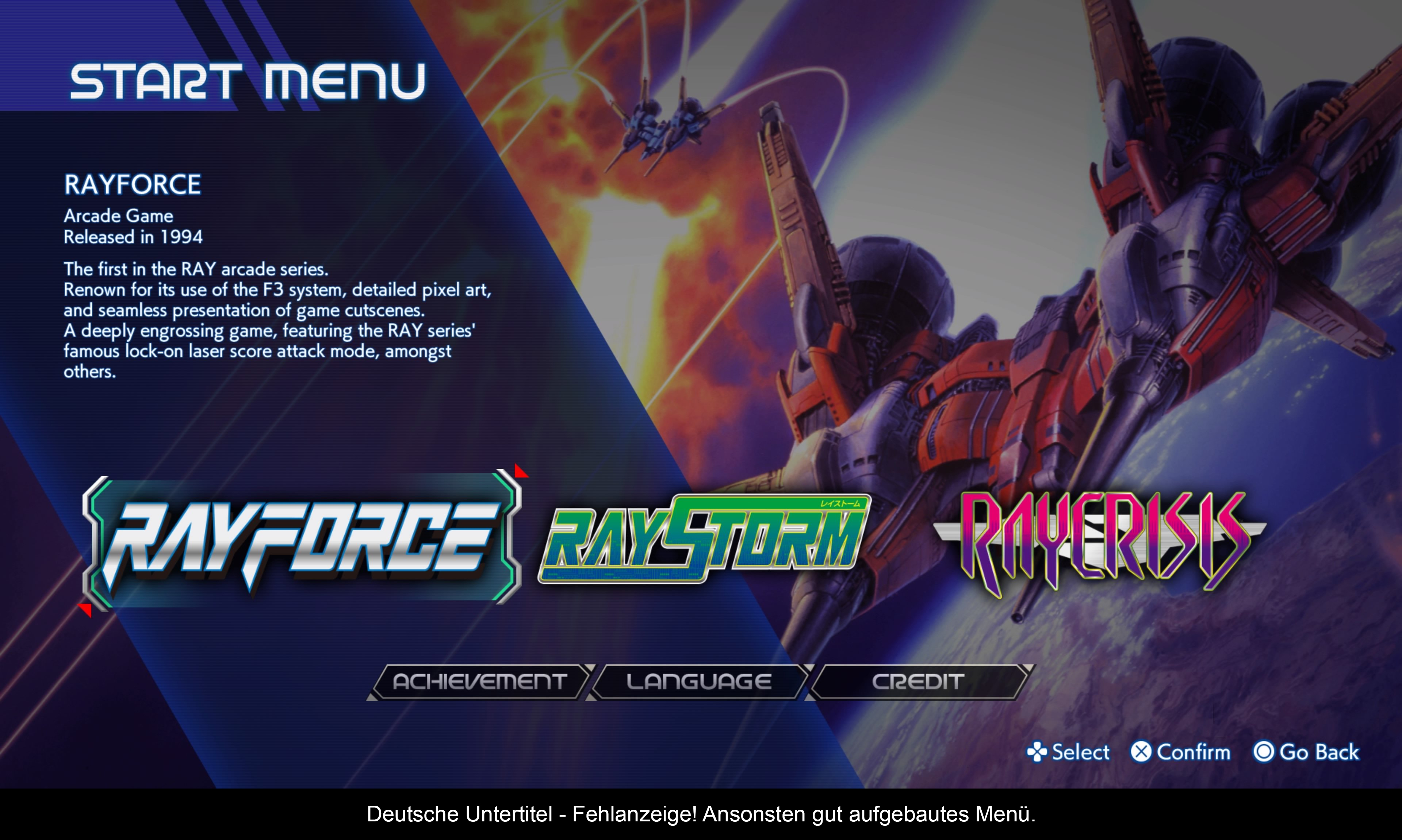 Im Startmenü kann man direkt zwischen den drei Spielen wählen. Bei „RayStorm“ und „RayCrisis“ kann man in einem Untermenü auch noch optional die aufpolierten HD Remaster Fassungen starten. Für jedes Spiel können eigene Spielstände angelegt werden, außerdem kann die Steuerung komplett angepasst werden. Von den drei vorgeschlagenen Layouts hat mir persönlich kein einziges zugesagt. Aber wie bereits erwähnt, kann man jede Taste mit einer Aktion ganz nach dem eignen Geschmack ausstatten.