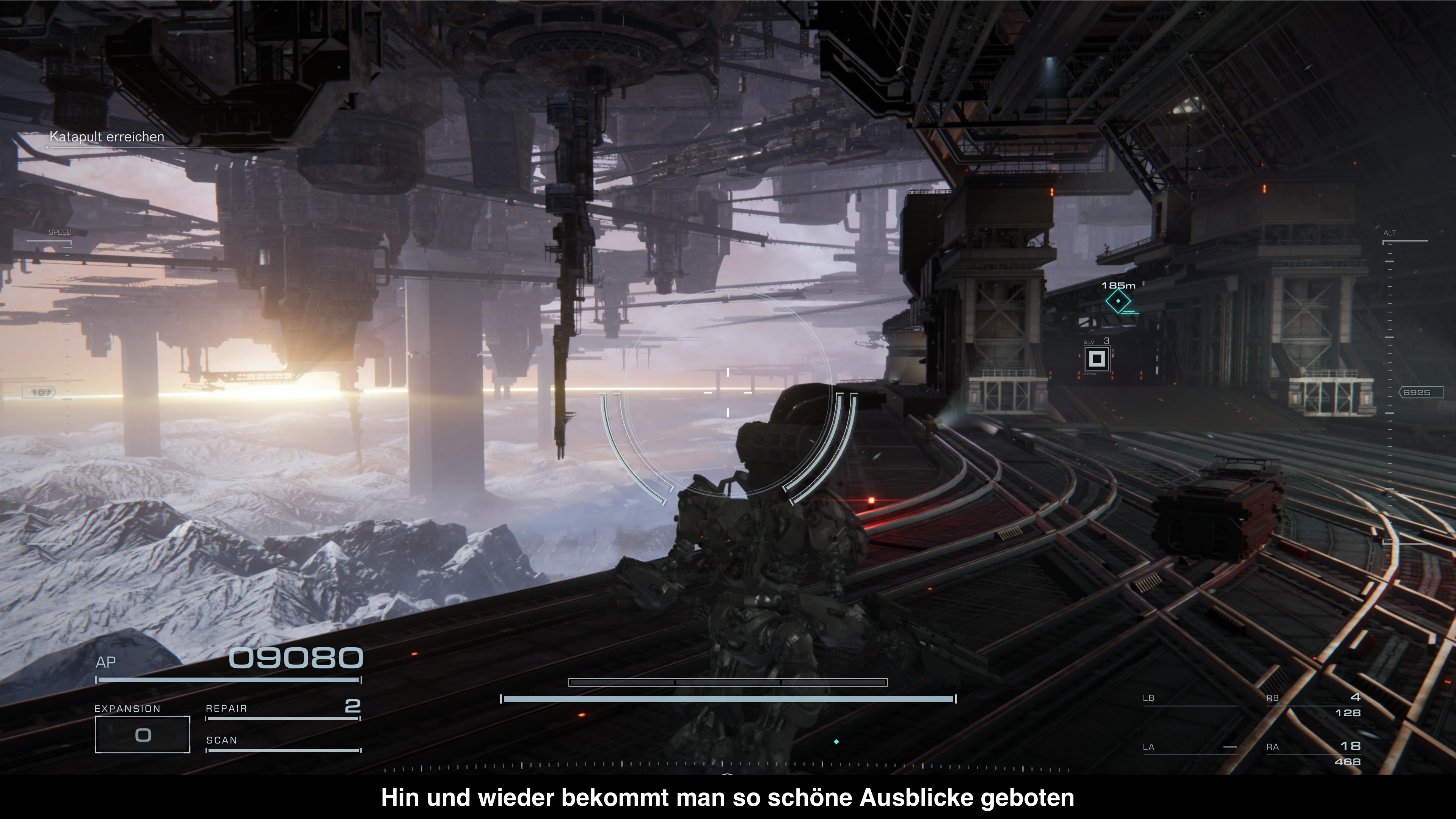 Grafisch ändert auch Armored Core VI nichts an der Tatsache, dass From Software Spiele nicht unbedingt zur technischen Speerspitze gehören. So sieht Armored Core VI nicht schlecht aus, haut aber auch niemanden vom Hocker. Die Welten sind recht karg, bieten meist nur simple Geometrie und wirken nur bedingt einladend. Sie passen aber natürlich zum generellen Setting des Spiels. Schlimmer ist da schon die technische Umsetzung. So bietet das Spiel insgesamt drei Grafikmodi, einen Qualitätsmodus, einen Qualitätsmodus mit Raytracing und einen Performance Modus. Der Performance Modus bietet eine dynamische Auflösung und visiert 60 Bilder pro Sekunde an. Die erreicht das Spiel meistens auch, aber leider nicht immer. Immer wieder gibt es Einbrüche der Bildrate in den 40-50FPS Bereich, die das flotte Spielgeschehen einfach stören. Selbst mit einem VRR Bildschirm wird man manche der Ruckler merken. Der Qualitätsmodus macht das alles nur schlimmer, denn die Auflösung wird auf 4k festgesetzt und statt die Bildrate auf 30FPS zu begrenzen, läuft das Spiel meist knapp darüber, was zu einer sehr inkonsistenten Erfahrung führt. Raytracing dazu zu schalten ändert daran nix, denn das ist nicht im Gameplay verfügbar. Raytracing-Effekte sind nur im Menü bei der Ansicht des Armored Core erkennbar, aber nicht unbedingt der Rede wert. Es ist auch etwas unverständlich, warum man diese nicht auch mit dem Performance Modus nutzen kann, wenn das Gameplay davon unberührt bleibt. So wirklich rund läuft somit kein einziger Modus.