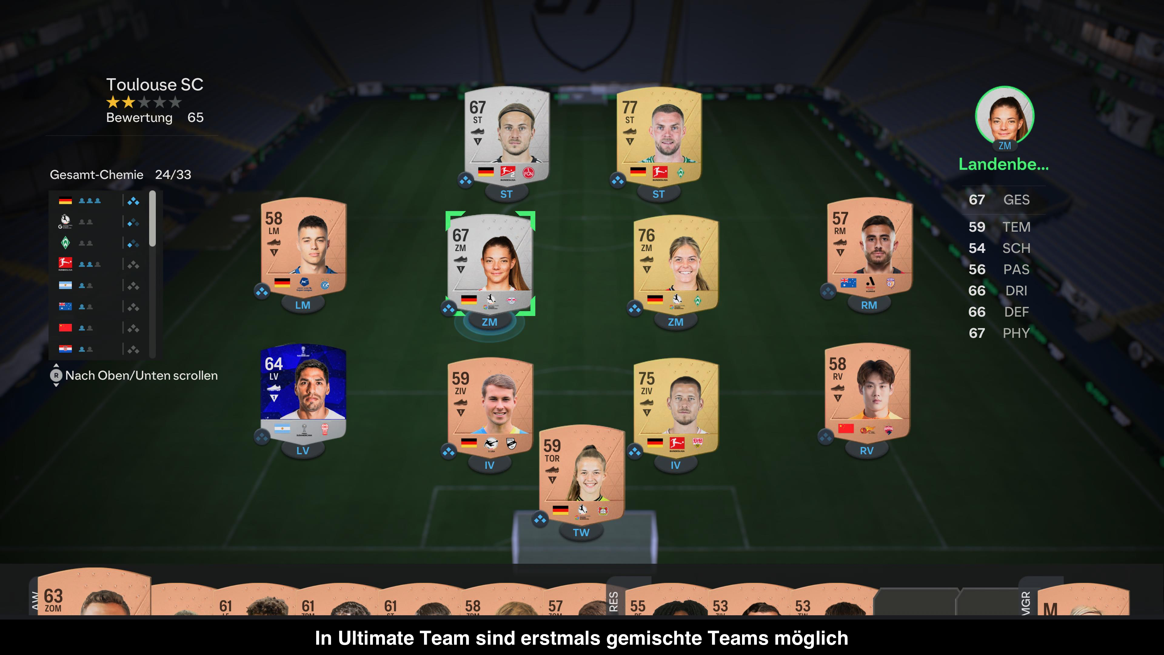 Eine weitere große Änderung betrifft Ultimate Team. Denn erstmals in der Geschichte der Serie ist es möglich, sein Team nicht nur mit Männern zu befüllen, sondern auch mit Frauen. Dabei sind sogar gemischte Teams möglich. Das ermöglicht natürlich völlig neue Kombinationen, ist aber sicherlich auch etwas merkwürdig, wenn dann Brecher wie Süle gegen eher zierliche Frauen antreten. Tatsächlich kommen die Frauen auch gut an und sind öfters online anzutreffen. Ansonsten gibt es diverse kleinere Änderungen im Karrieremodus oder auch an der Menüstruktur. Die großen Kacheln der letzten Jahre müssen klassischen Menüs weichen, die aber nicht immer übersichtlicher ausfallen. Insbesondere das Ultimate Team Menü ist unübersichtlich und chaotisch.